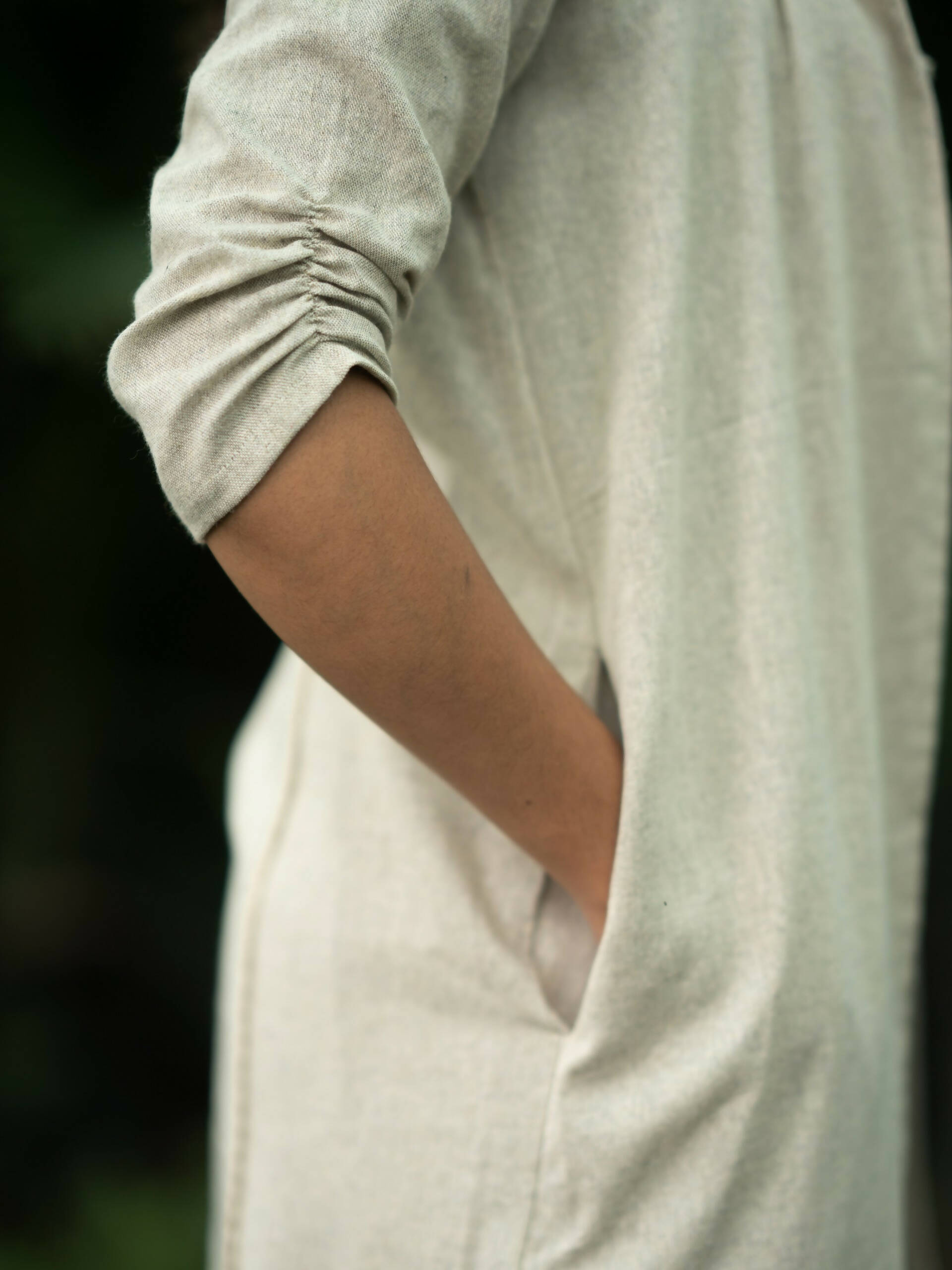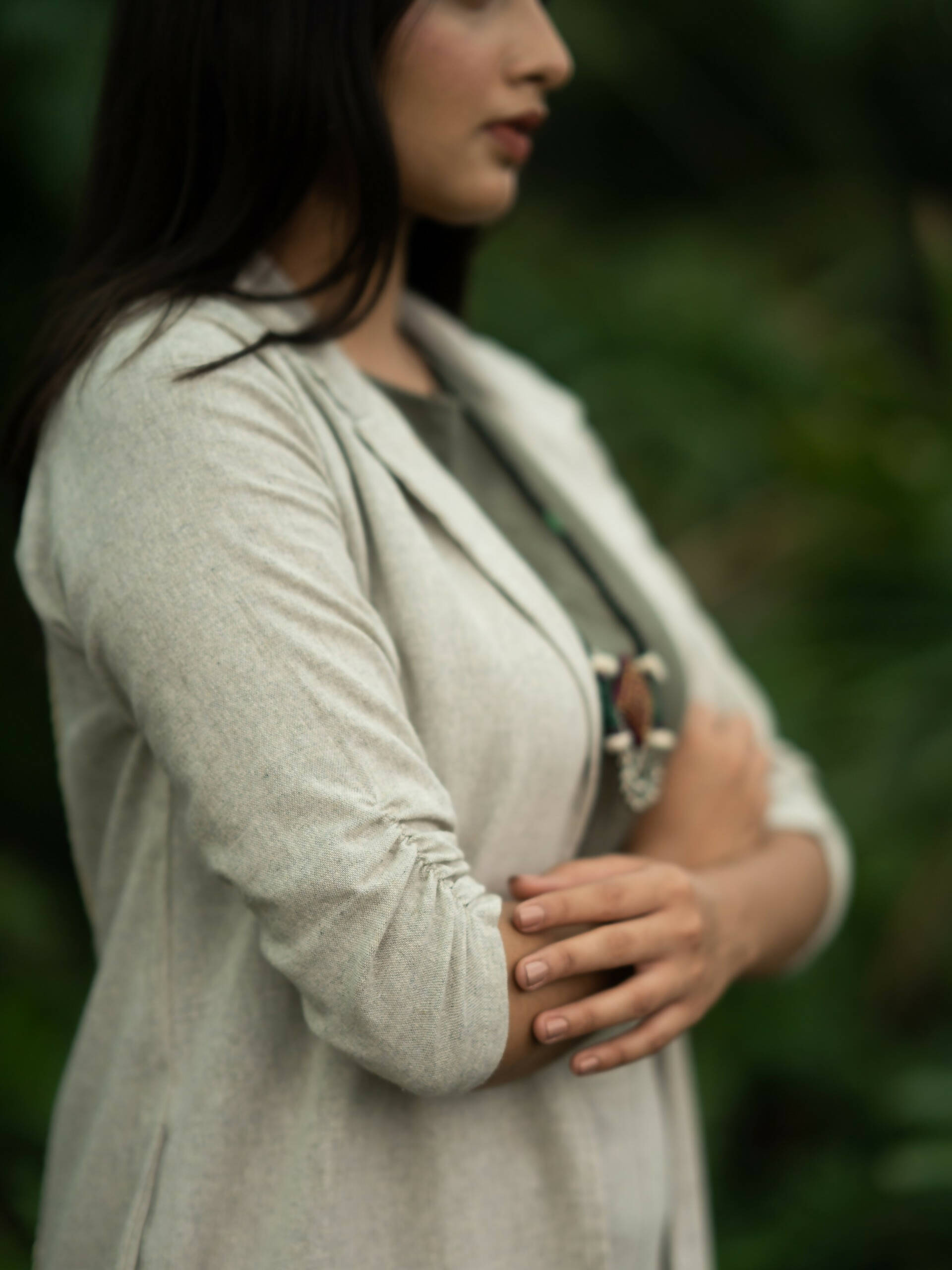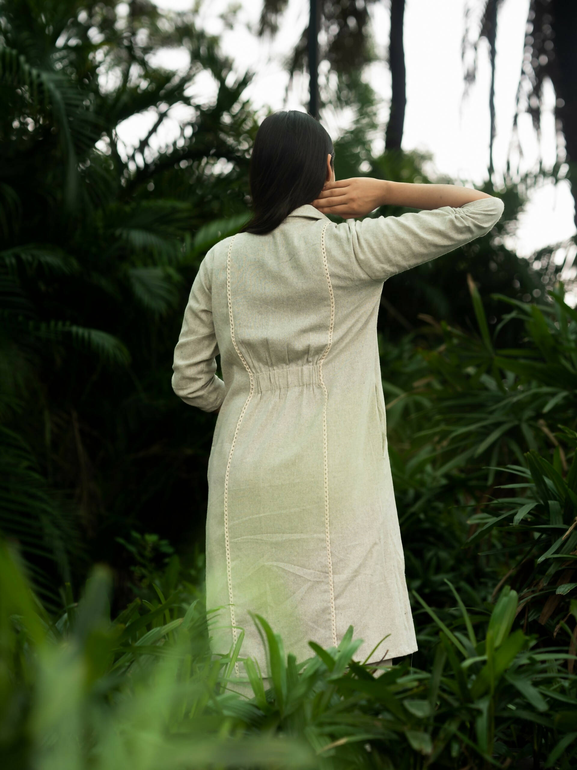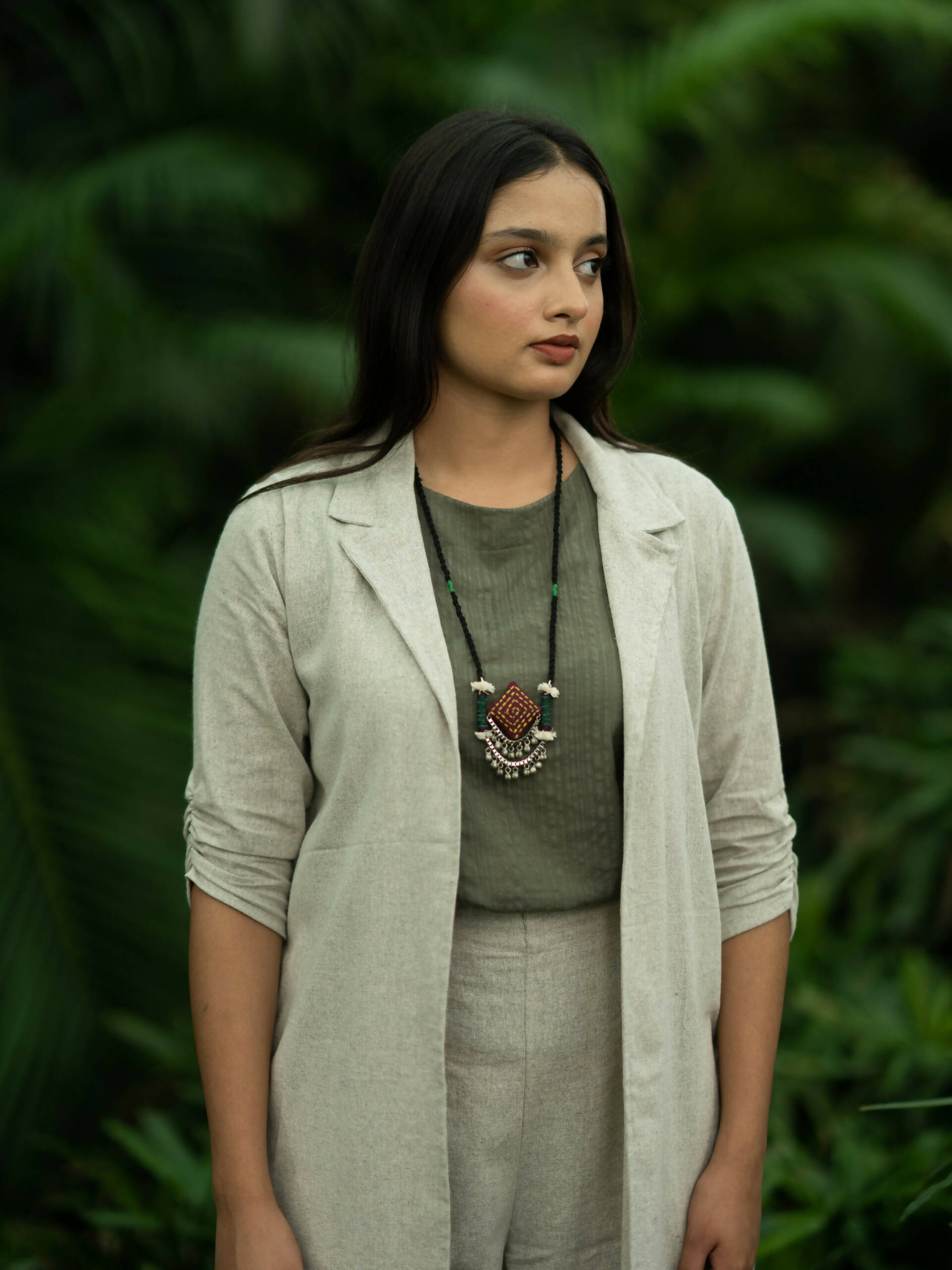 Off-White Greyish colored Overgarment with notch collar. Overgarment has back paneling with lace detail. Paired with coordinated Palazzos. It’s a 2pc set. Overgarment with Palazzos.