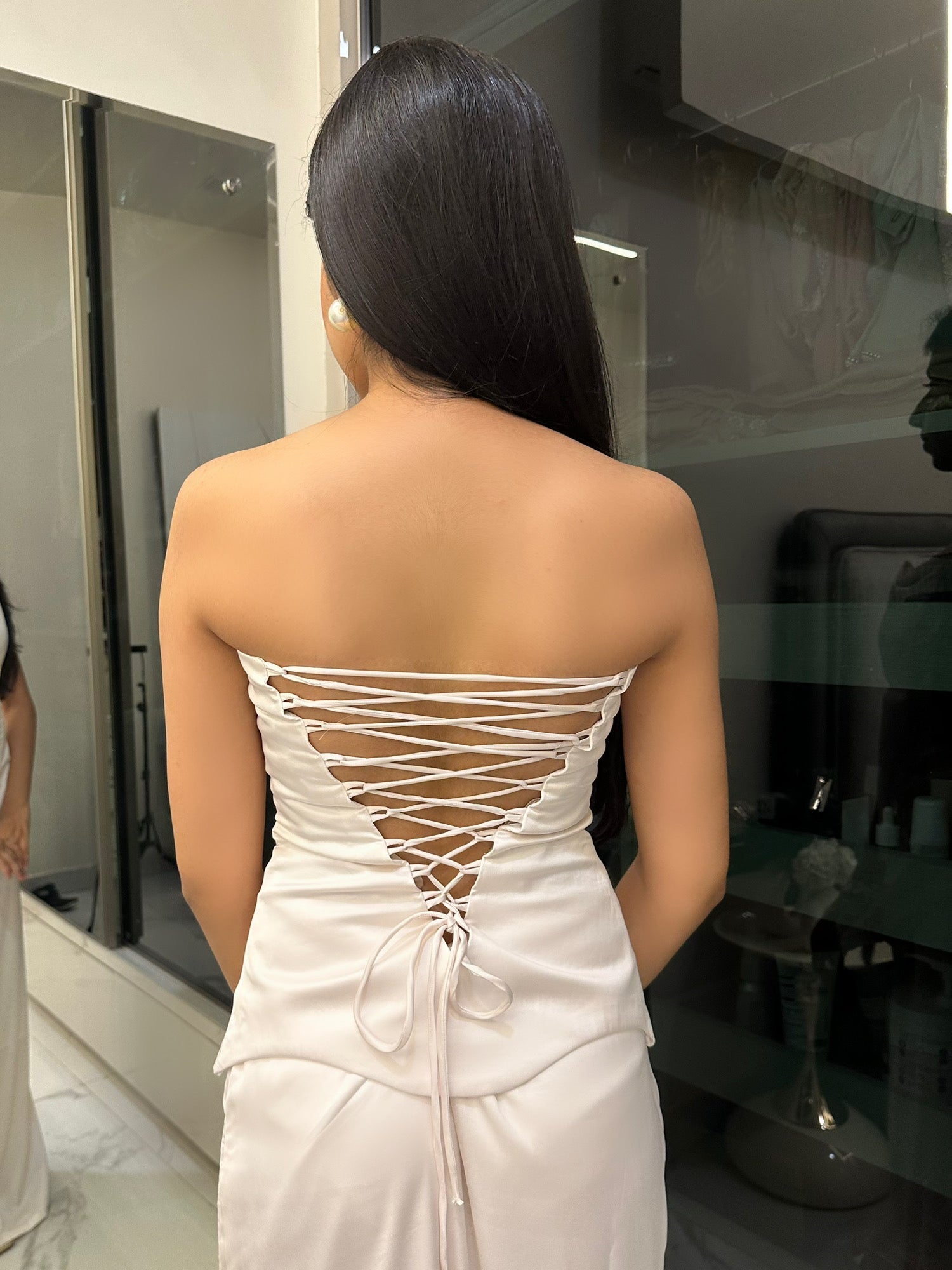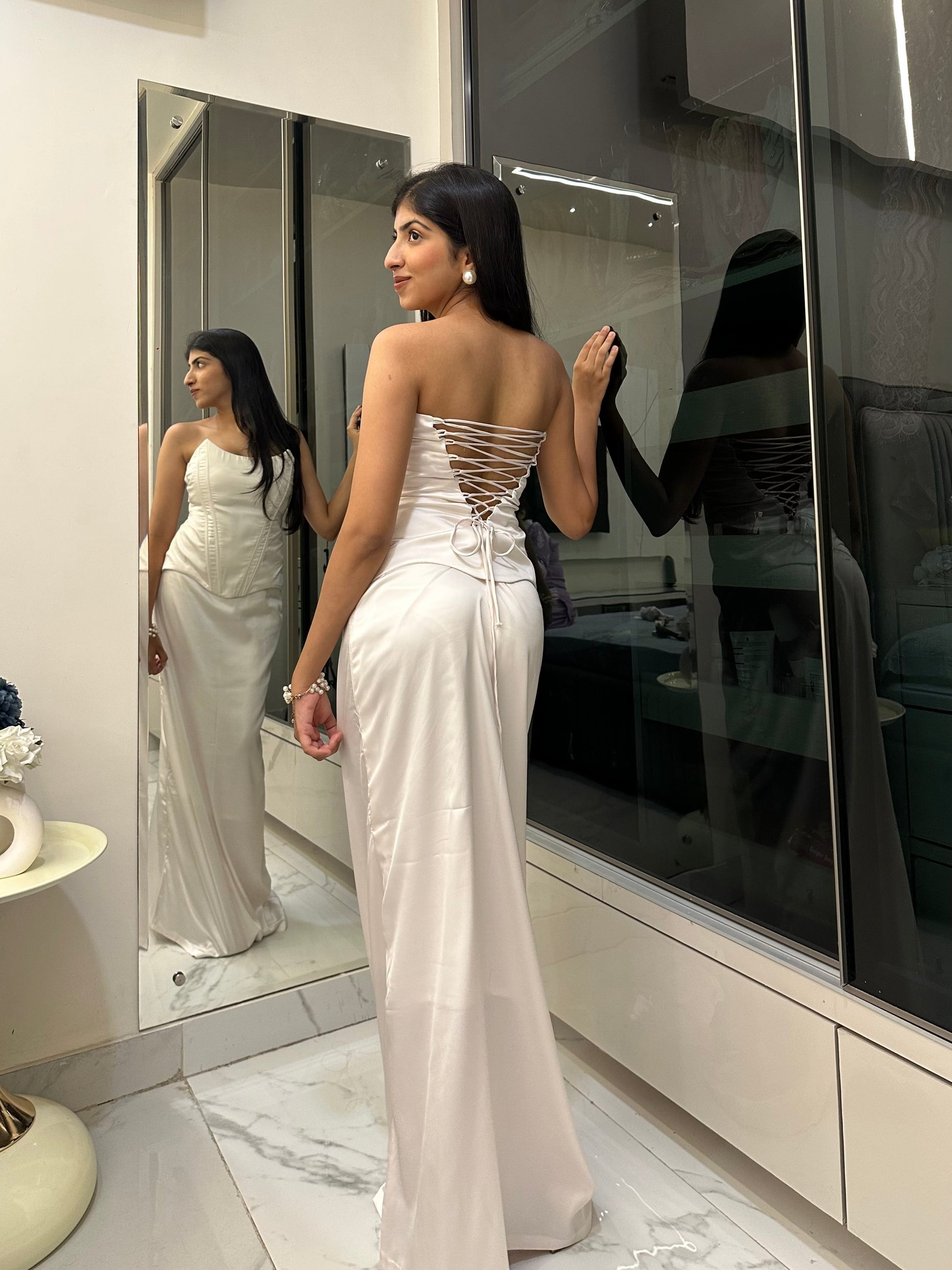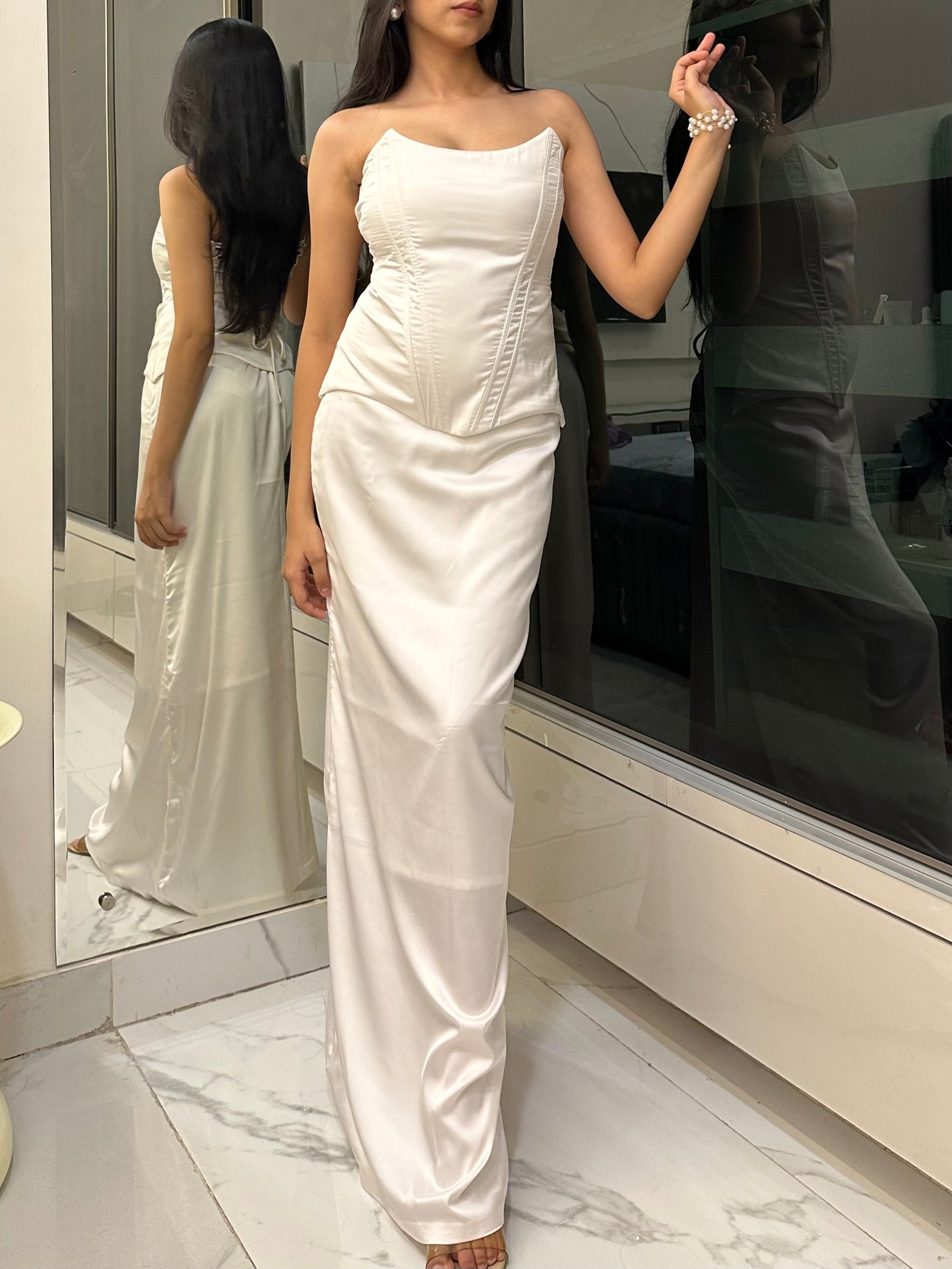 Turn heads in the Monica Royal Satin Corset Set — a stunning blend of structure and fluidity designed to celebrate your silhouette. Crafted in luxe satin with a soft sheen, the set features a sculpted corset top with defined paneling and a flattering neckline, paired with a sleek, floor-grazing skirt for an effortlessly elegant look.