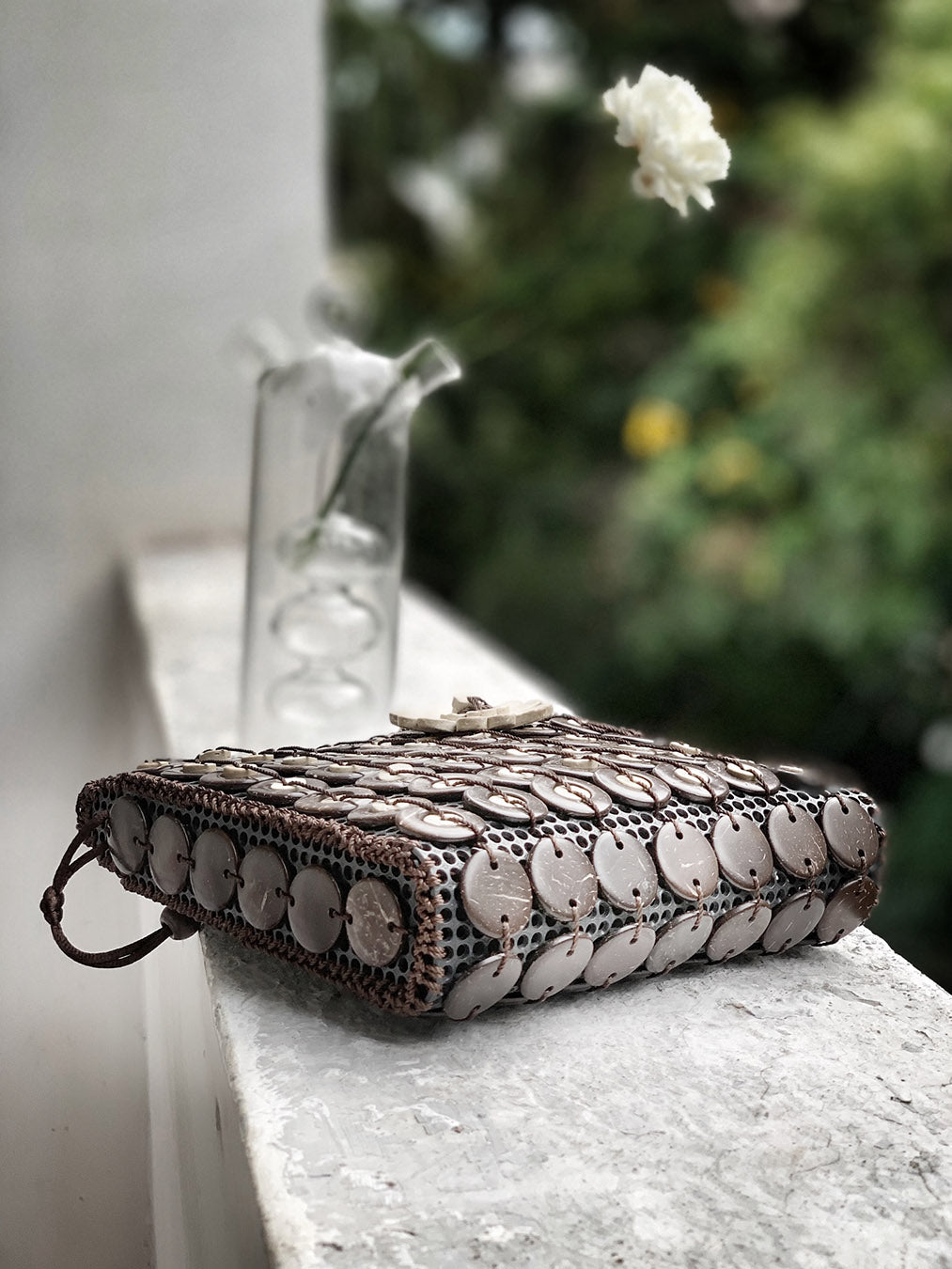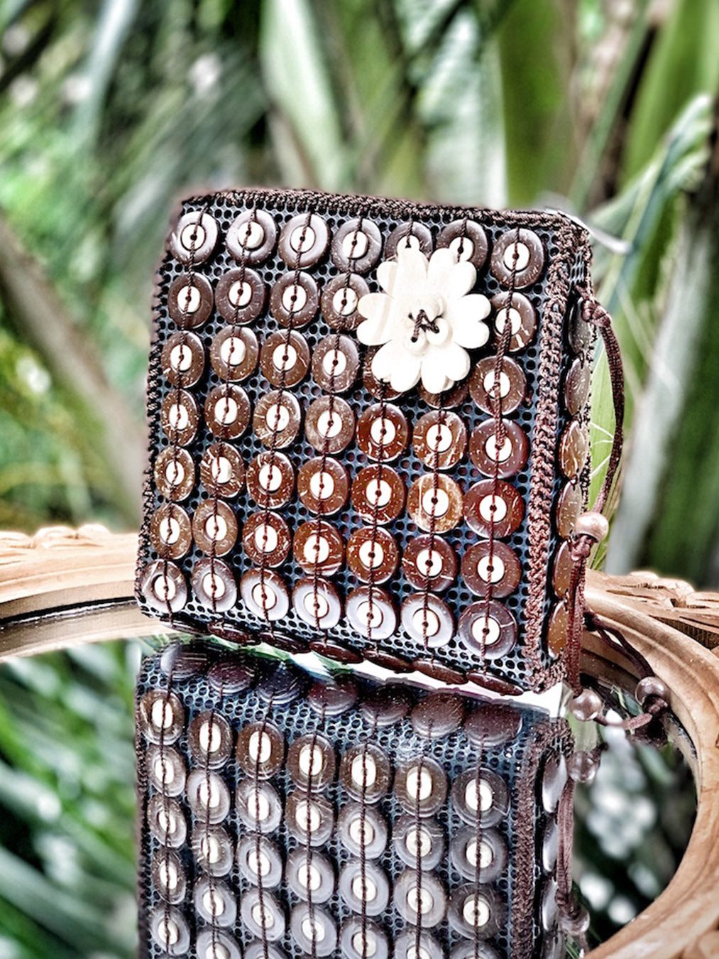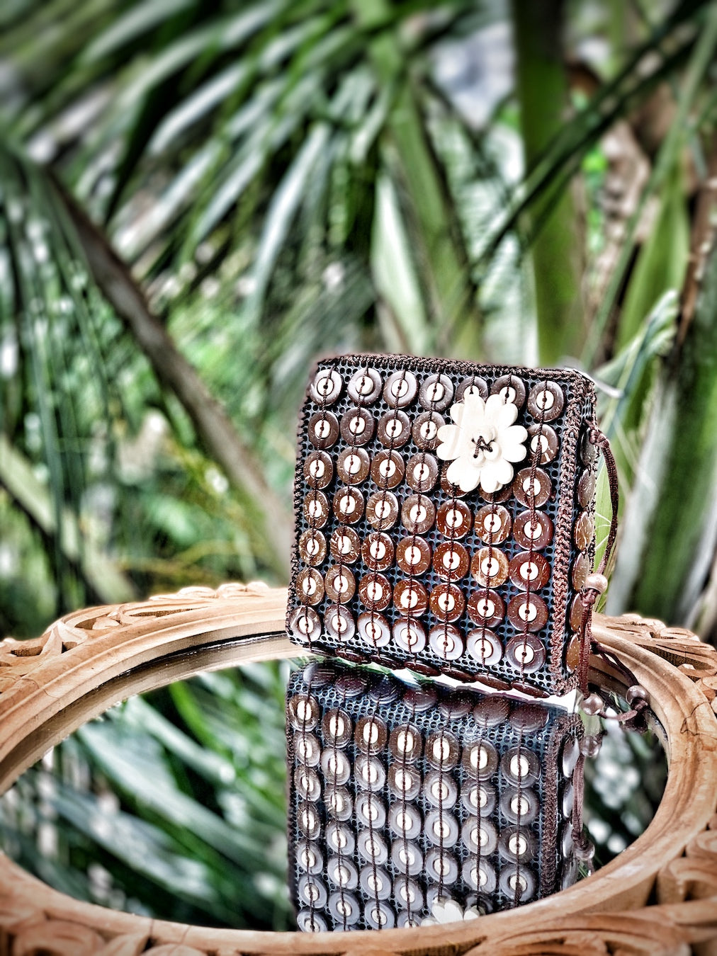 Natural coconut shells beautifully handcrafted into different shapes and sizes... floral motifs, ditsy buttons, discs and cubes. Hand stitched on recycled PU mesh with Korean silk seams and strap.