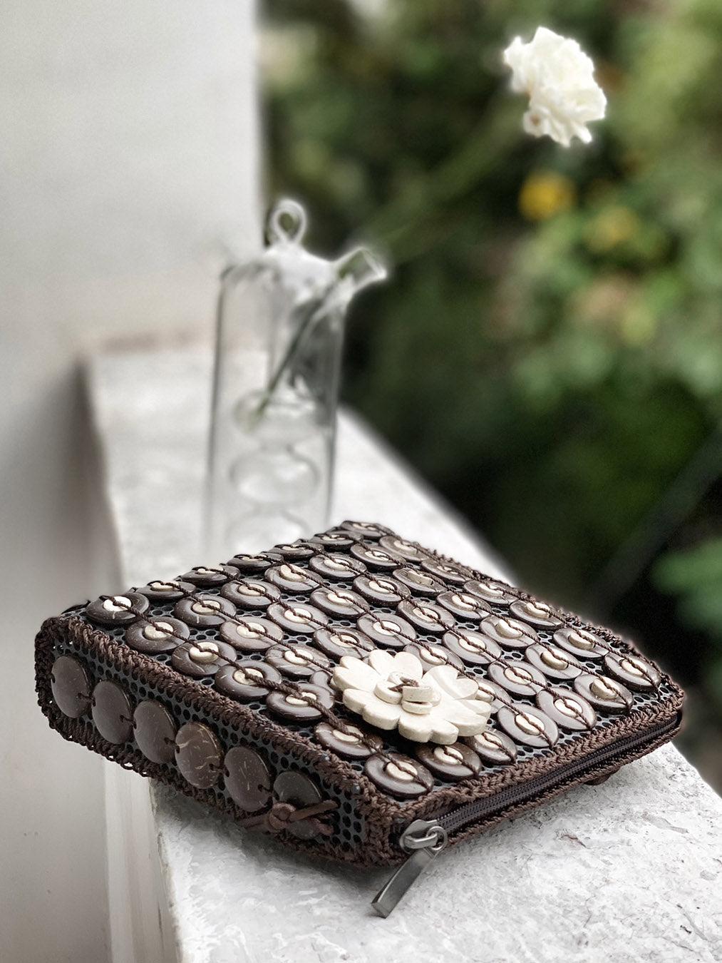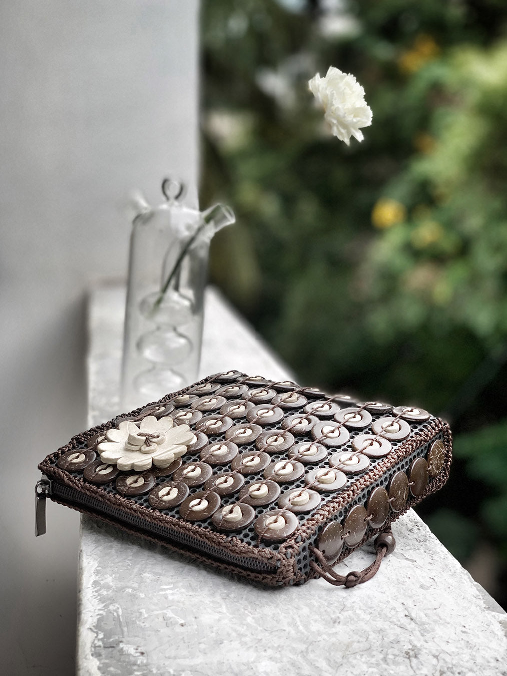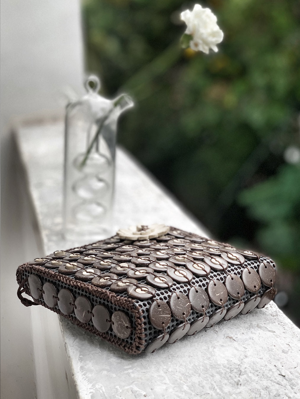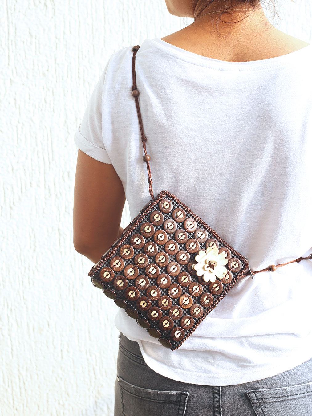 Natural coconut shells beautifully handcrafted into different shapes and sizes... floral motifs, ditsy buttons, discs and cubes. Hand stitched on recycled PU mesh with Korean silk seams and strap.