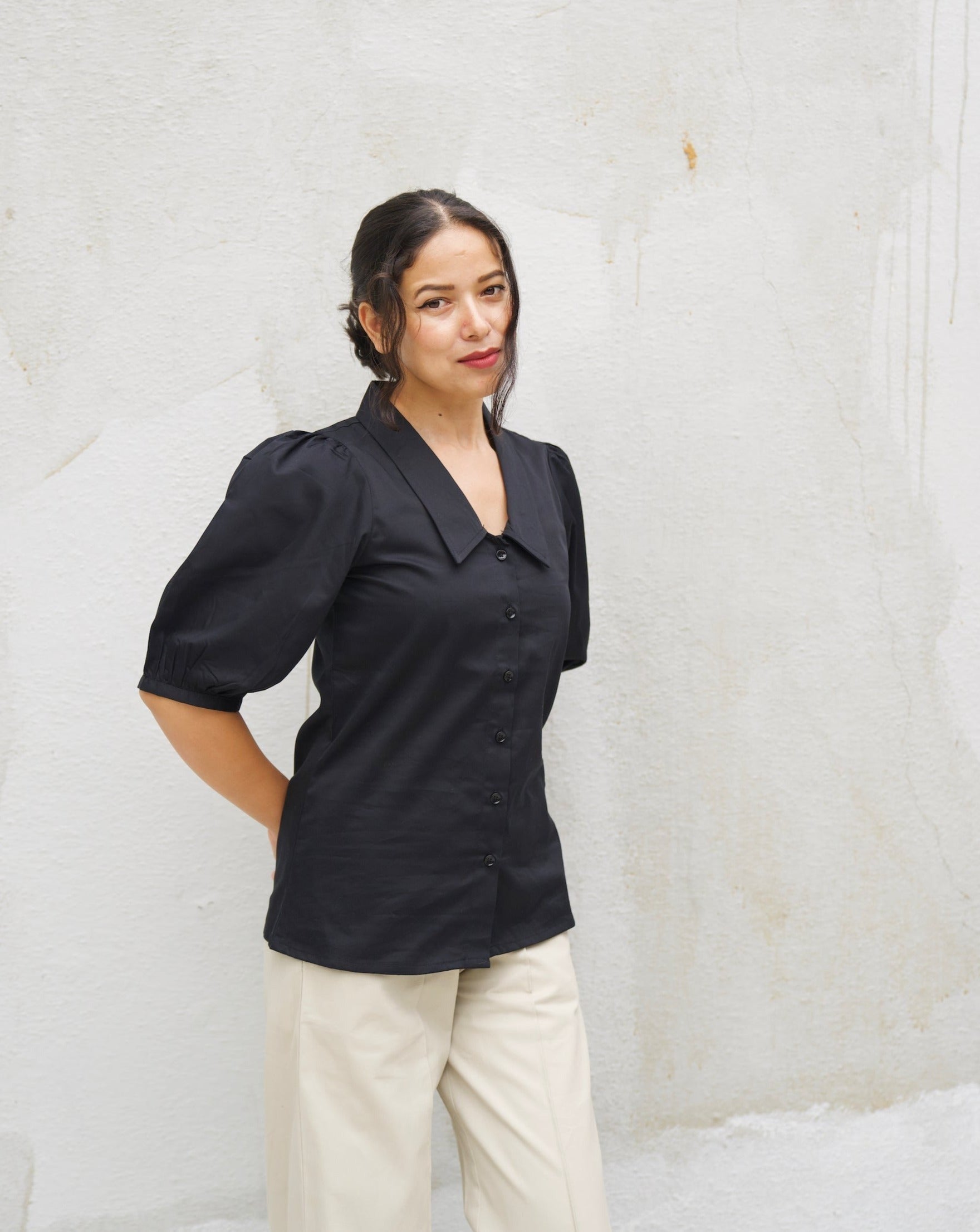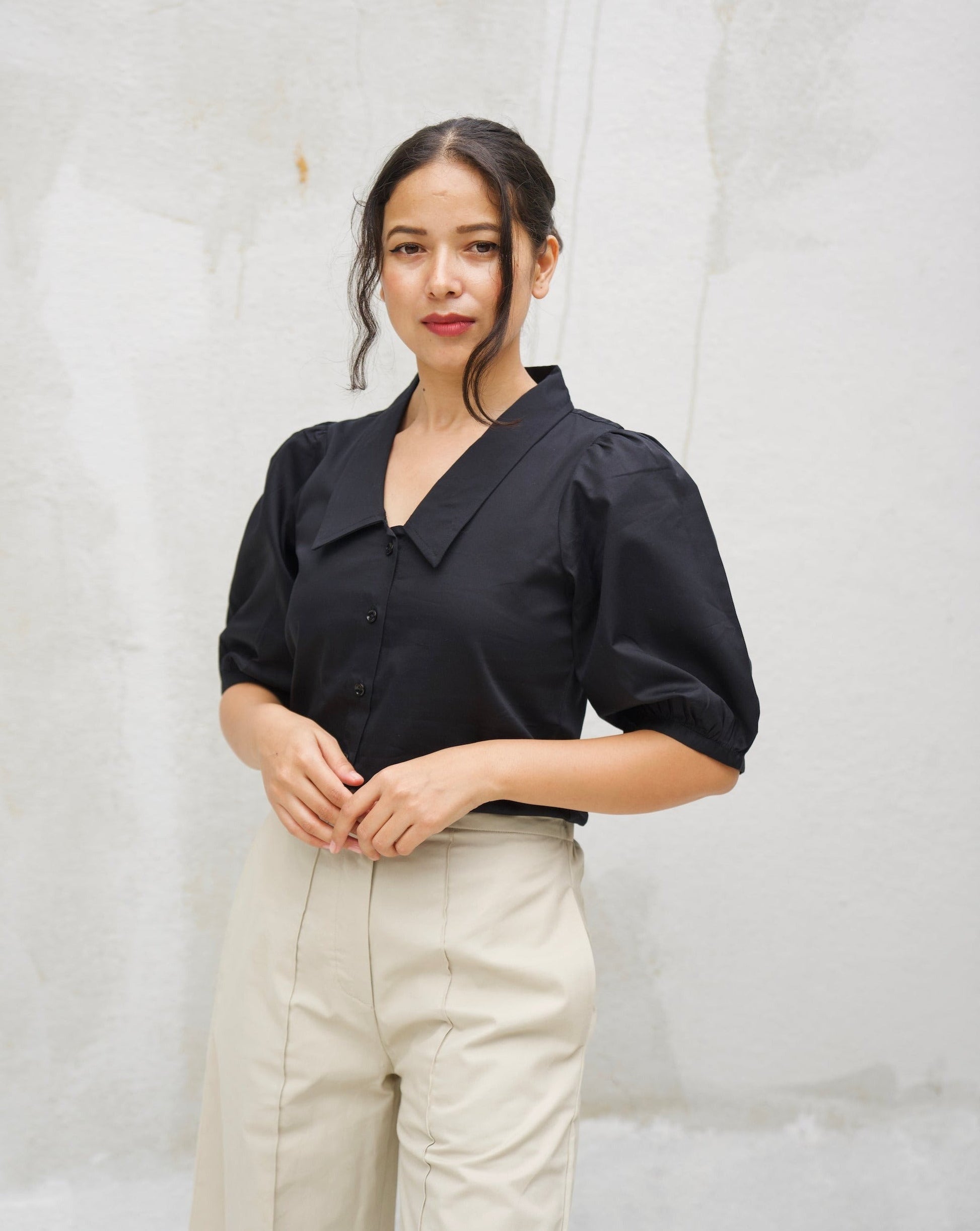 Style Tip: Pairing the shirt with our Flared Pants, a black handbag and minimal accessories will create a power look.