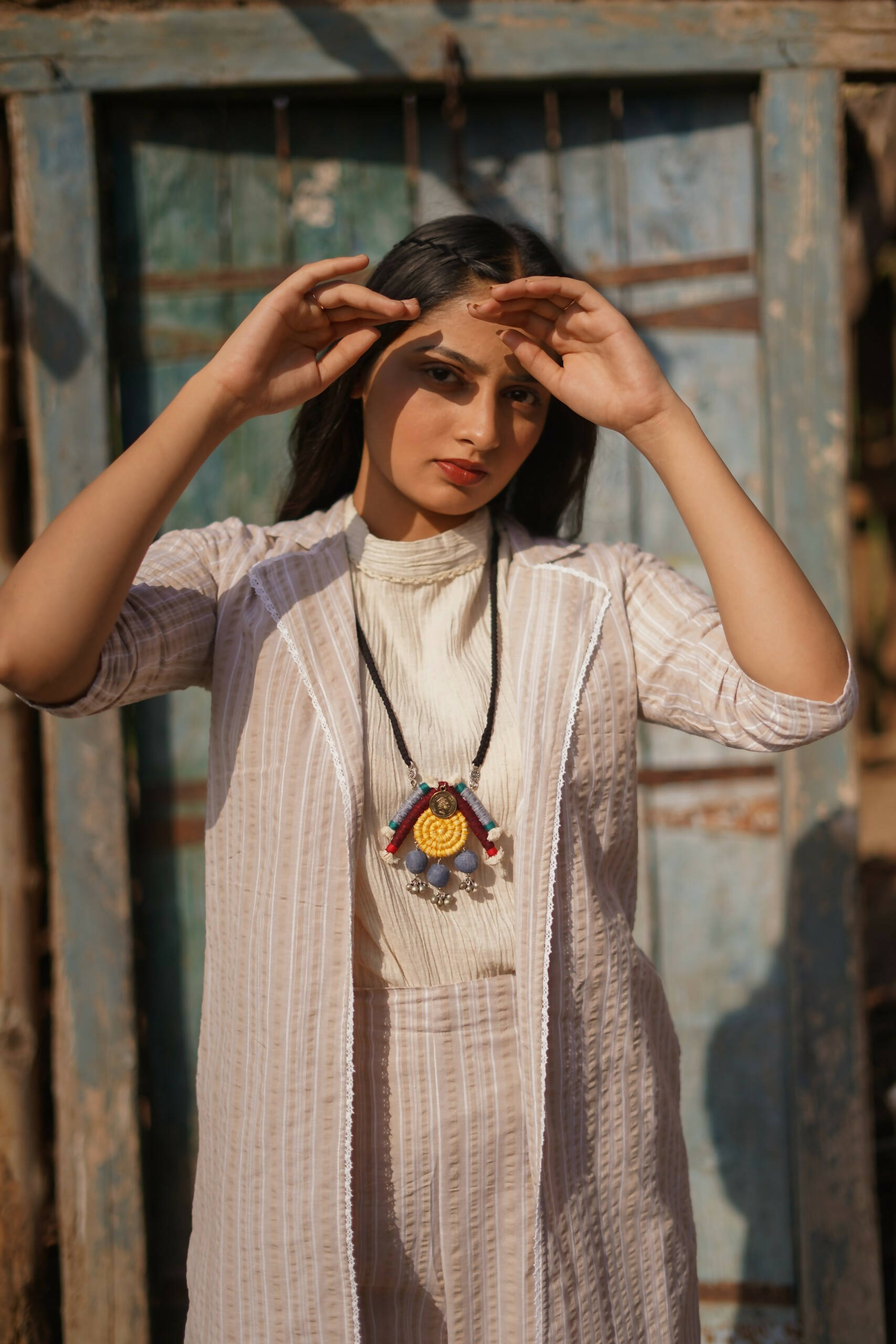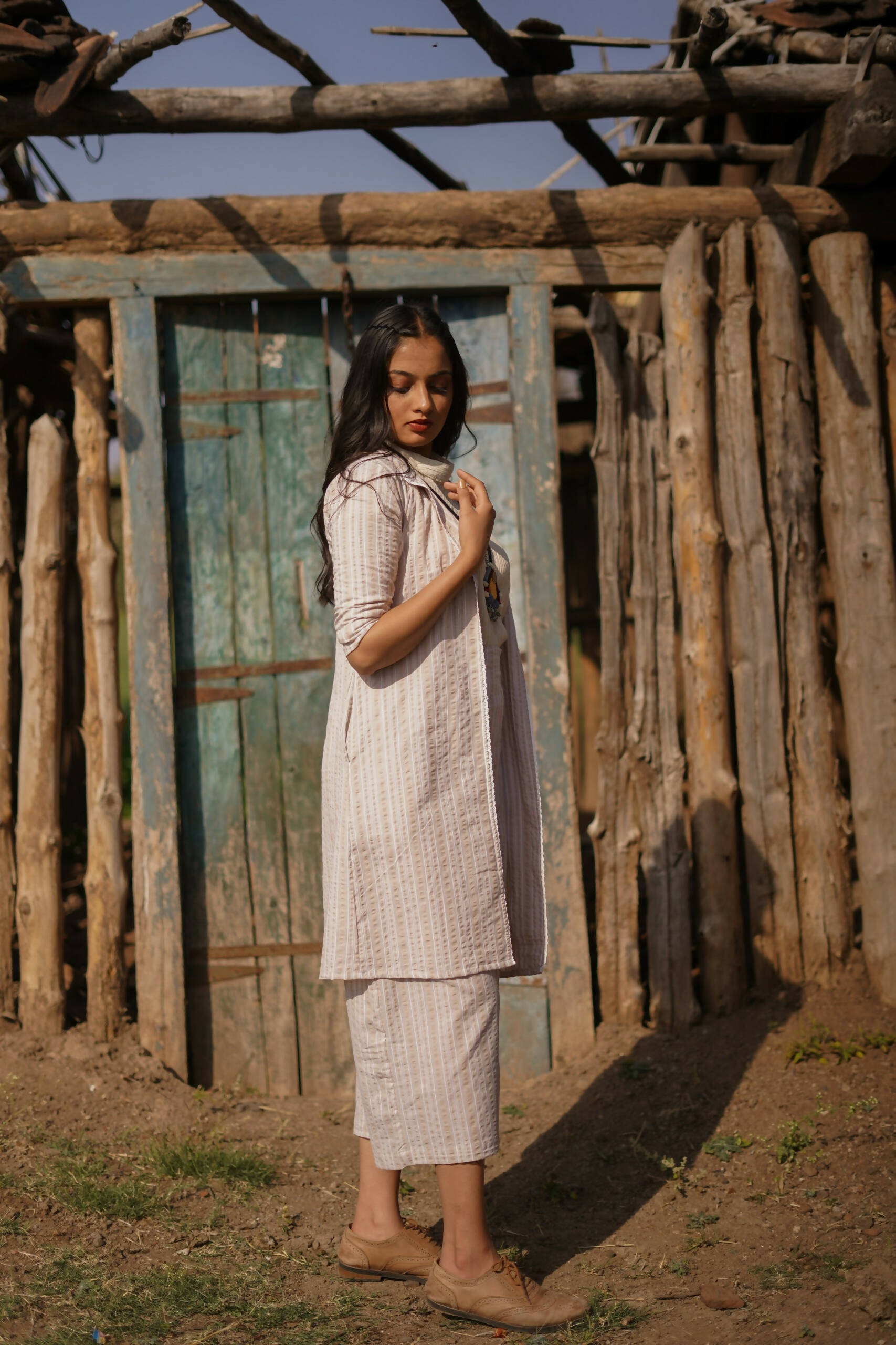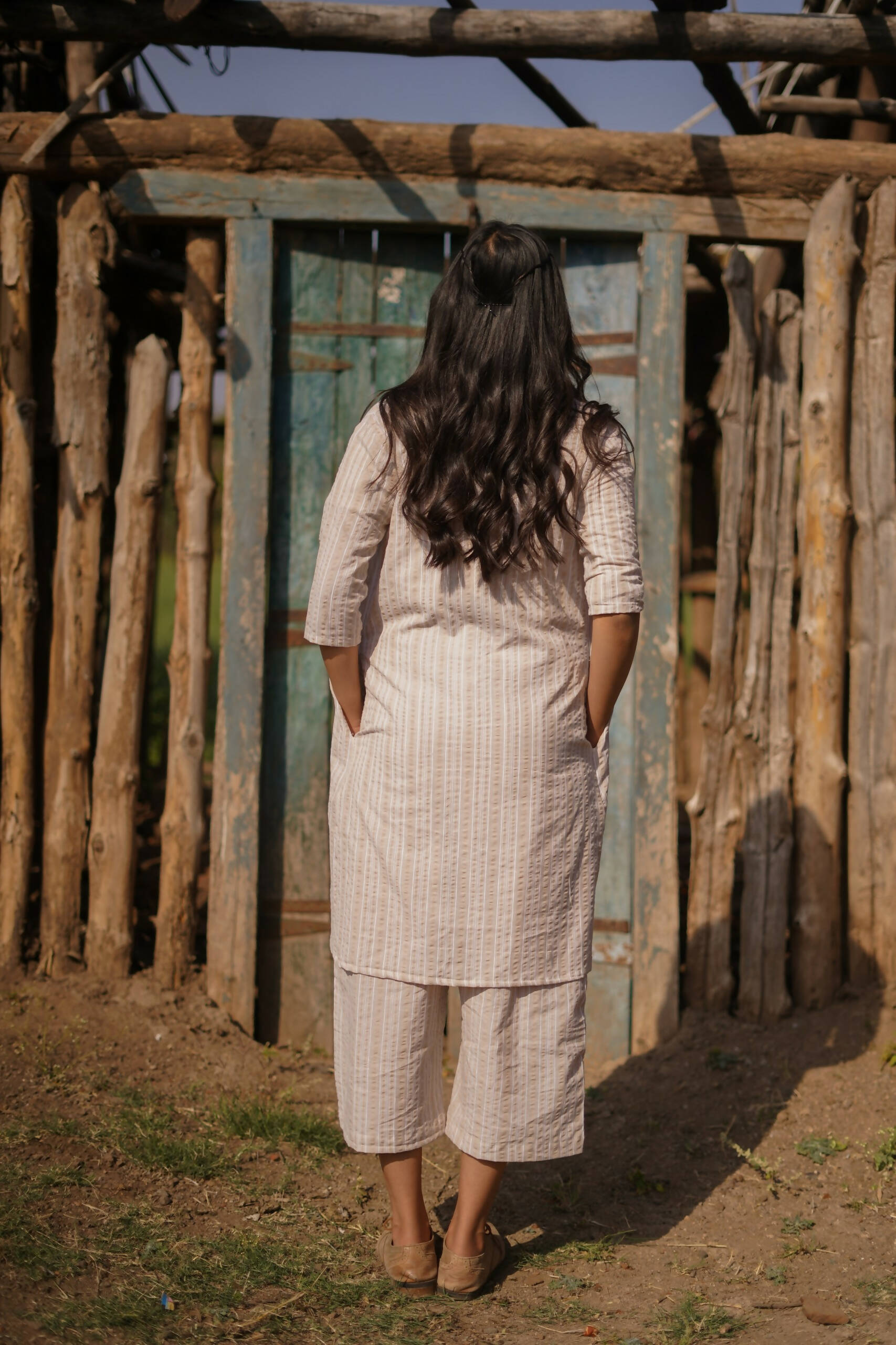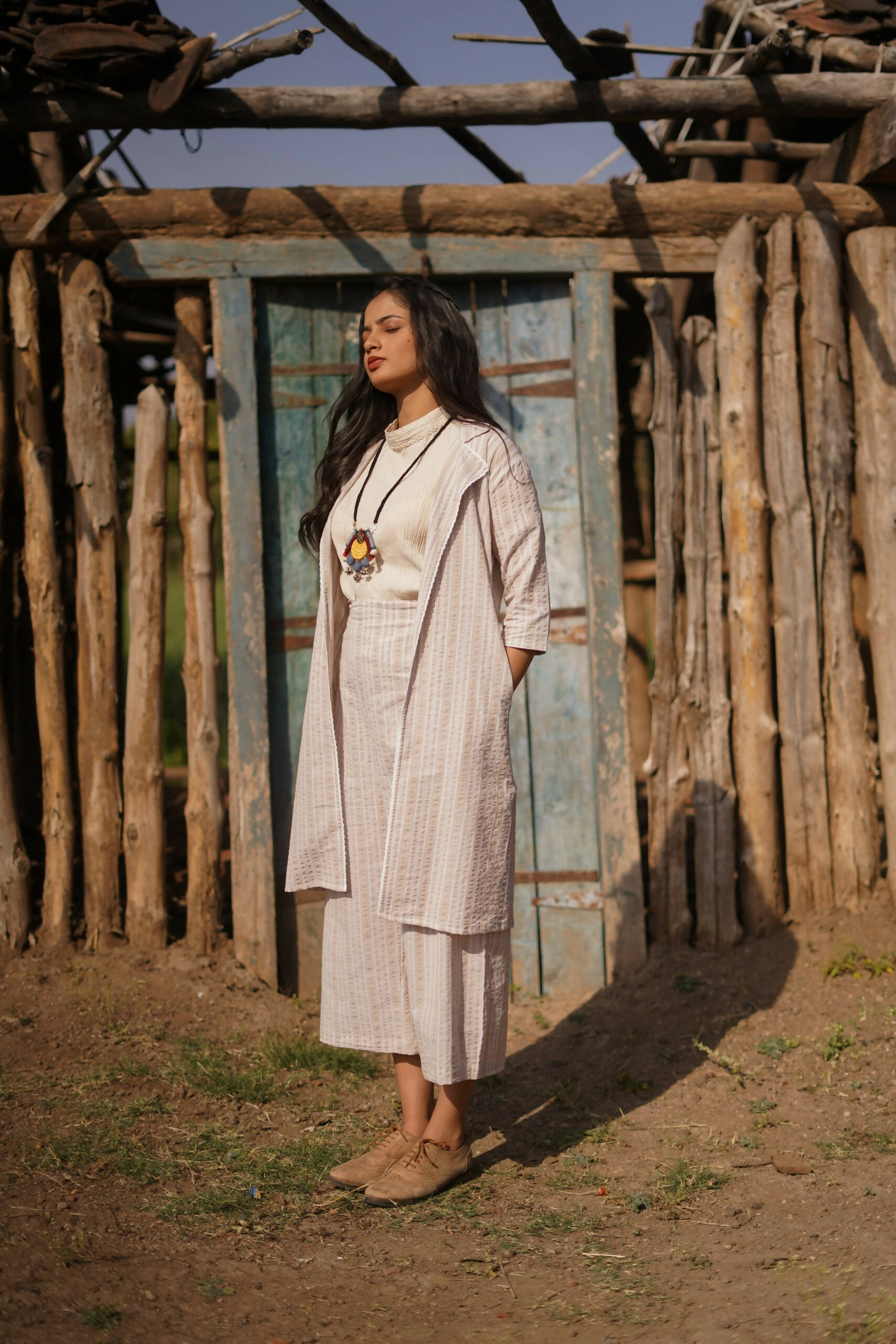 Beige-White Striped Overgarment paired with coordinated cropped Palazzos. Overgarment has inseam pockets and lace detailing.
