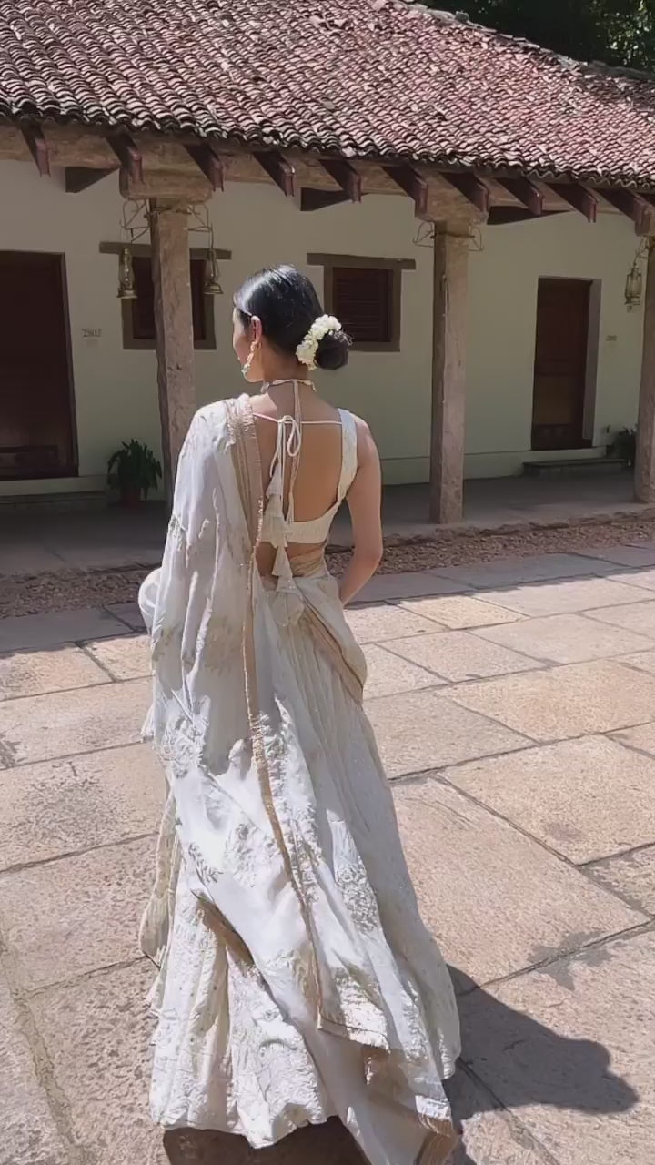 A flared Chikankari lehenga, intricately stitched and customized to measurements, embodies the essence of Lucknow’s rich heritage. Crafted with meticulous attention to detail, it features delicate Chikankari embroidery, showcasing traditional motifs like paisleys, florals, and vines, rendered in fine threadwork. The silhouette is gracefully flared, offering an elegant and regal appeal. Each stitch is a testament to the skilled craftsmanship passed down through generations in the heart of Lucknow, making it a timeless masterpiece that exudes charm and sophistication.