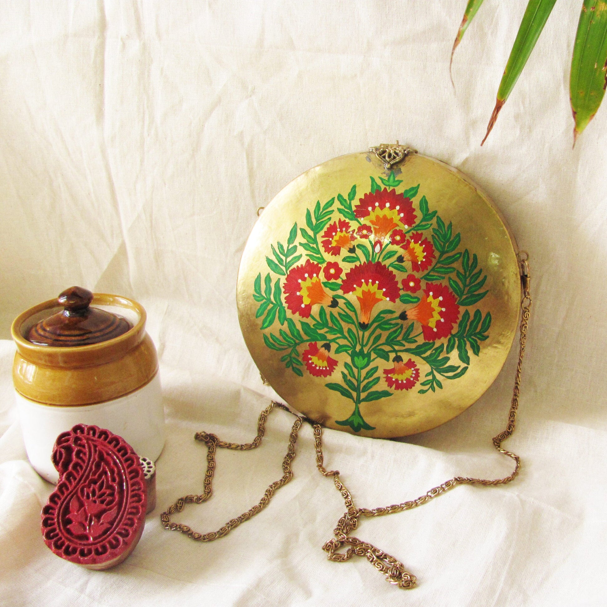 Intricately hand painted Mughal design inspired by Indian culture, this bag is a statement making piece as well as a timeless classic and a must have in your wardrobe. Also, the bag is sealed with velvet inside making it quite durable!