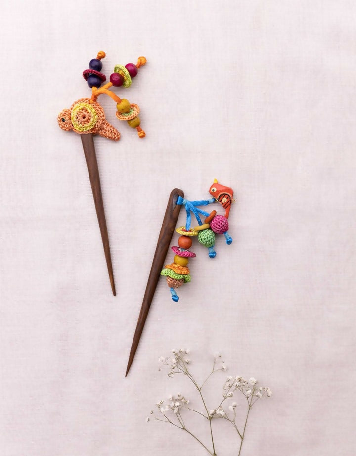 Time you go ‘back to your roots’ and let your hair down with our lightweight and handcrafted hair sticks. Accessorize your hair with this pretty hair stick. Made in wood and handcrafted in crochet this piece has been exclusively designed to give you an exquisite look. Use daily to look sophisticated, retro or chic with many of your looks. It works will as a gift, too. Vibrant and quirky birds made in crochet will adorn your look with this hair stick.