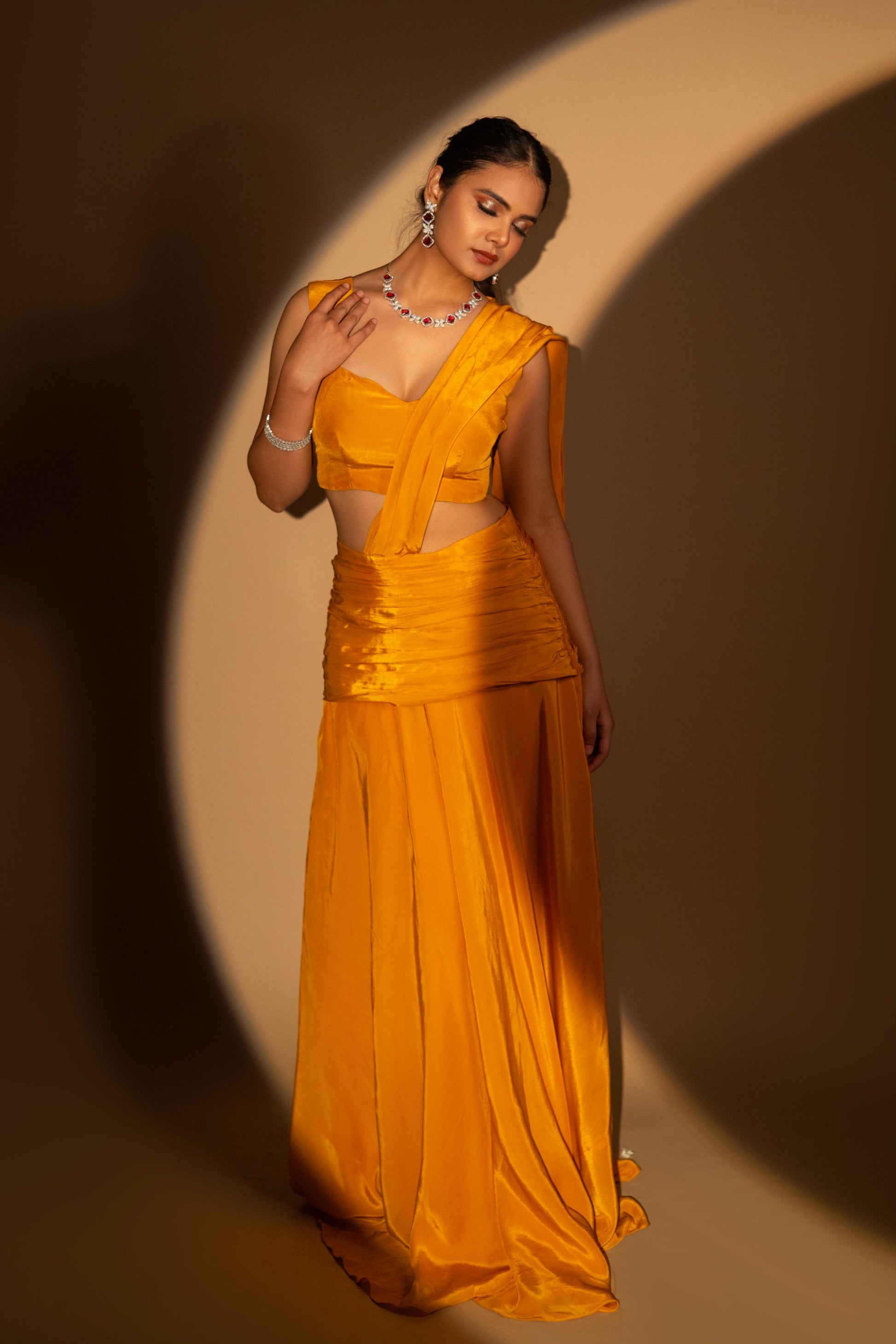 Stand out in the Mustard Crepe Drape Saree, featuring a sleek, structured bodice and gracefully gathered drapes. Crafted from luxurious, lightweight crepe, it flows with effortless movement and a soft sheen—perfect for capturing every eye at your evening celebration.