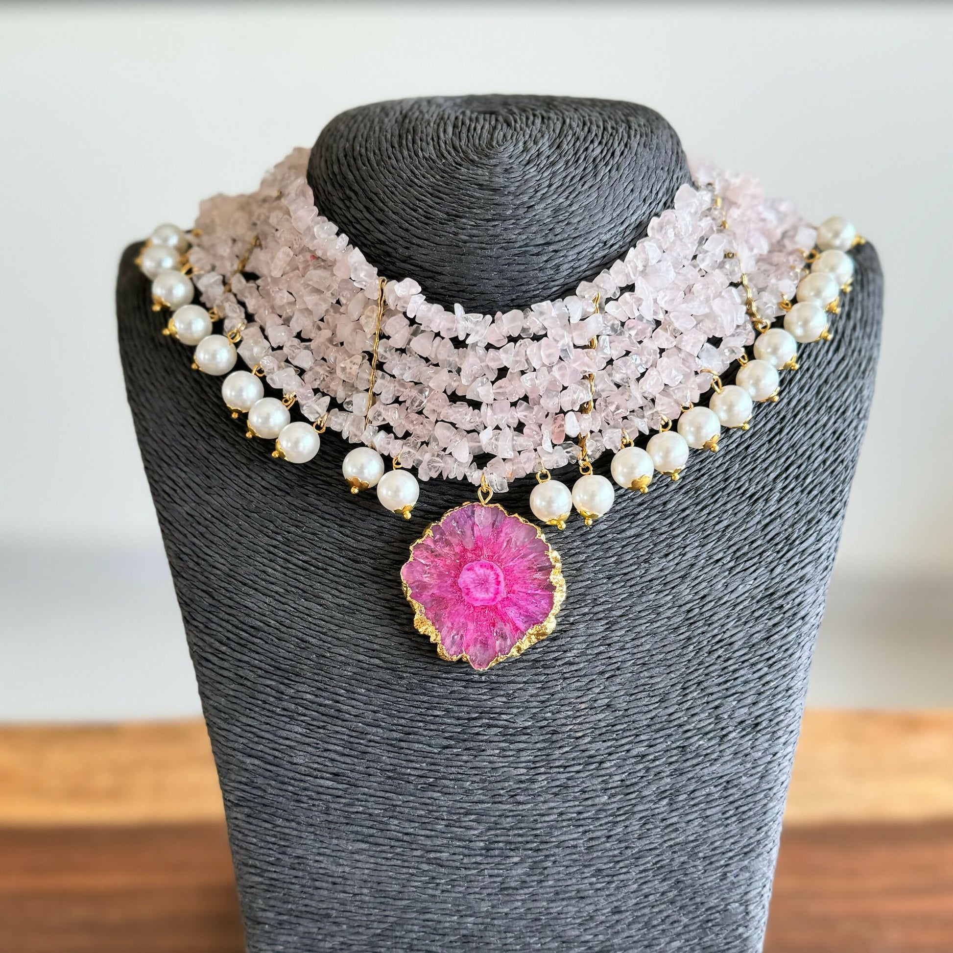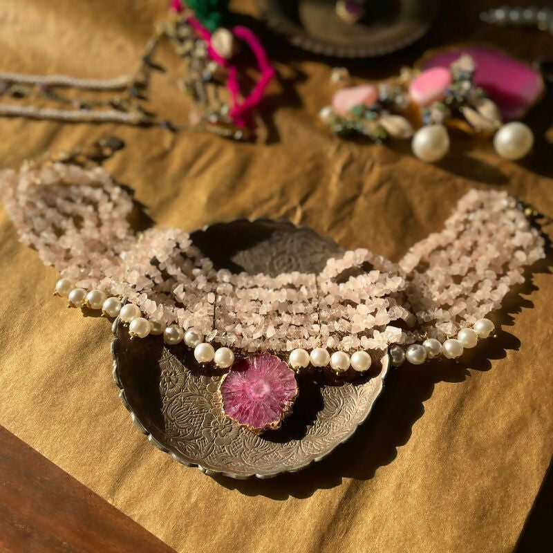 The royal uncut rose necklace is what you need for your wedding. Every bride wants to look and feel royal and this piece will add to your journey just like a spark. The most magnificent handmade bridal jewellery of uncut agate stones with pearls showing the elegant touch. The dangler earrings wit mulitcolor stones hanging on bottom of pink stones with shell and pearl. You cannot miss the detail of flower cap and beautiful pearls kaan sher with it.