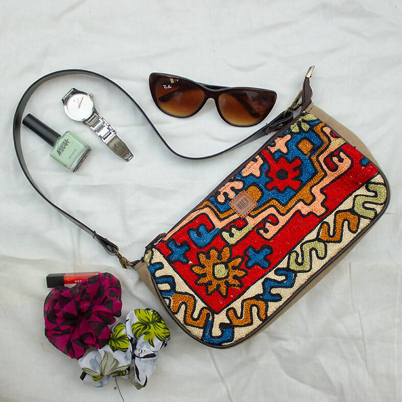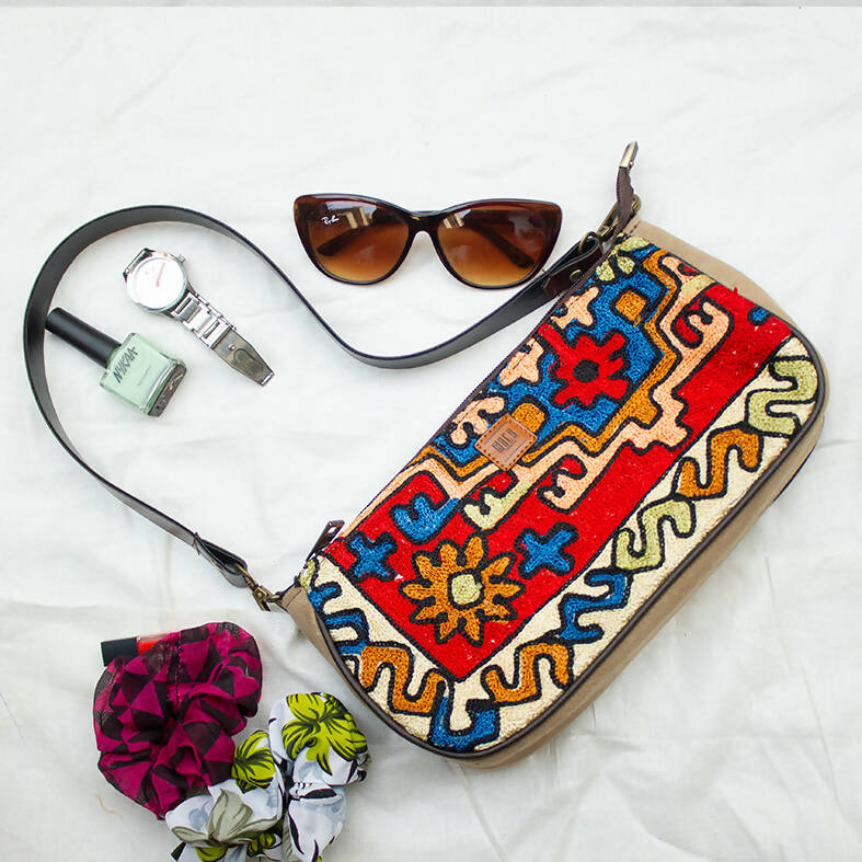 The everyday Baguette bag is a new addition to our collection.The bag is handmade and features a beautifully crafted chain stitch patch.It is suitable for travel holidays or as an everyday essential bag.The bag has vegan leather handles that add to its elegance.