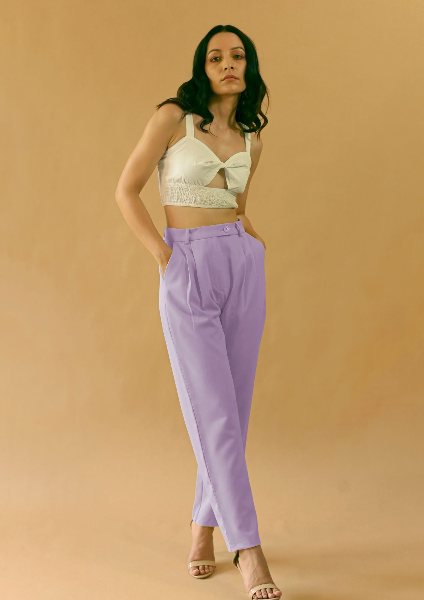 These high-waist straight-cut trousers have a sleek parallel seam detail on the front. They're versatile and classy, ideal for both casual outings and formal occasions.