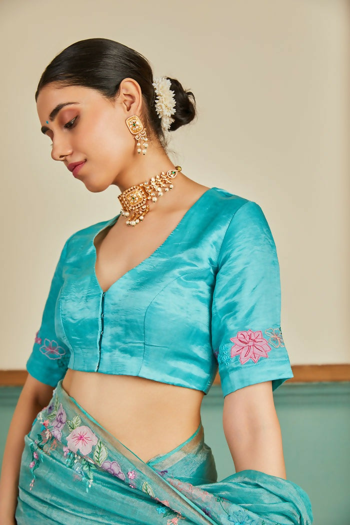 Our Nasrin blouse is crafted from luxurious turquoise blue silk linen, providing a smooth and elegant texture. It features half sleeves, making it a comfortable choice for both casual and semi-formal occasions. The standout feature of this blouse is the hand-embroidered sleeves adorned with a combination of patchwork and intricate threadwork embroidery.