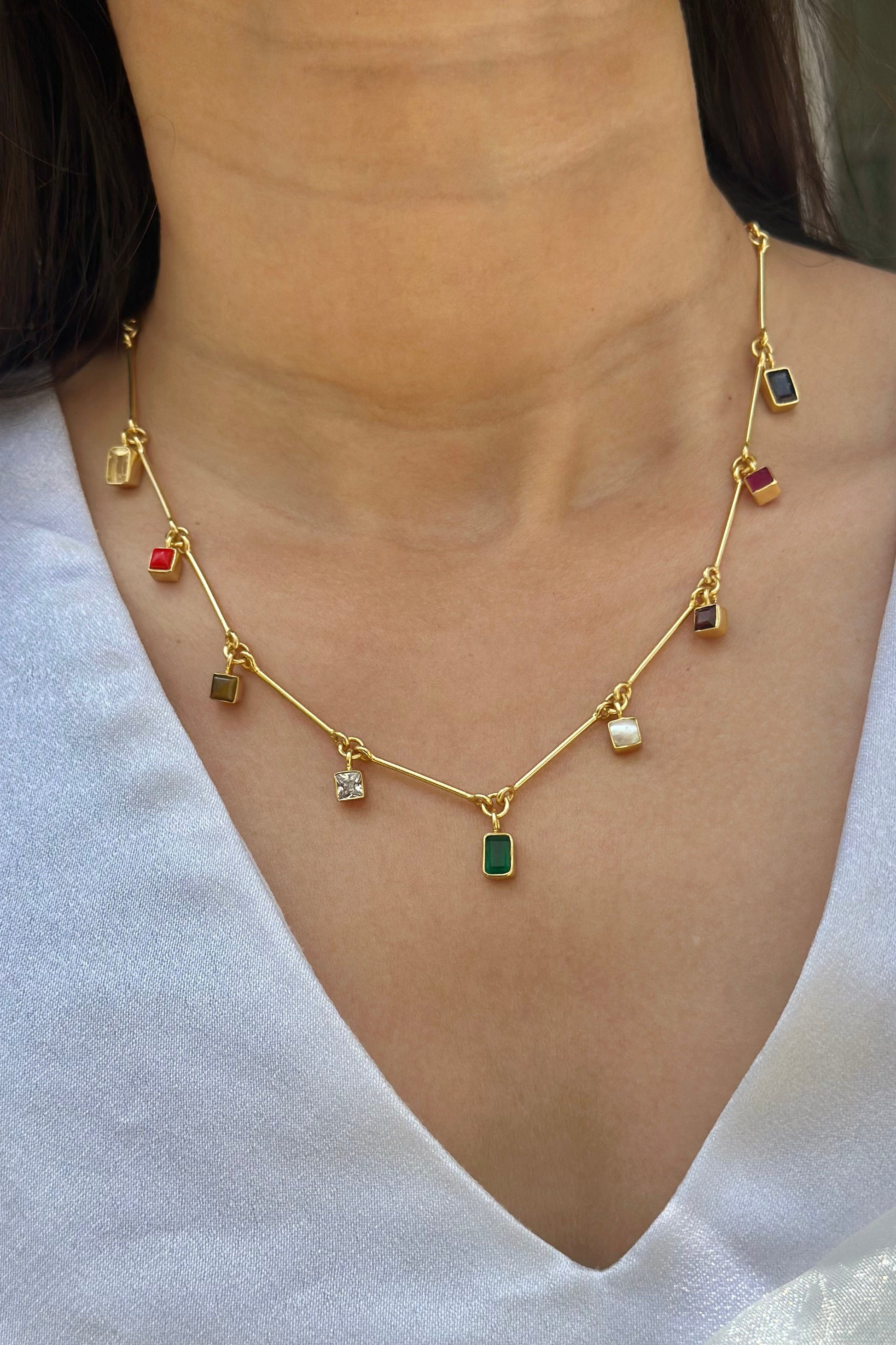 Elevate your ensemble with the Navratna Bar Necklace . Meticulously handcrafted from hallmarked 92.5 fine silver and luxuriously gold-plated, this necklace features a harmonious arrangement of nine auspicious gemstones: natural pearl, red coral, cat's eye, Swarovski diamond, yellow sapphire, blue sapphire, emerald, ruby, and hessonite