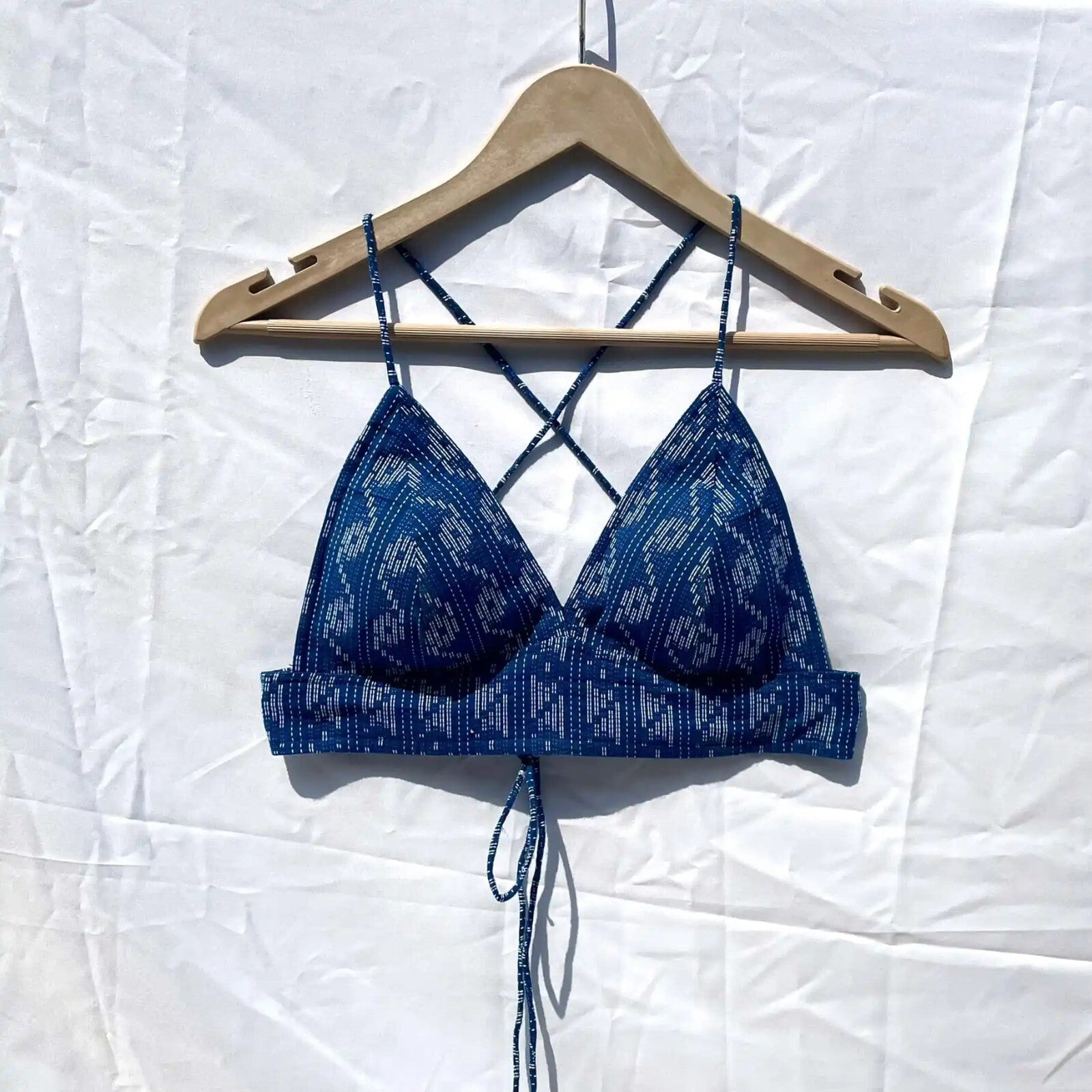 The Navy Blue Pattern Kantha Embroidery Bralette exudes timeless elegance with its intricate Kantha stitching and soft, breathable cotton fabric. The classic navy blue color and unique S-pattern design offer a sophisticated, yet comfortable fit. Perfect for all-day wear, this bralette combines artisanal craftsmanship with modern style, making it a must-have addition to your lingerie collection.