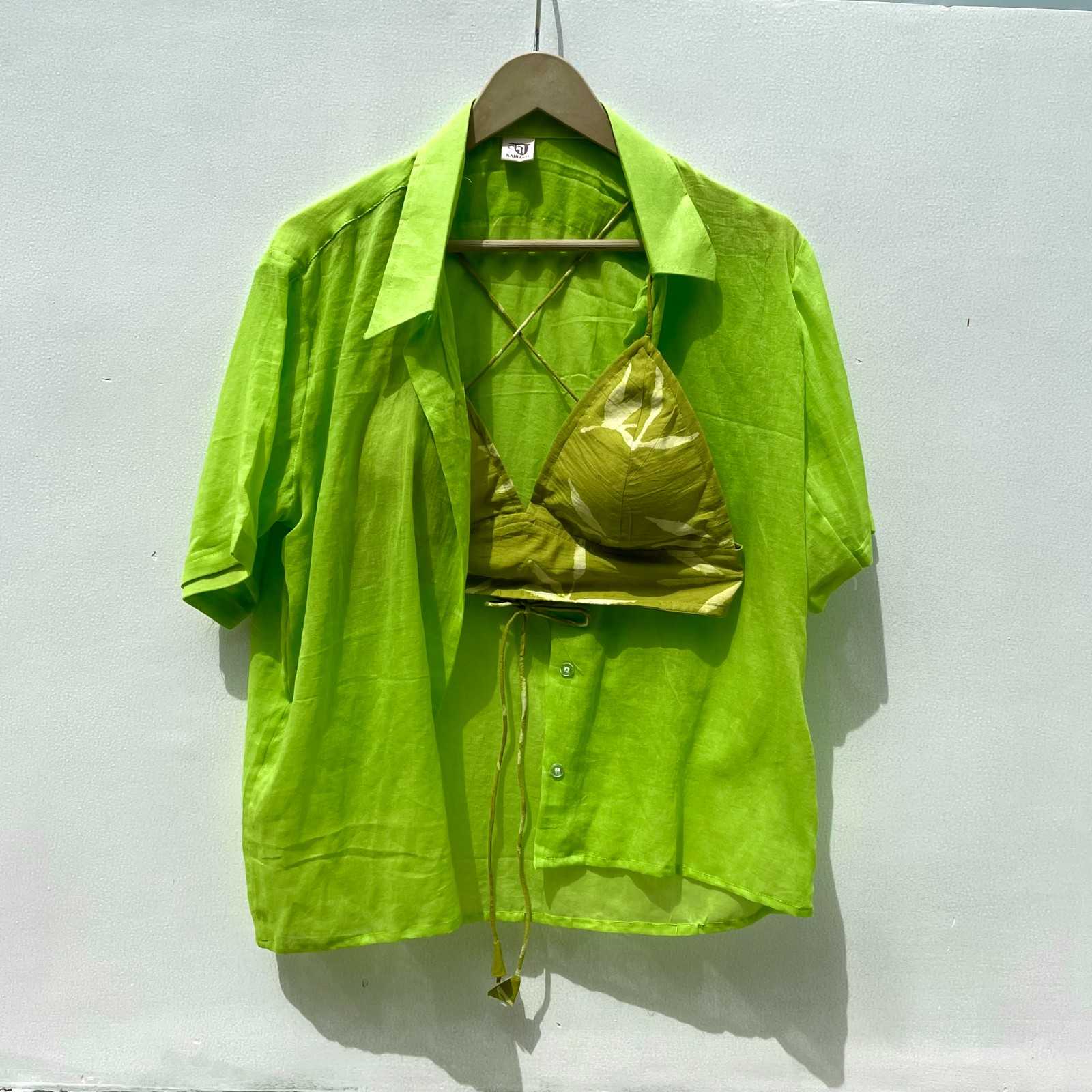 Neon Green Mul Shirt with Handblock Leaf Bralette Combo