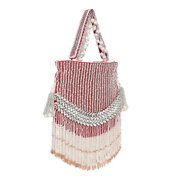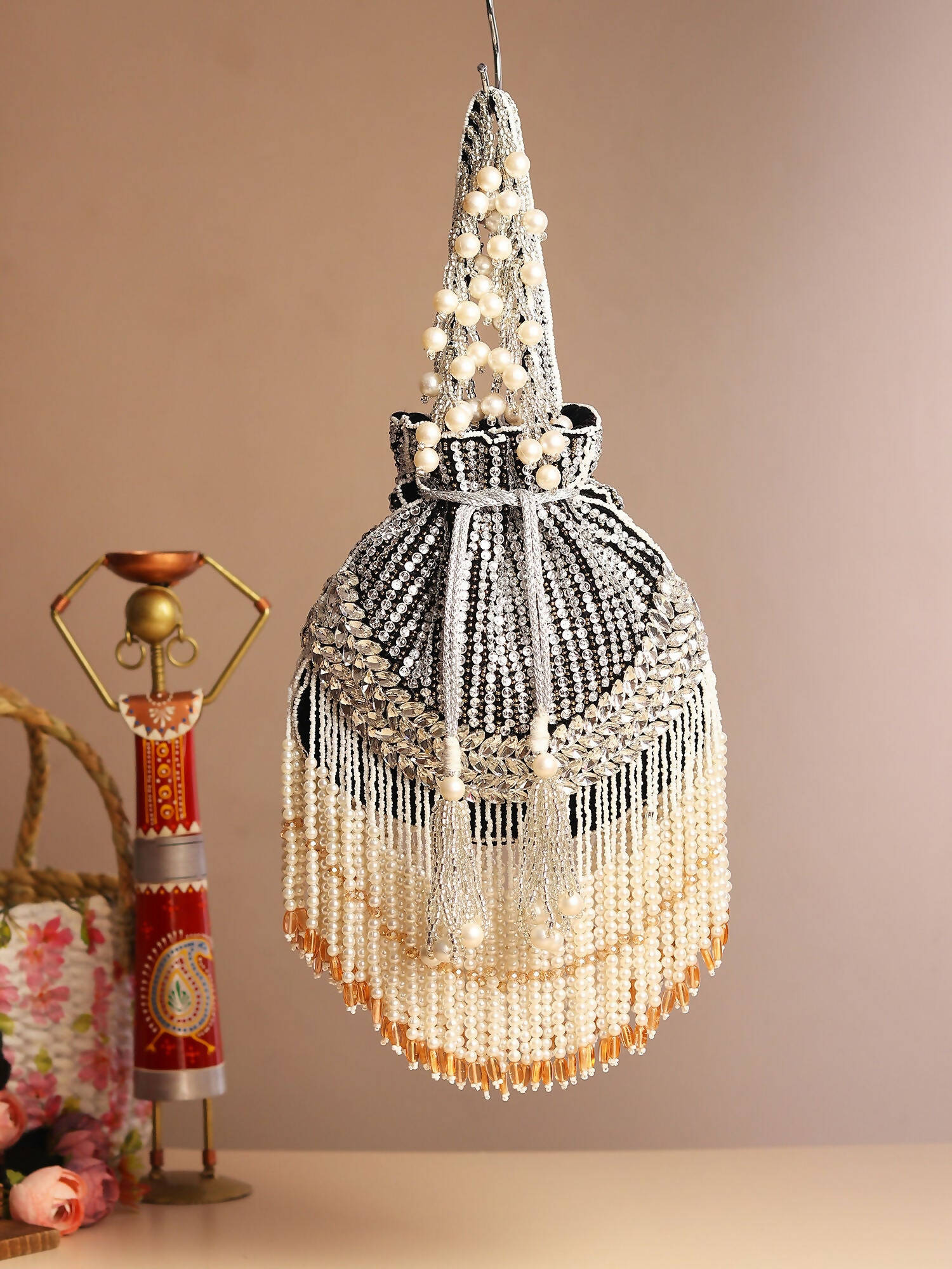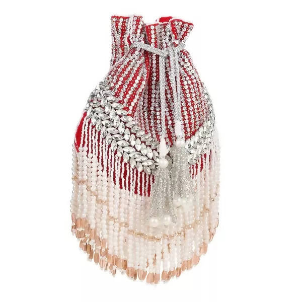 The short embroidered handle offers both charm and practicality, while the secure drawstring closure adds a touch of versatility. Perfect for any evening occasion, this potli bag effortlessly elevates your look with its unique blend of elegance and flair.