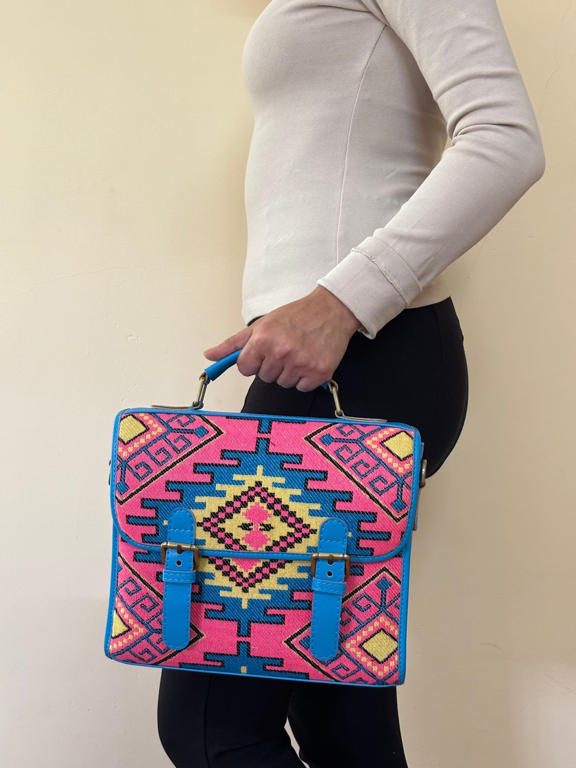 Bold and functional, the Nomad Spirit Saddlebag combines a striking geometric jacquard fabric with durable faux leather accents. Its structured frame, top handle, and adjustable sling offer versatile carry options, while the push-lock closure and organized interior make it perfect for everyday use. A standout piece built to last.
