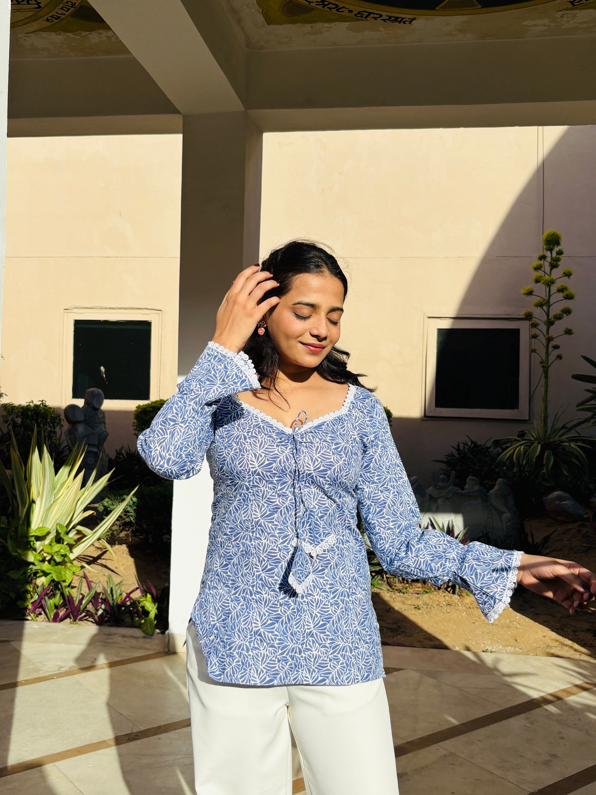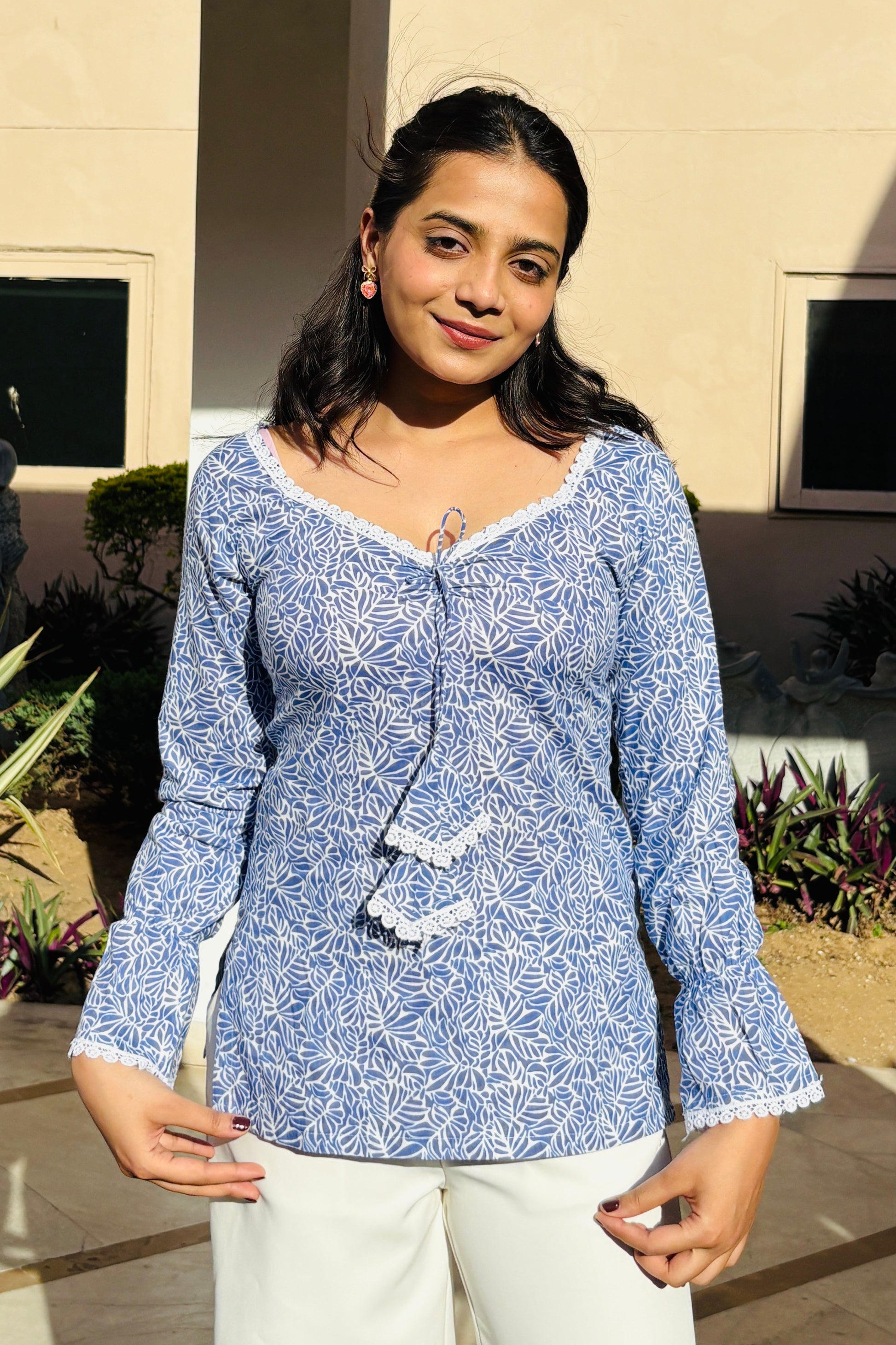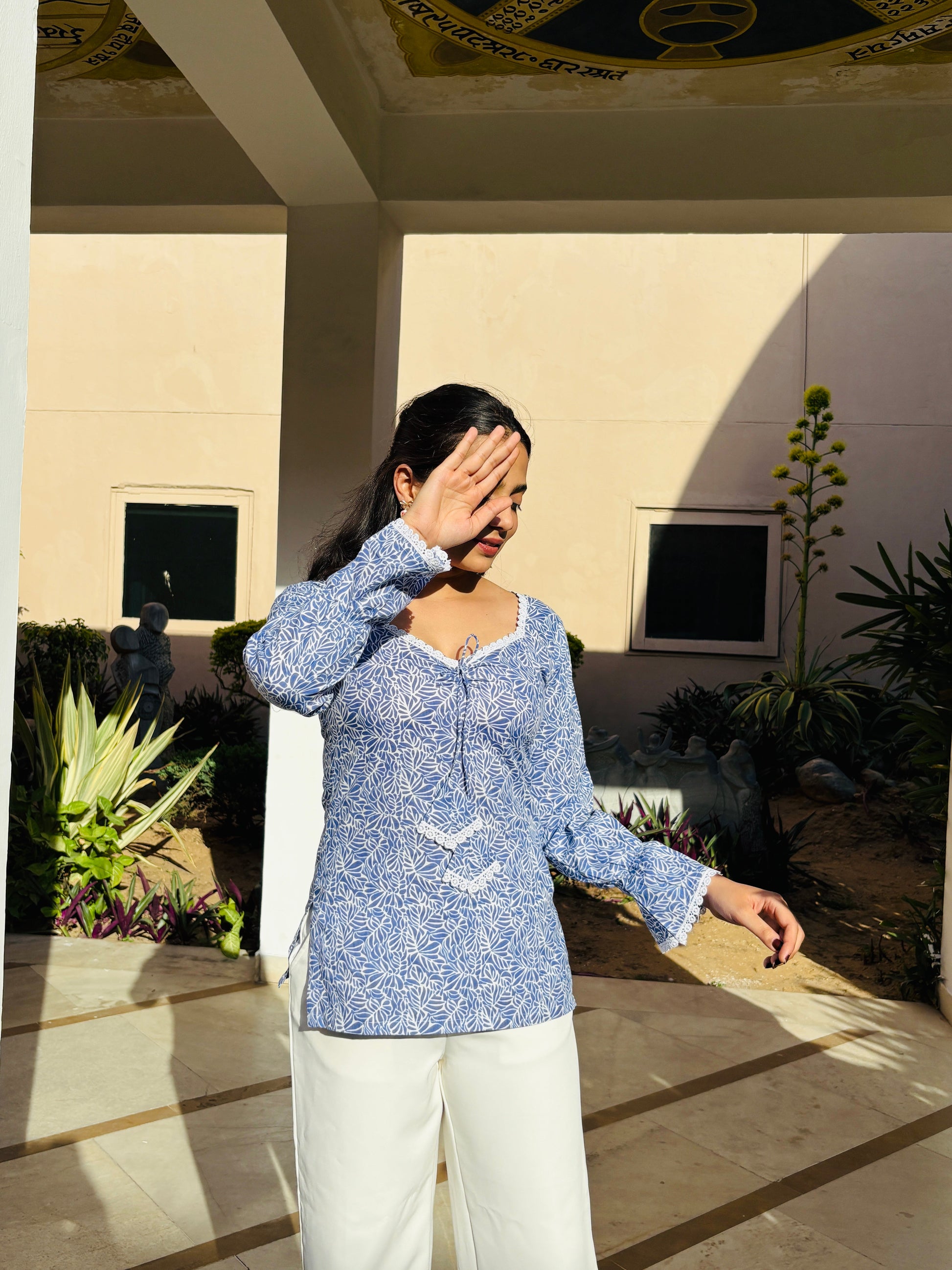 Draped in a tranquil powder blue, the Noor Kurti is a vision of effortless grace. Inspired by the calm of Jaipur's early mornings, its delicate white floral block print mirrors the serenity of nature. The soft heart-shaped neckline, adorned with intricate lace details, adds a feminine touch, while the airy balloon sleeves bring in a vintage charm.Lightweight and breathable, Noor is perfect for sunlit strolls or slow afternoons. Pair it with white trousers for a crisp, ethereal look that embodies understated luxury.
