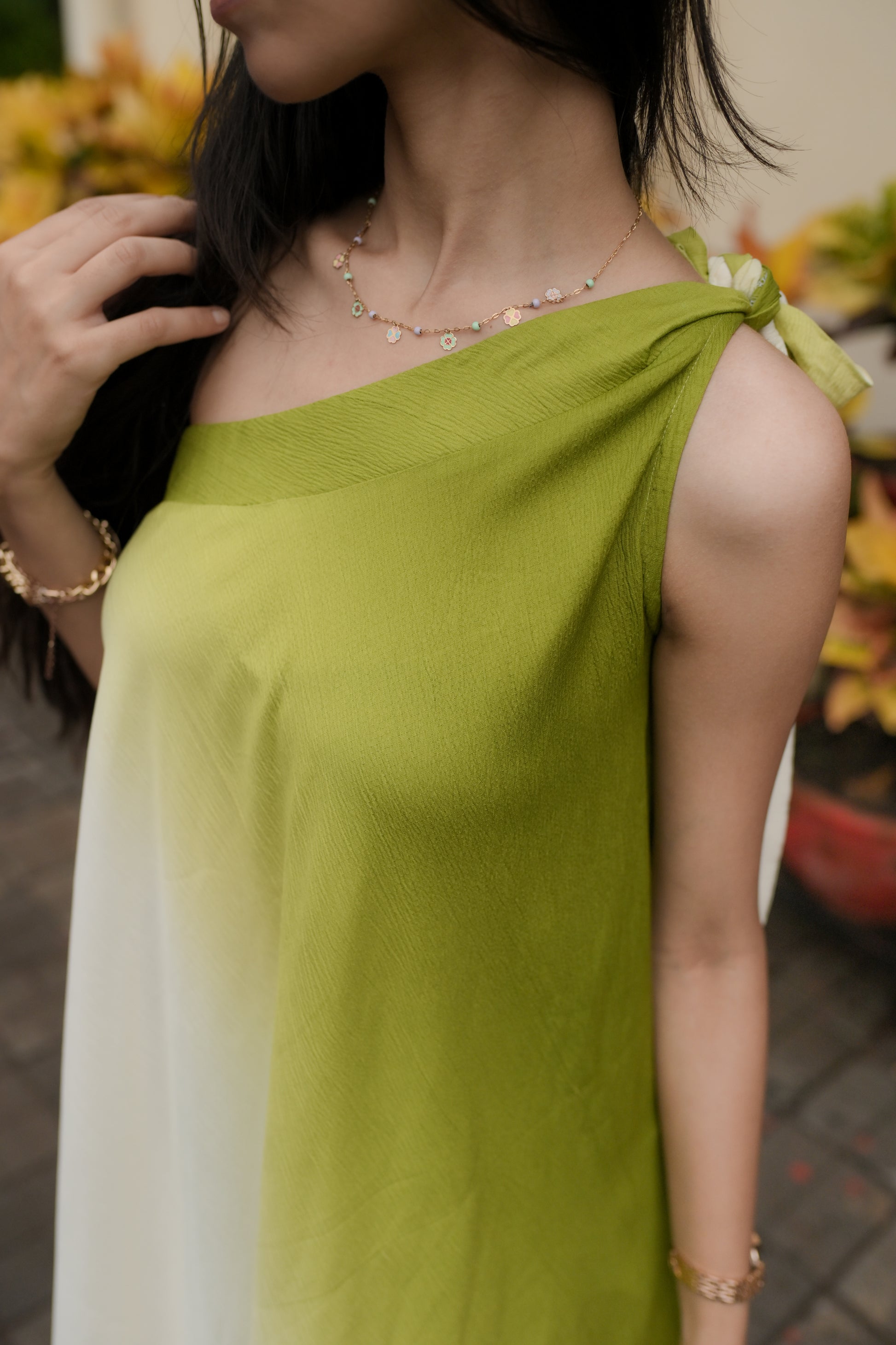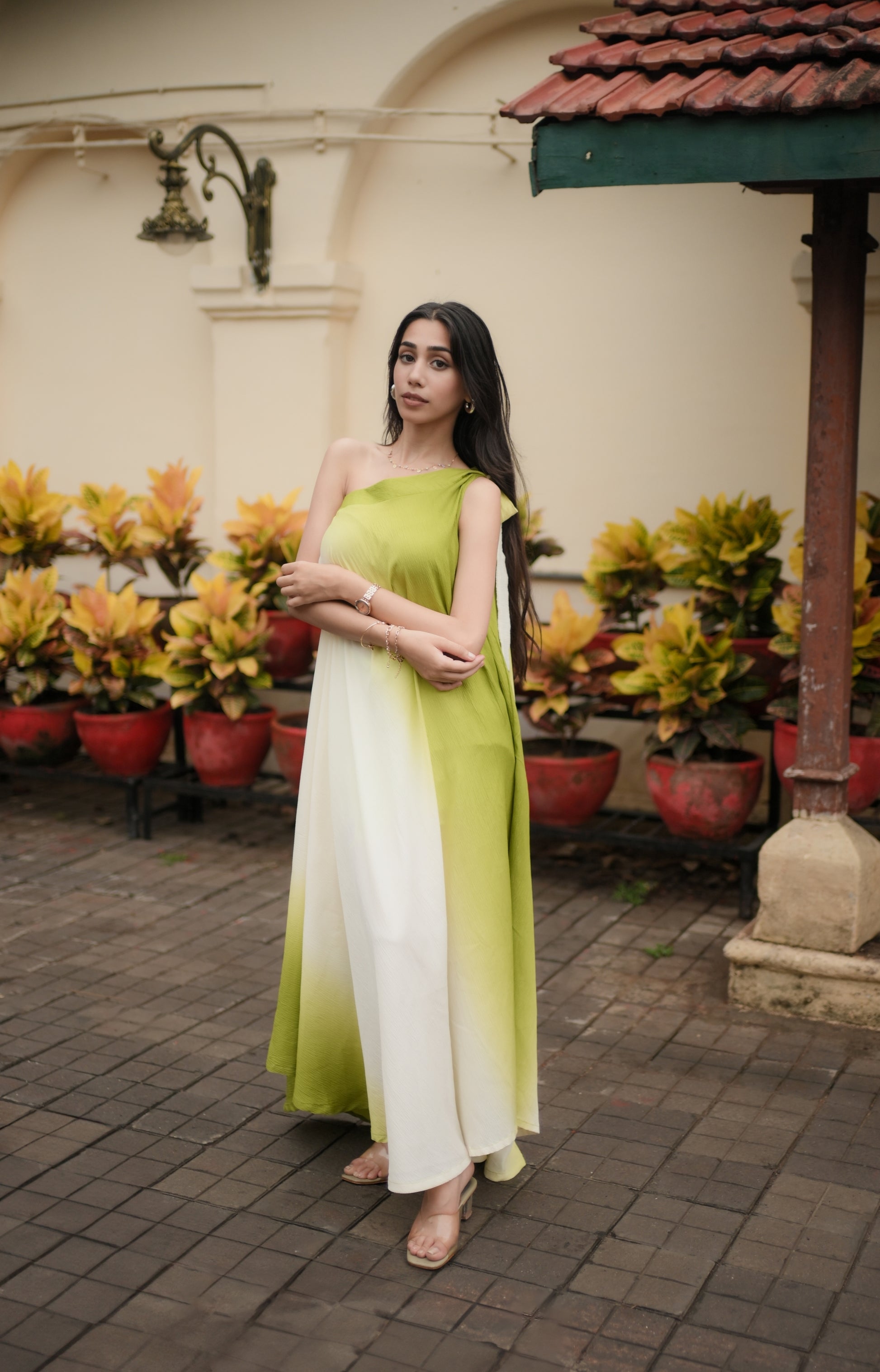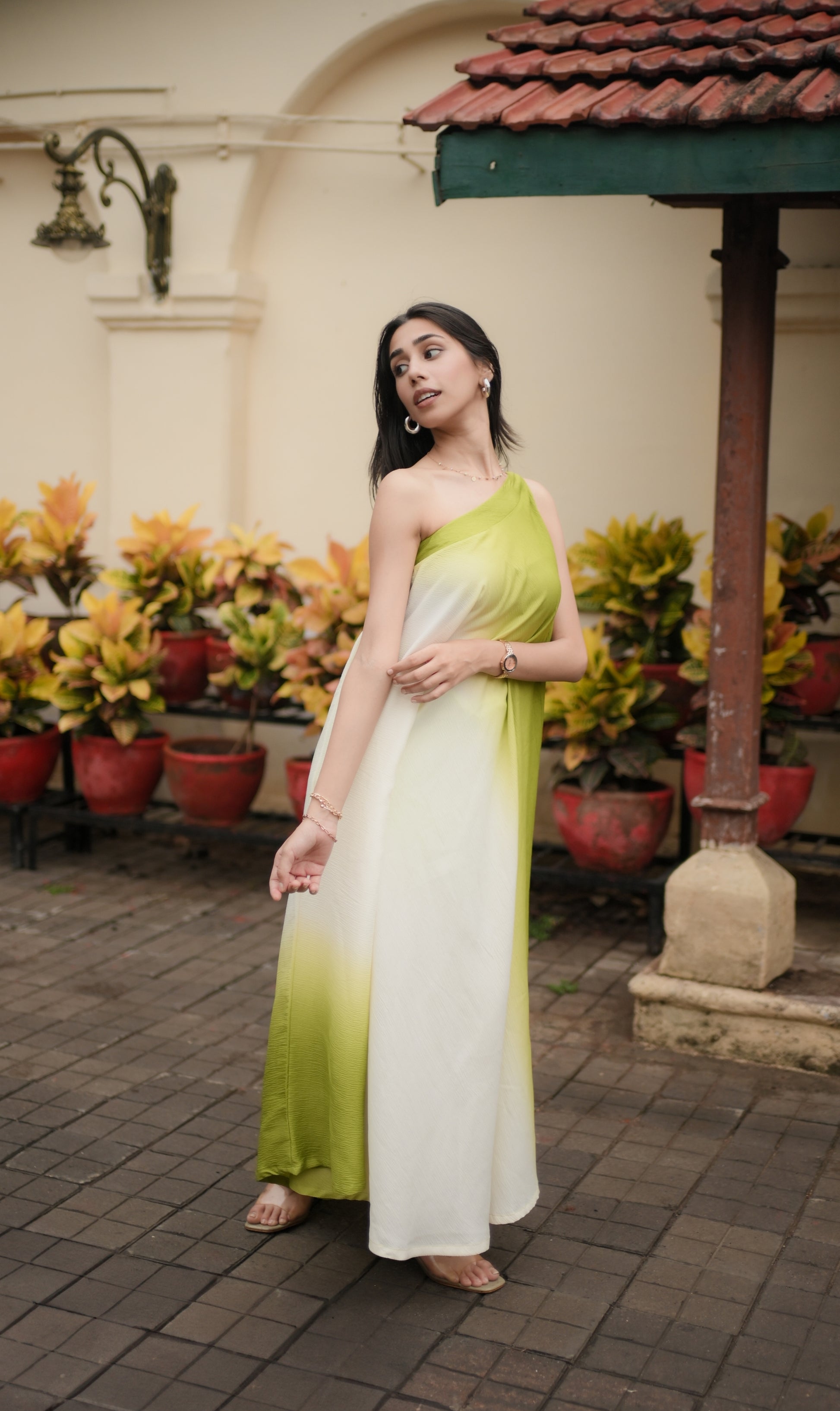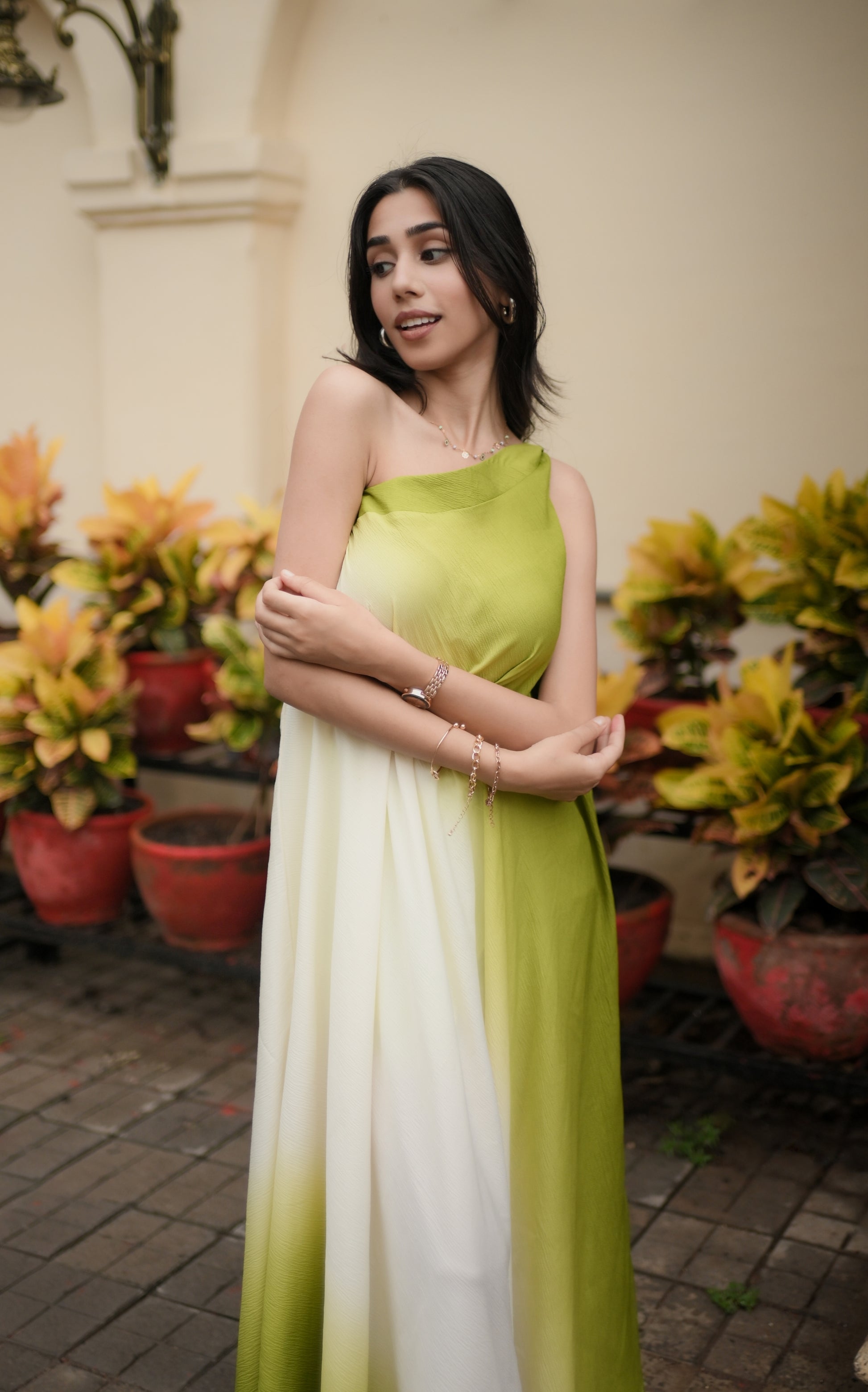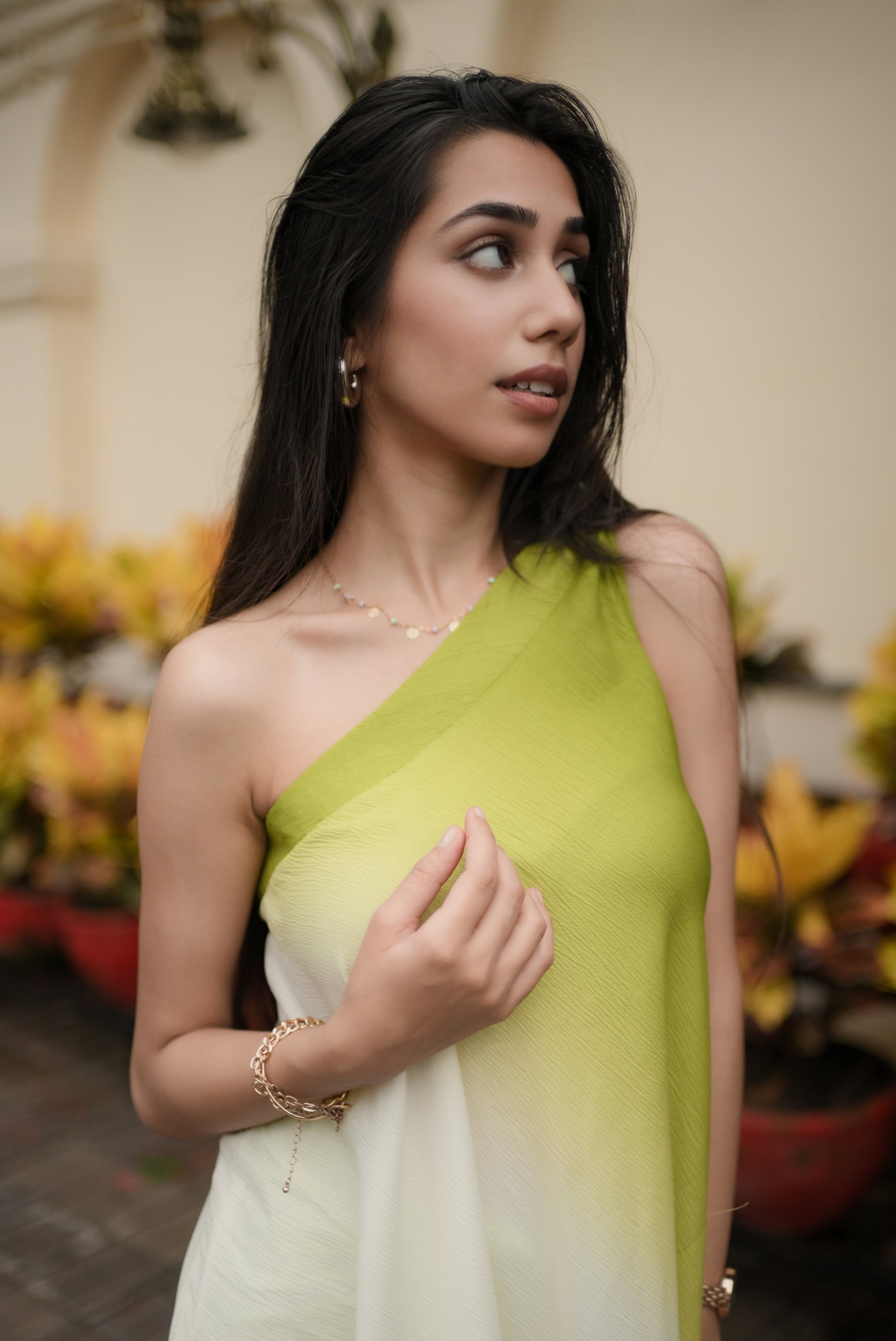 Make an ethereal statement in this one-shoulder ombre dress, flowing from fresh lime green into soft ivory. Designed in a breezy, asymmetric silhouette with a graceful fall, it’s your go-to for effortless elegance on sunlit days or evening soirées.