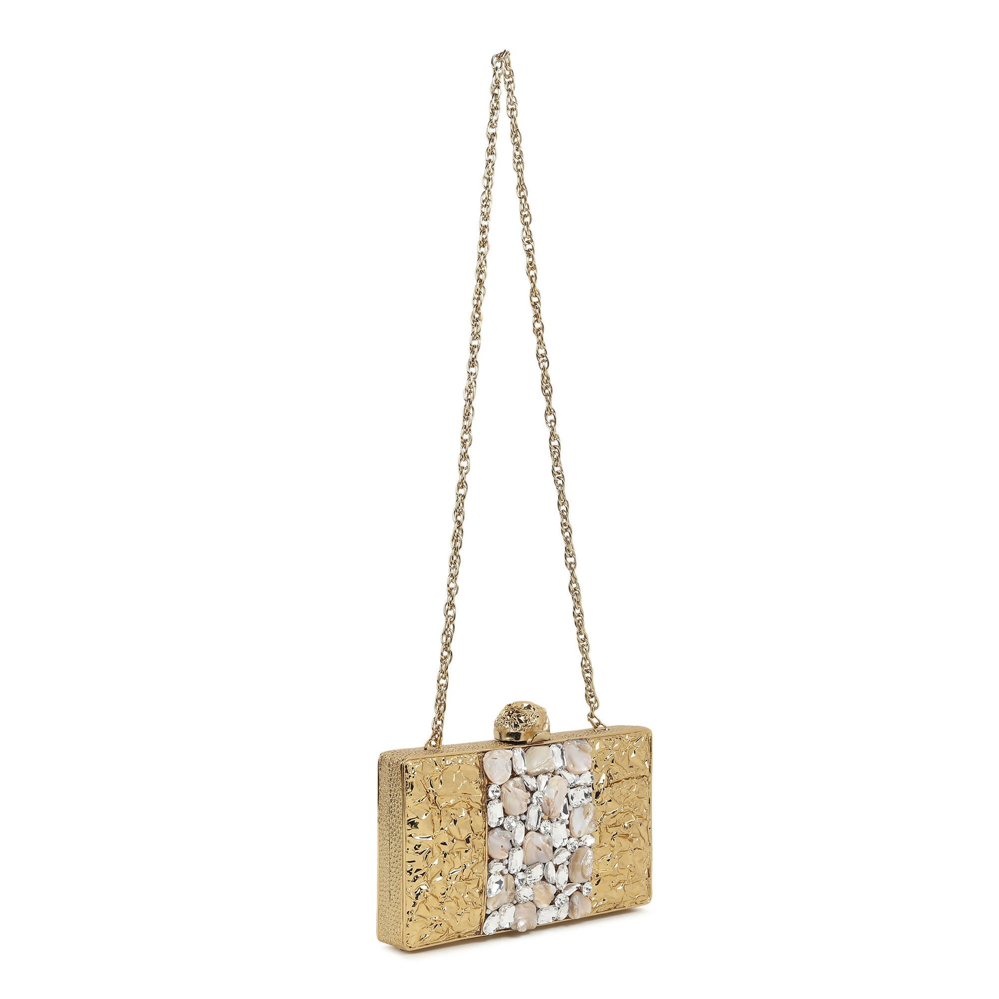 Introducing the Opaline Mother of Pearl Clutch, a dazzling blend of elegance and sophistication. Adorned with exquisite stone embellishments, this clutch captures attention with its radiant shimmer. The stylish sling chain provides versatile carrying options, making it a perfect companion for any occasion. Elevate your look with this luxurious accessory, designed to add a touch of glamour to your ensemble.