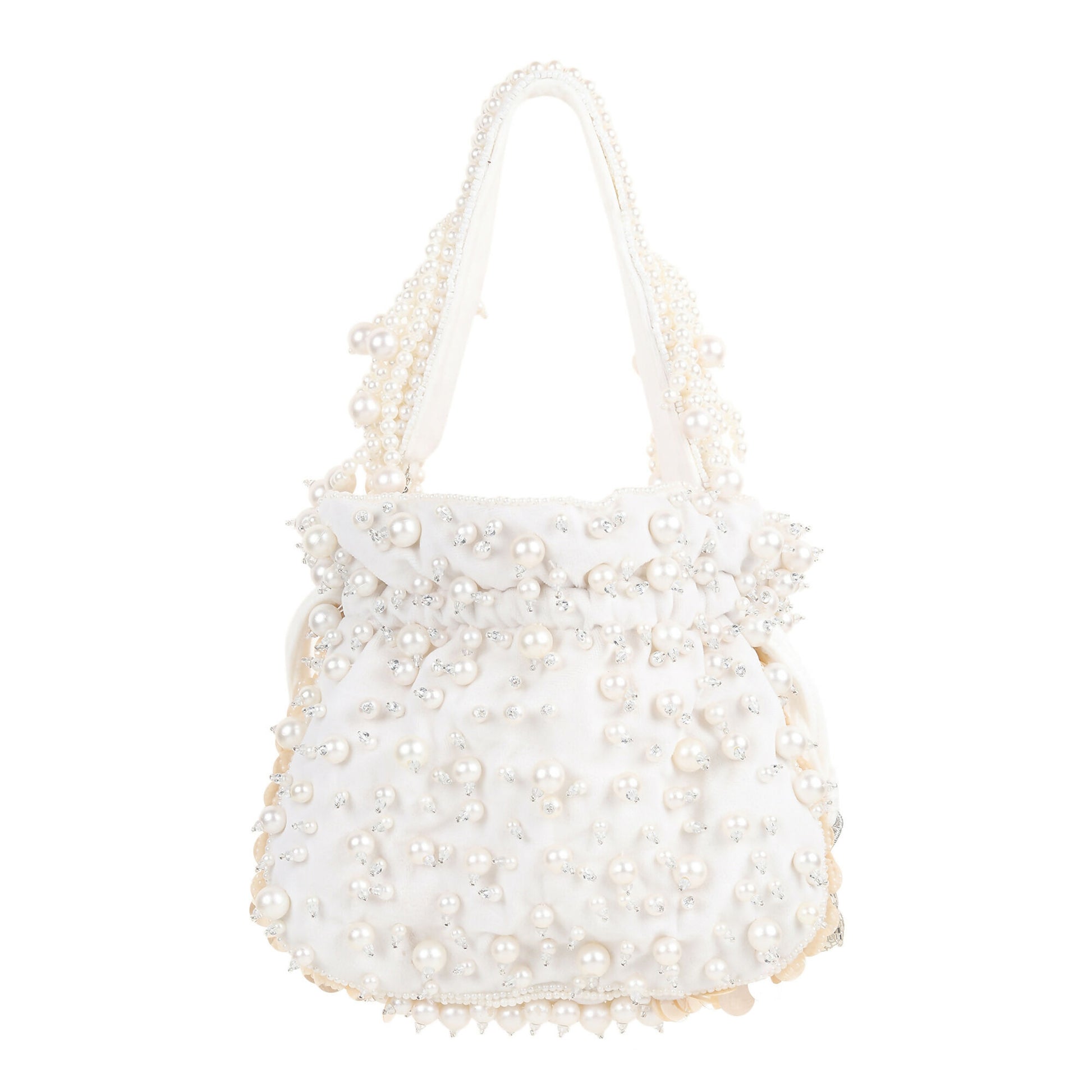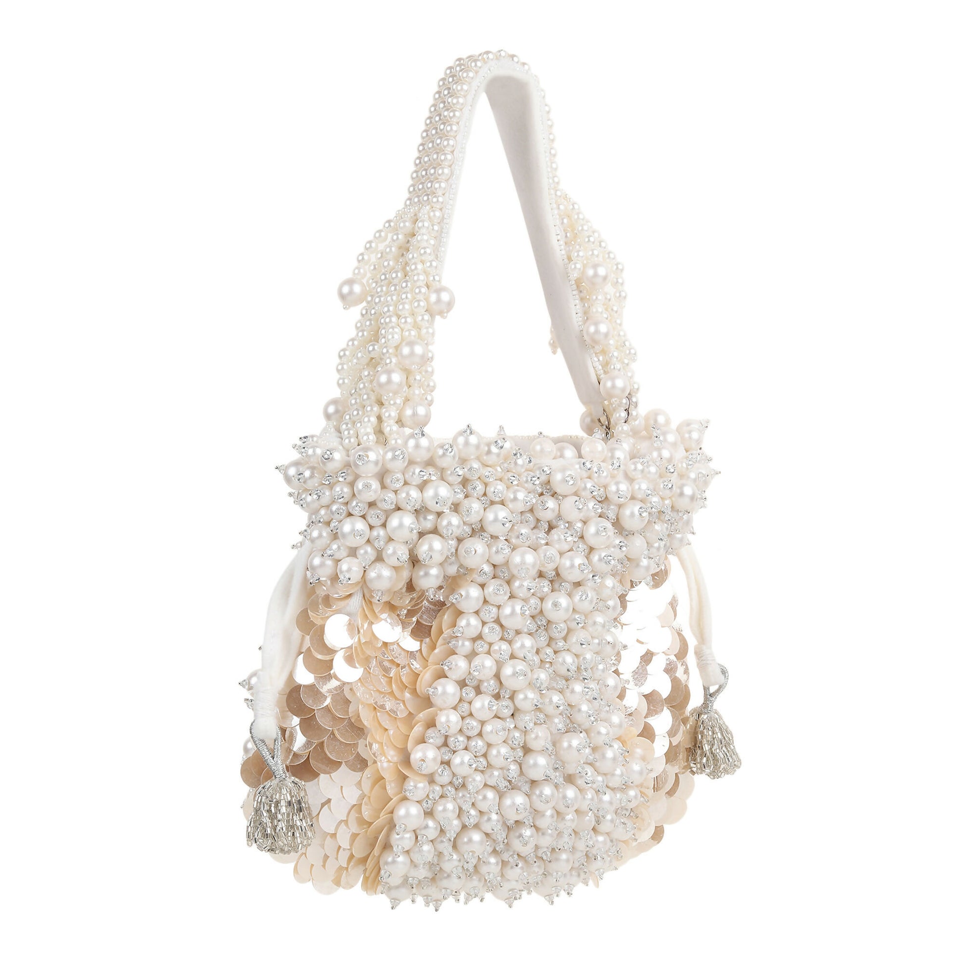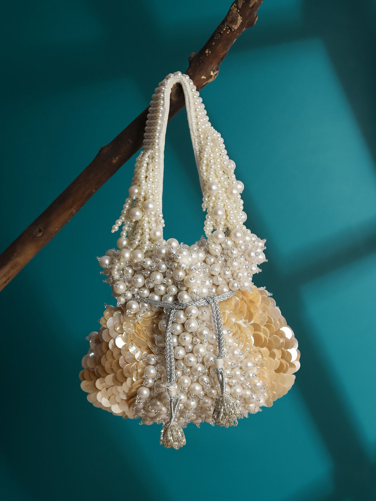 Introducing the Opaline Pearl Potli Bag, a distinctive blend of elegance and charm. Adorned with delicate sequins and exquisite pearl work, this potli bag adds a sophisticated touch to any outfit. The short embroidered handle not only enhances its aesthetic appeal but also ensures ease of carrying. Perfect for making a stylish statement, this bag is the ideal accessory to elevate your ensemble with a unique flair.