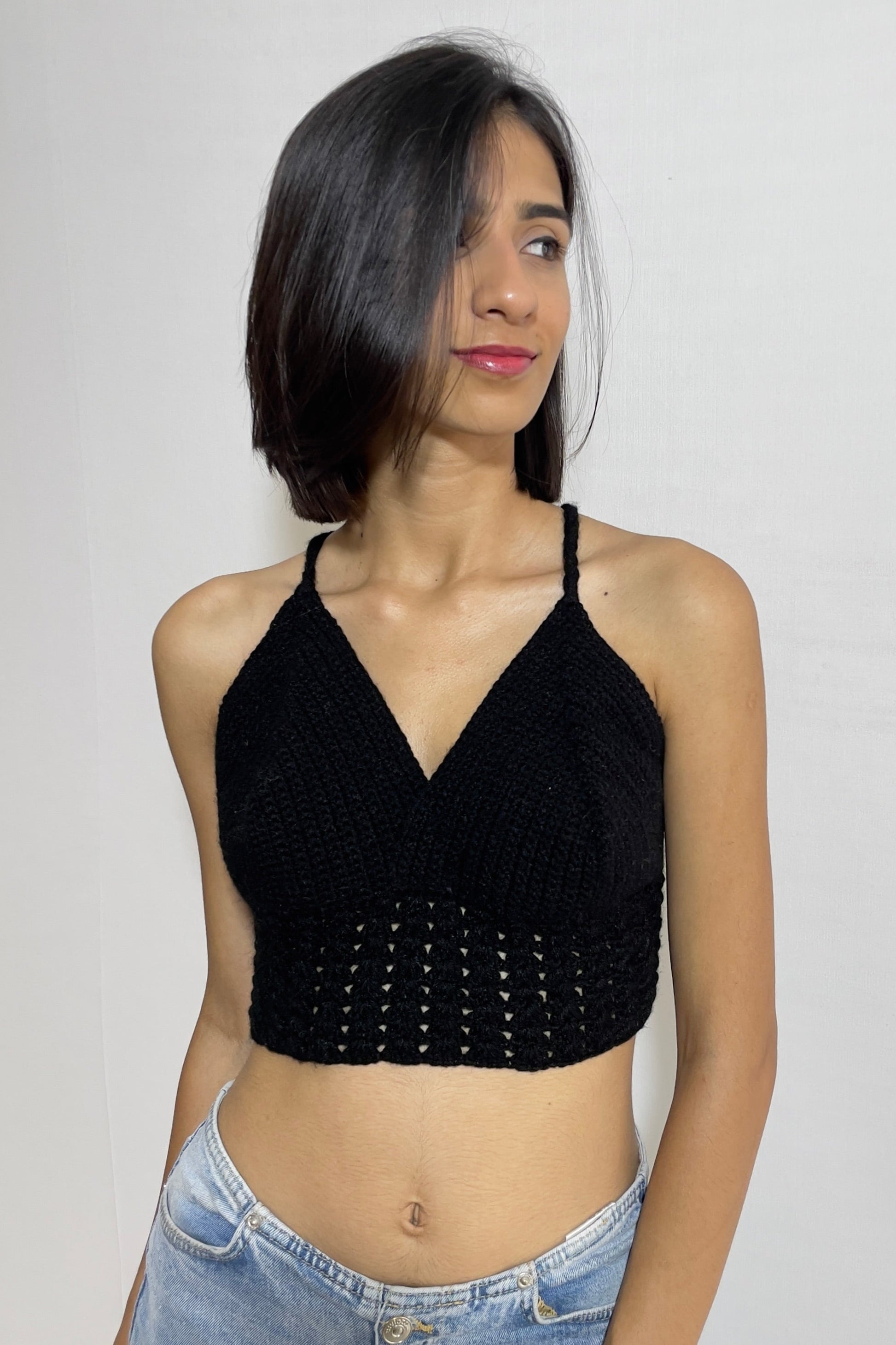 Sleeveless, fitted crop top in pointelle-knit crocheted look. A beautiful, delicate crop top that’s perfect for summer!