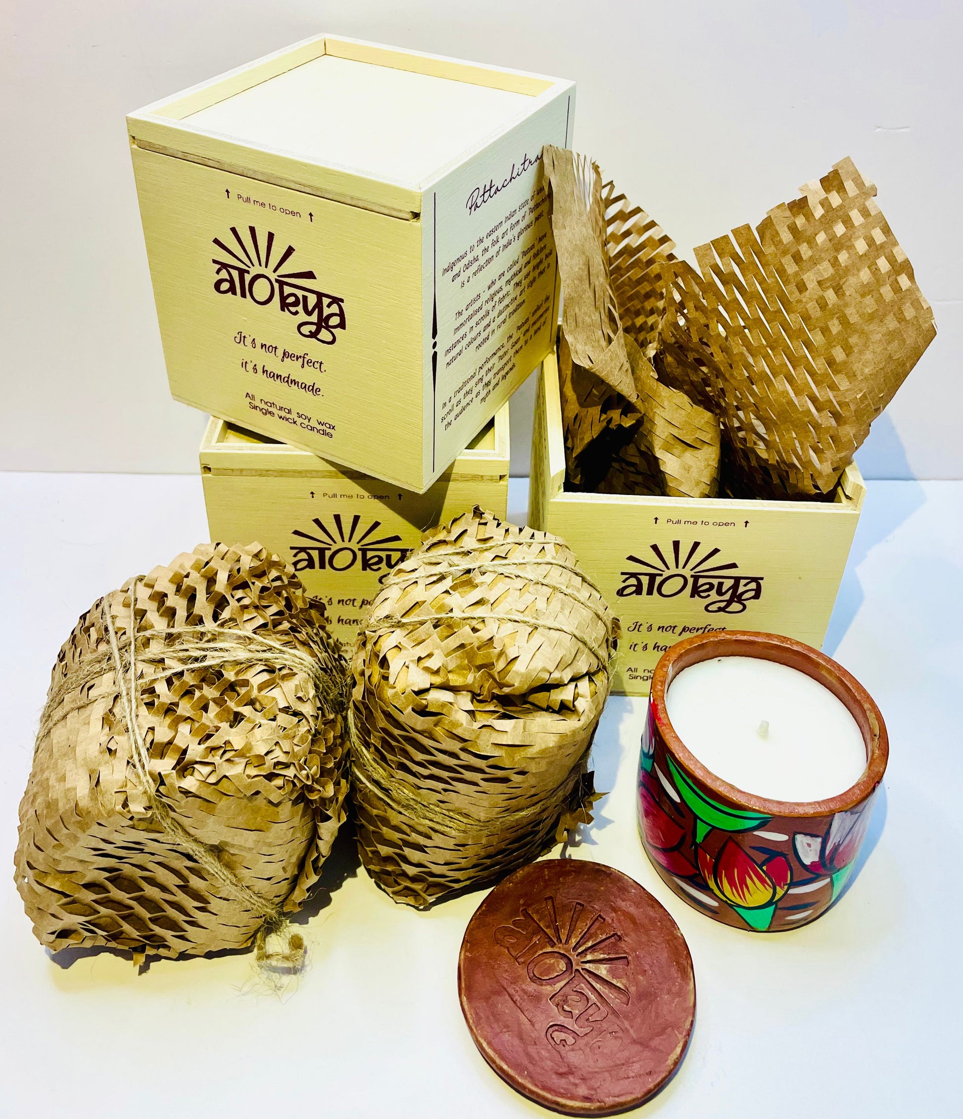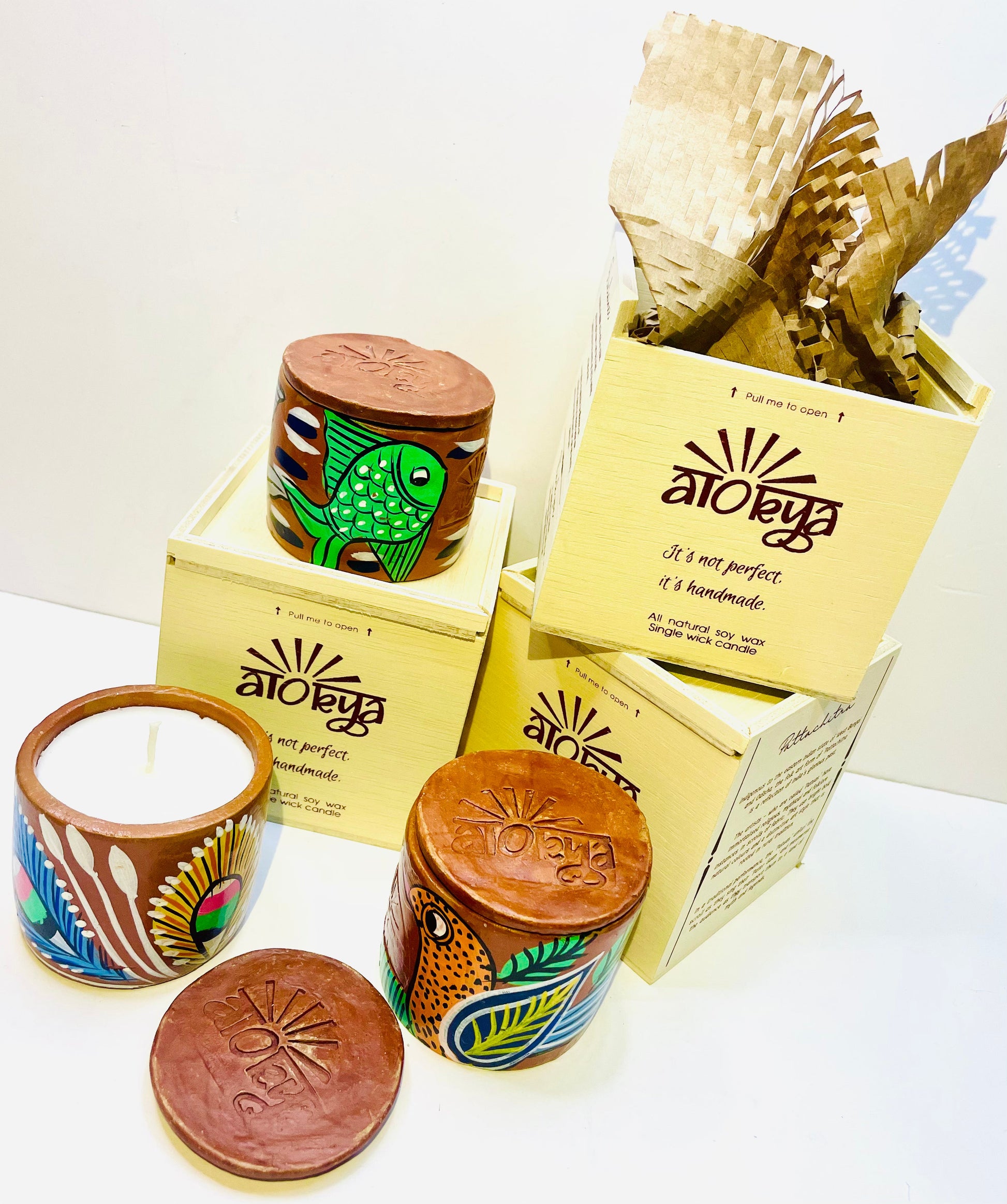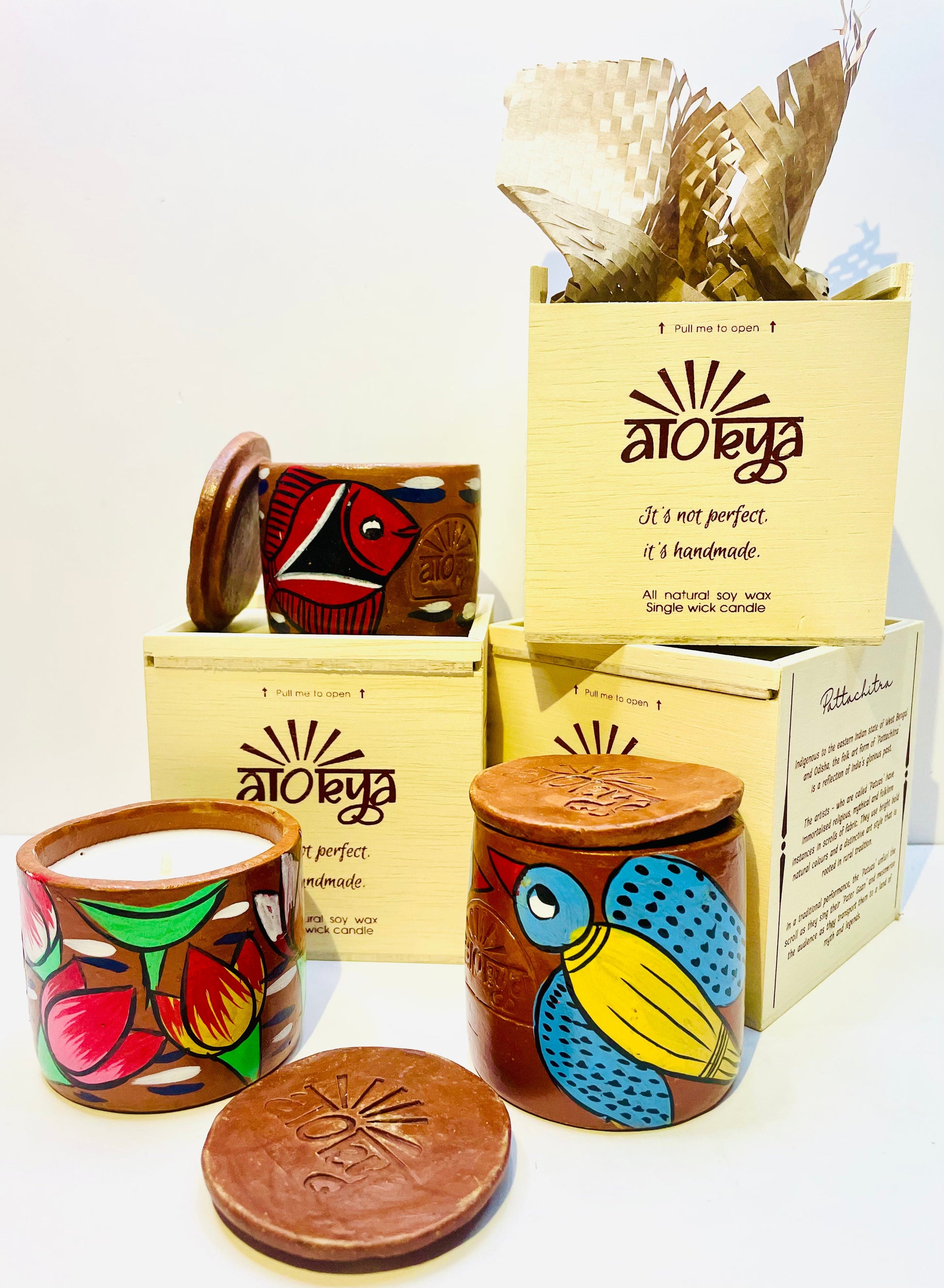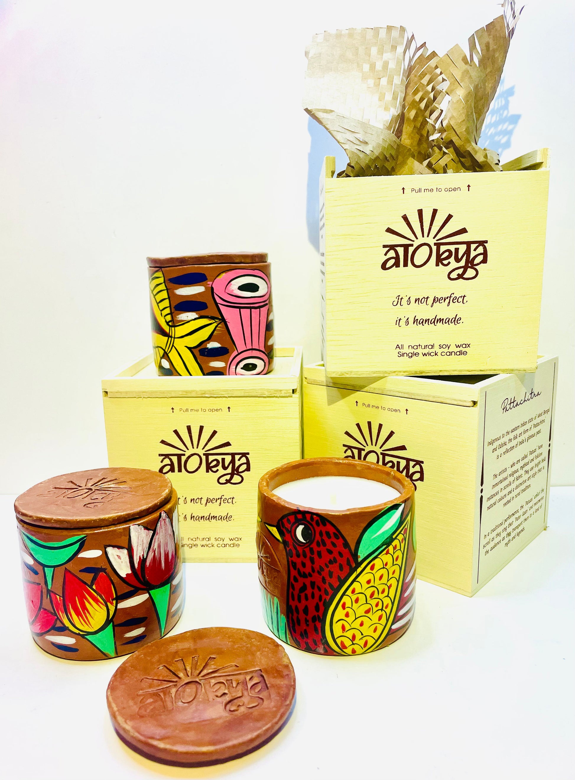 Our candles come in authentic Terracotta jars. We use 100% natural soy wax for the candle, which is hand poured in small batches. The wicks used are 100% cotton to ensure a clean burn.