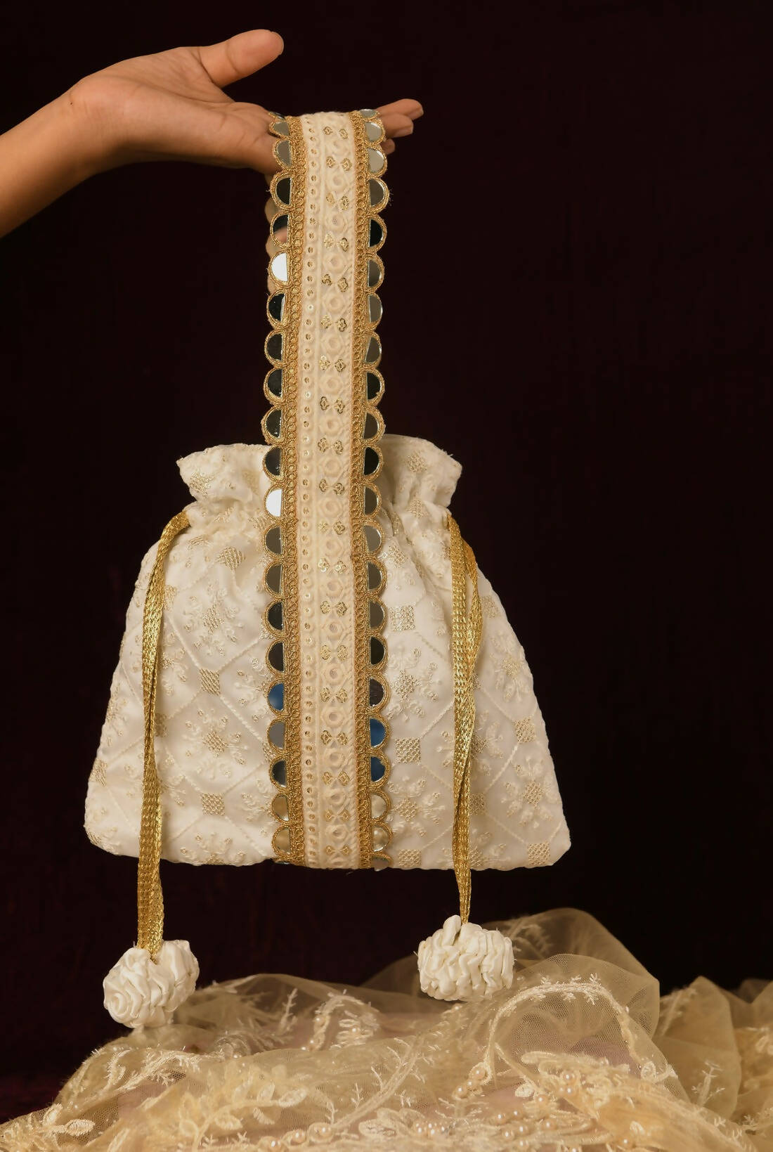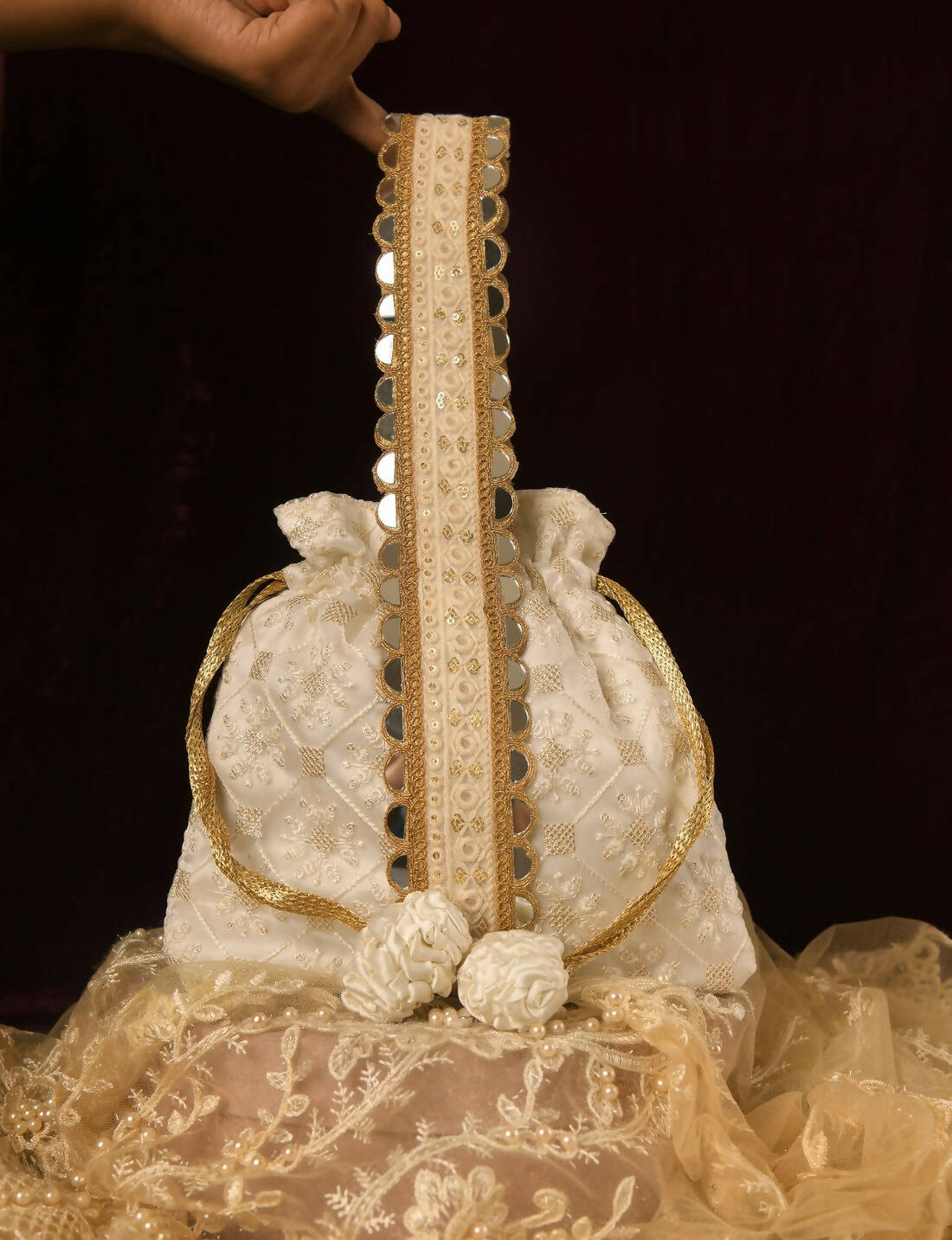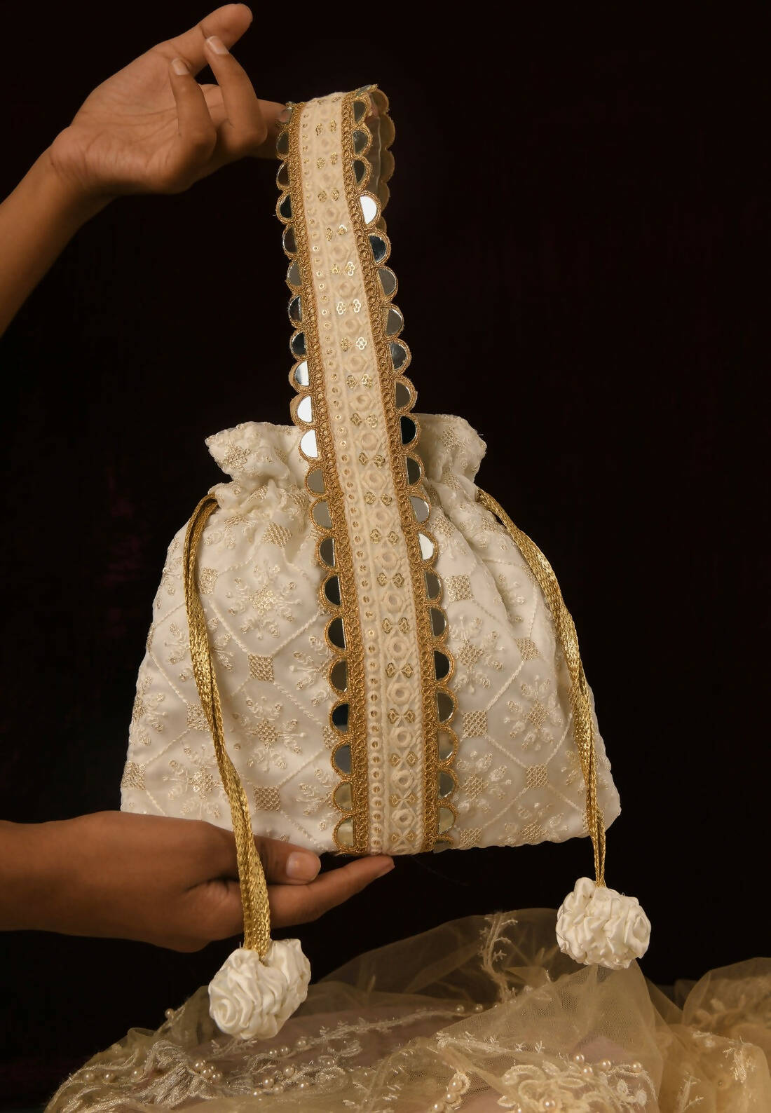 Experience the allure of our exquisite pristine white potli bag, boasting an intricately designed handle adorned with captivating mirror and thread work that makes it an undeniable show-stealer. Rest assured, we've thoughtfully integrated proper cushioning within, offering a haven of glasses and mobile safety, ensuring your valuables remain secure and well-protected. Dive into the realm of elegance with our remarkable collection of potli bags, where style meets functionality effortlessly.