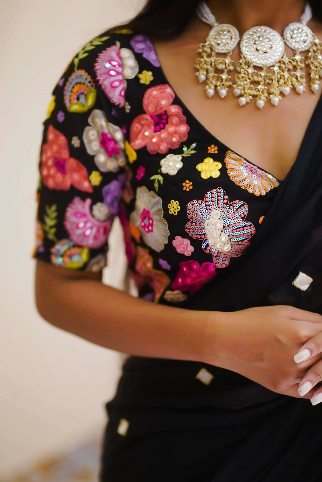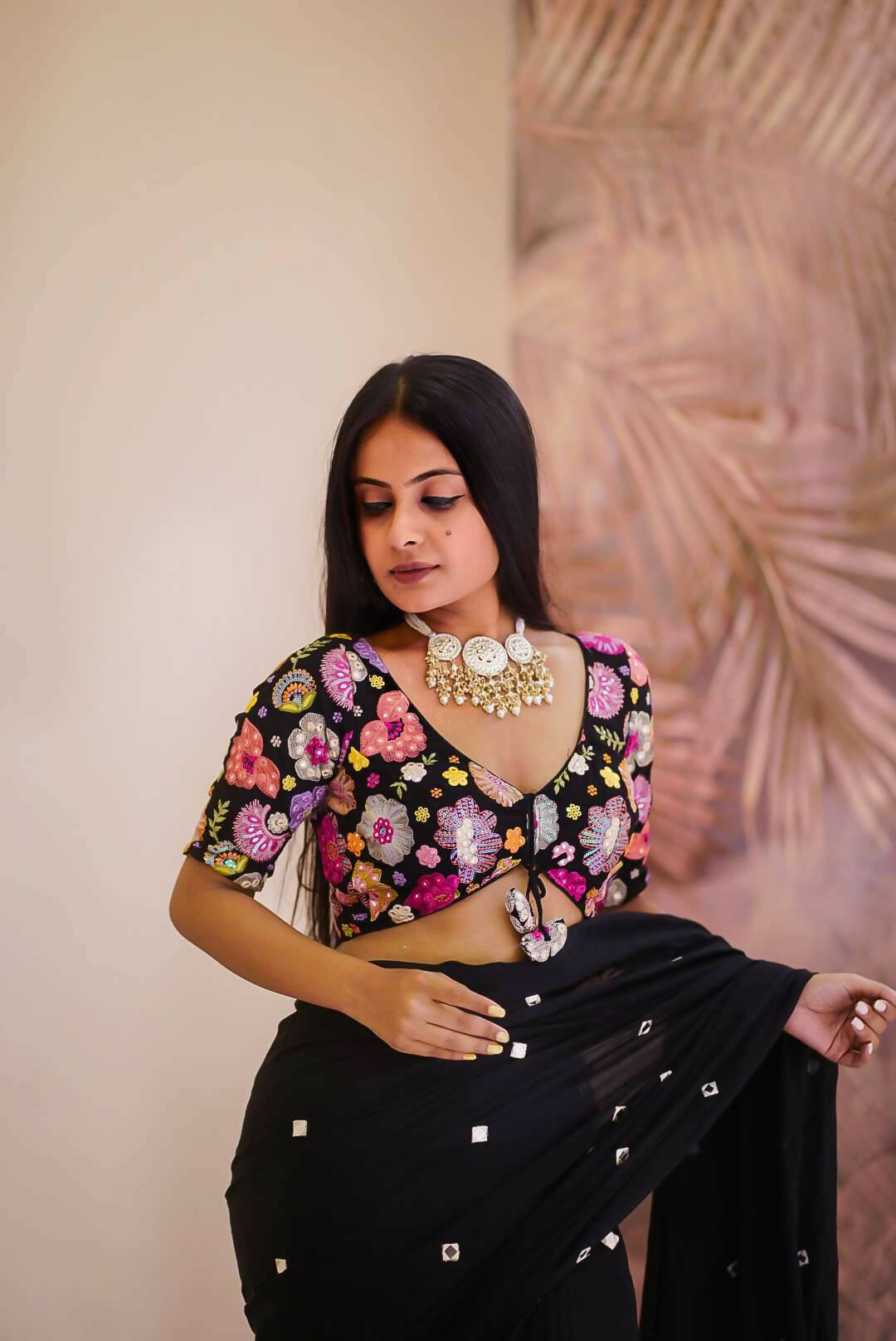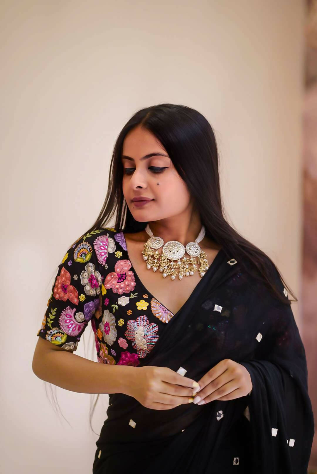 Elegantly designed to complement any saree, this blouse is a timeless fusion of tradition and style. Pair it with a monotone saree or go all over by pairing it with a contrast saree. This one will surely will be a statement piece in your wardrobe.
