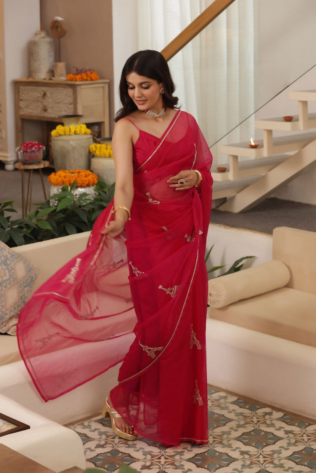 Celebrate romance and elegance with our Paris Love Saree, crafted from ethereal silk organza in a vibrant fuchsia pink. Adorned with delicate butterfly hand embroidery, this saree exudes a whimsical charm that’s perfect for weddings, festive celebrations, or any special occasion where you want to make a statement.