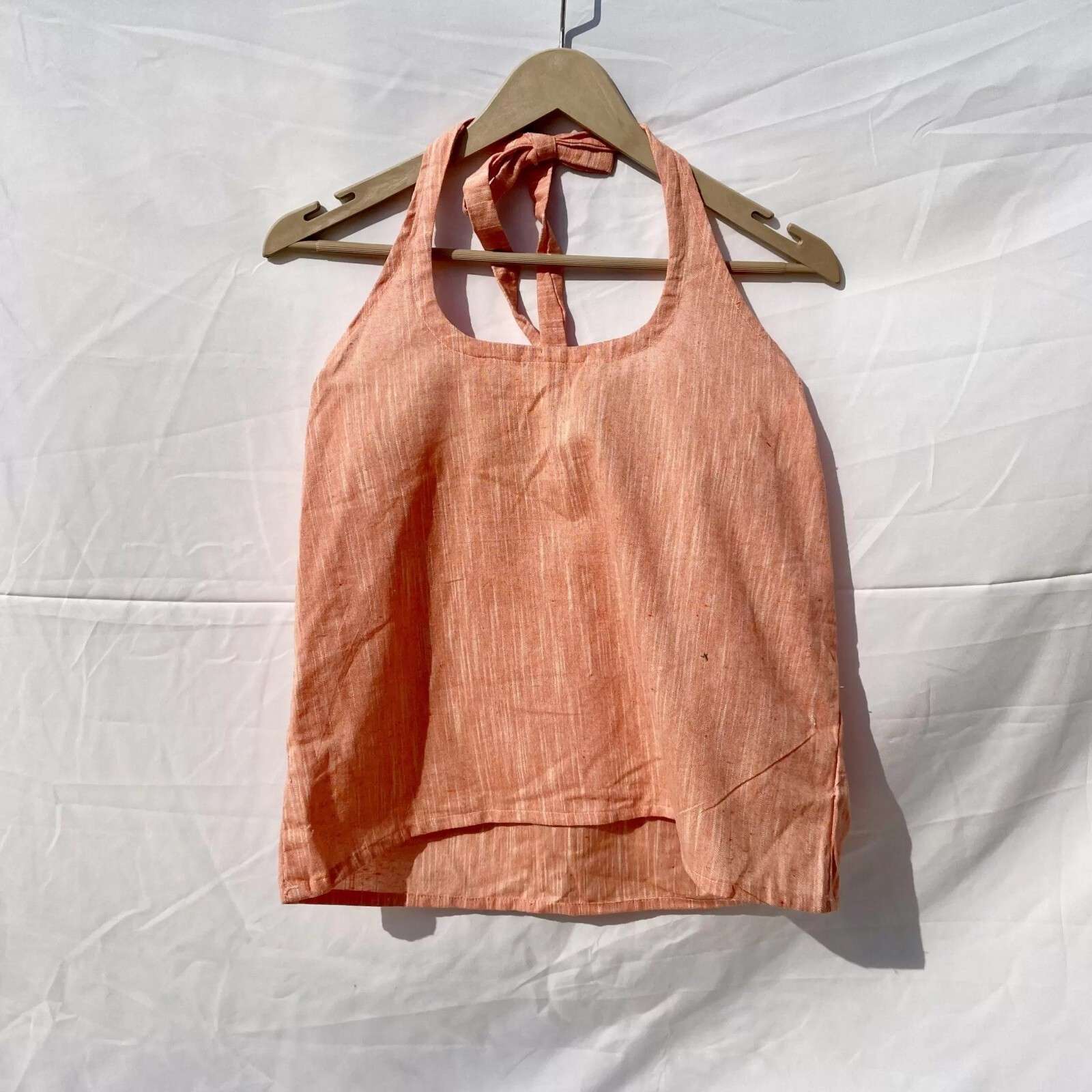 The Peach Round Halter Neck Khadi Cotton Top is a chic and timeless piece crafted from breathable Khadi cotton. Its soft peach color adds a subtle touch of warmth, while the round halter neck design brings a stylish, contemporary twist. Perfect for casual outings or relaxed gatherings, this top combines comfort with elegance.