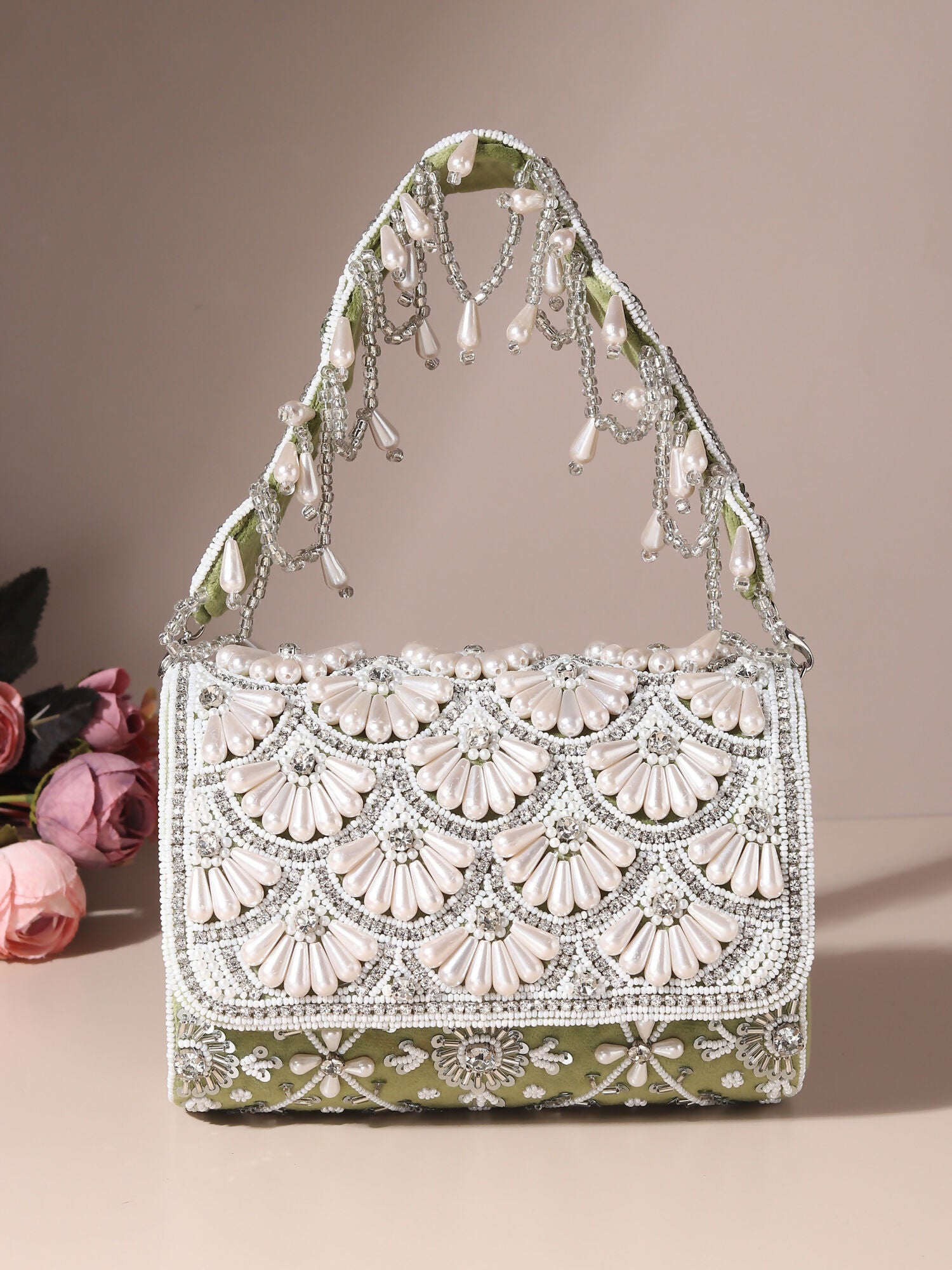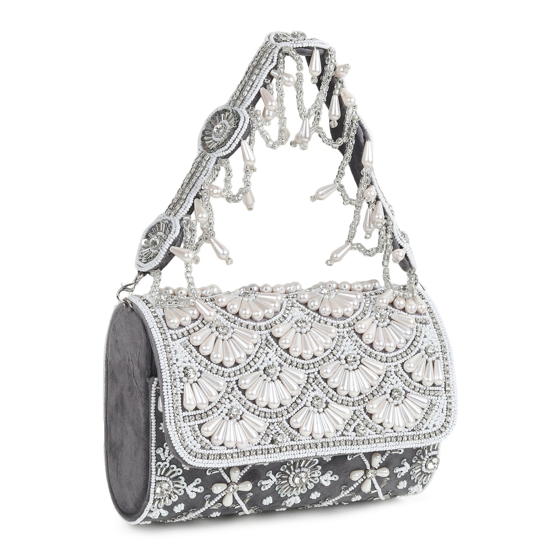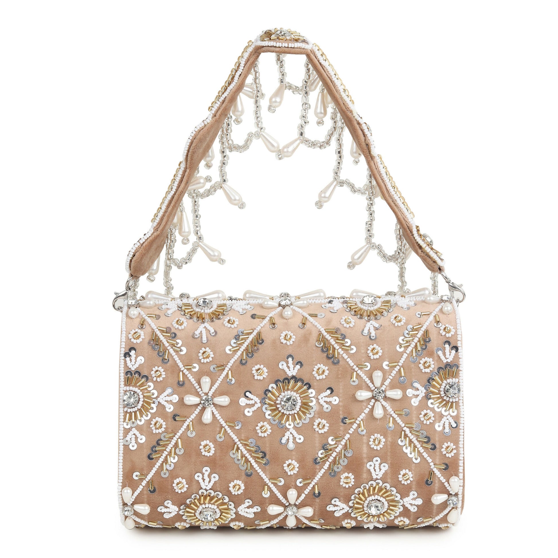 The Pearl Accent Flap Bag radiate timeless elegance, adorned with meticulously arranged pearl and stone embellishments that catch the light in all the right ways. The intricately embroidered handle elevates the design, adding a refined layer of craftsmanship. This perfect blend of luxury and sophistication ensures an effortlessly chic style that complements any high-end ensemble.