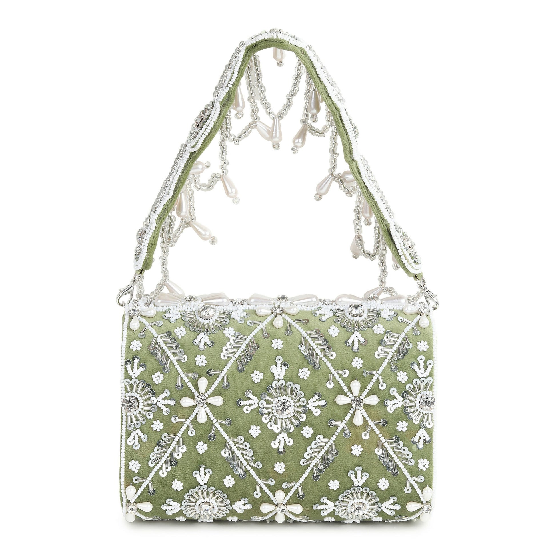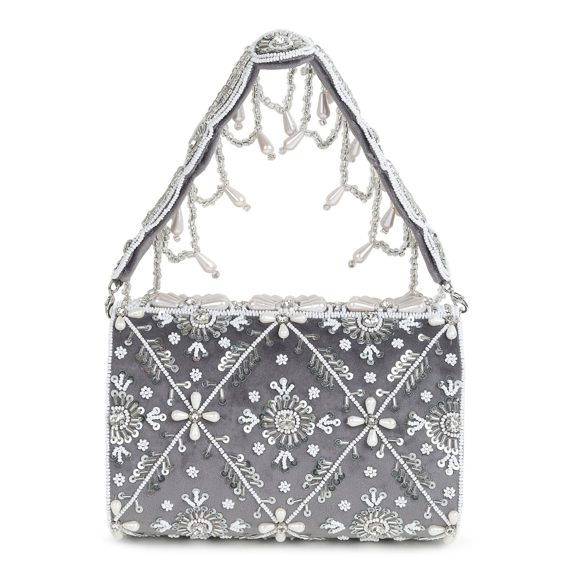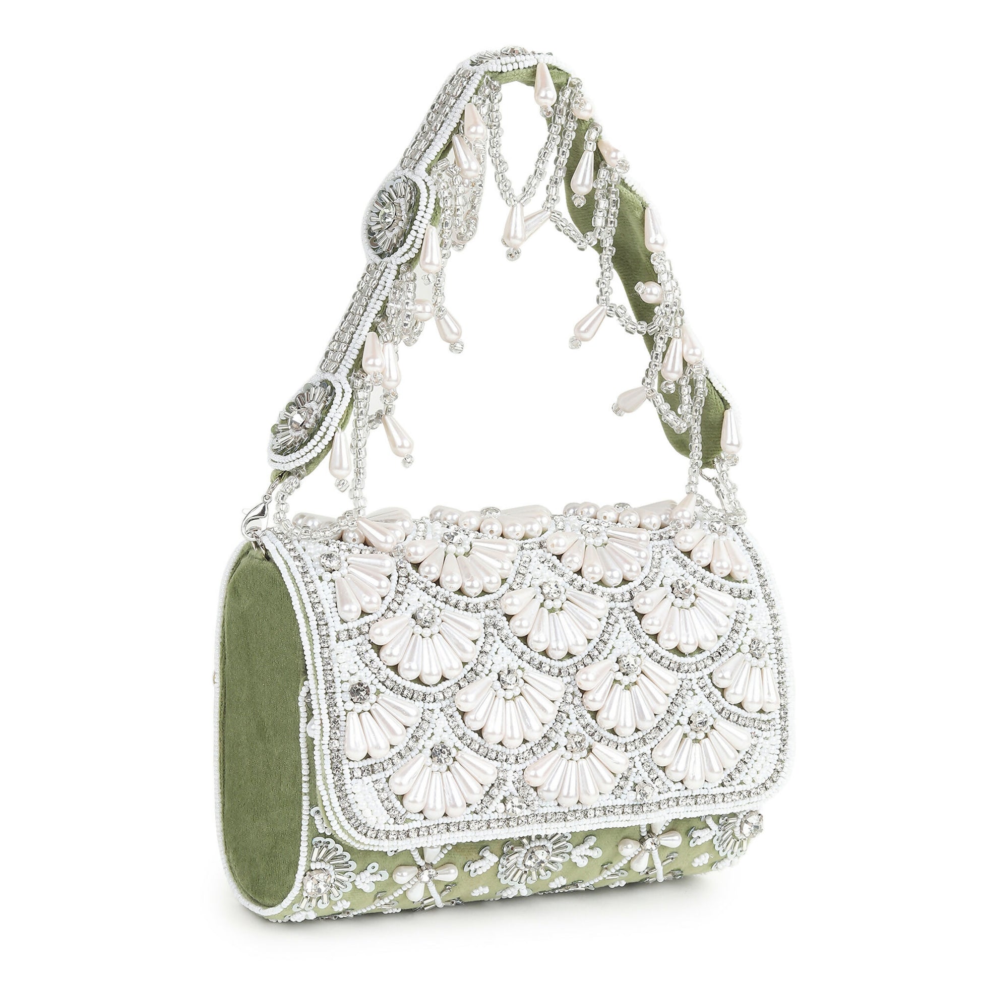 The Pearl Accent Flap Bag radiate timeless elegance, adorned with meticulously arranged pearl and stone embellishments that catch the light in all the right ways. The intricately embroidered handle elevates the design, adding a refined layer of craftsmanship. This perfect blend of luxury and sophistication ensures an effortlessly chic style that complements any high-end ensemble.