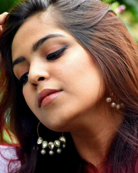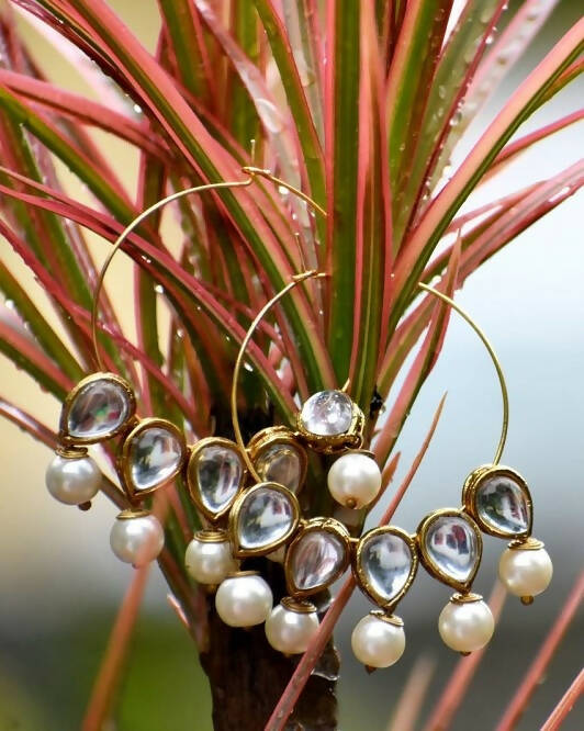 Go for a full glamour look in these pearl and kundan hoop earrings! Drop-shape kundan beads are threaded in a metal hoop, with a swaying pearl at the end of each bead. Pair these earrings with an ethnic outfit for a divinely elegant look.