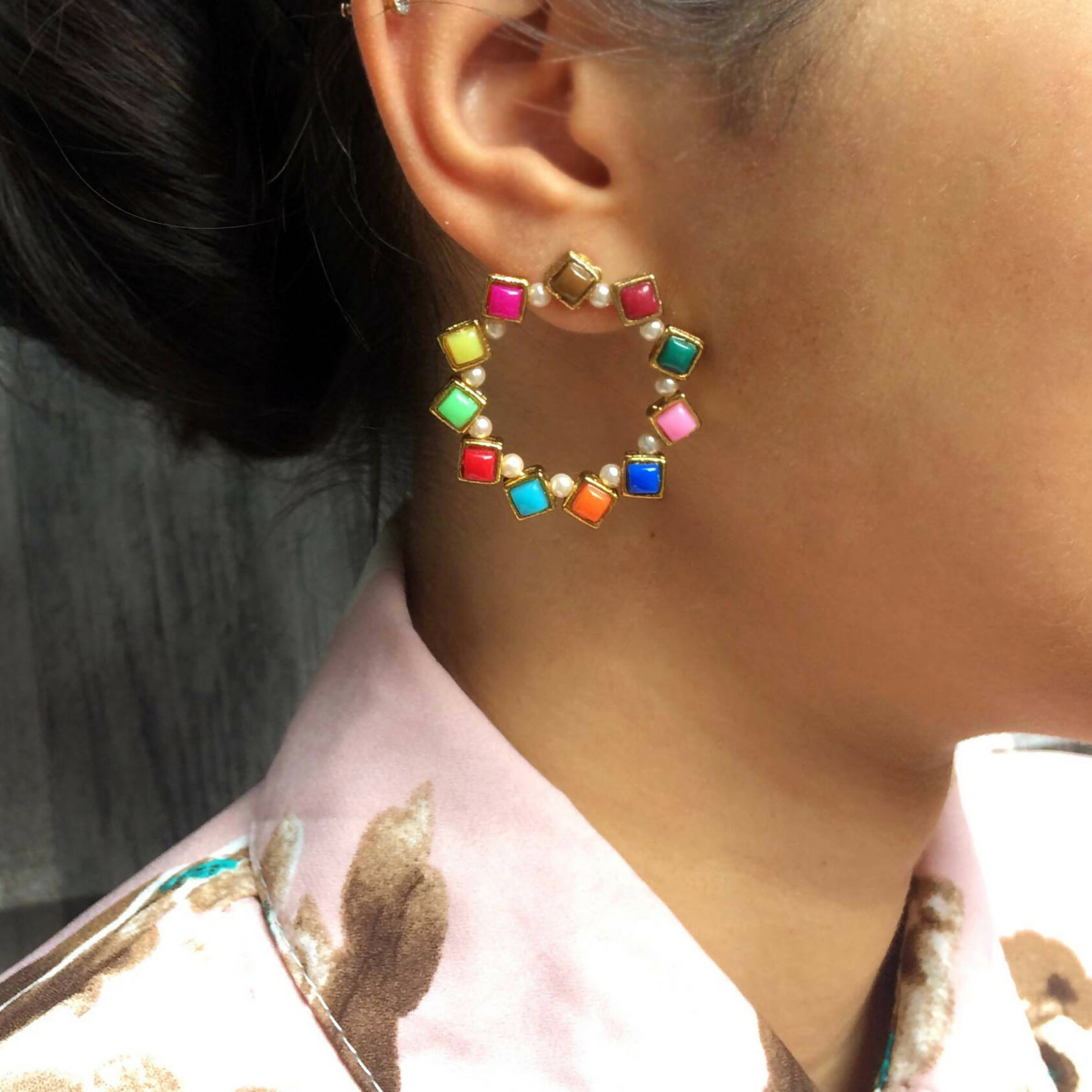 Bring the fun to the scene when you wear our Pearl and Resin Multicolored Hoop! Medium-sized metal hoop earrings are decorated with multicolored resin stones, with little pearls adorning the edges.