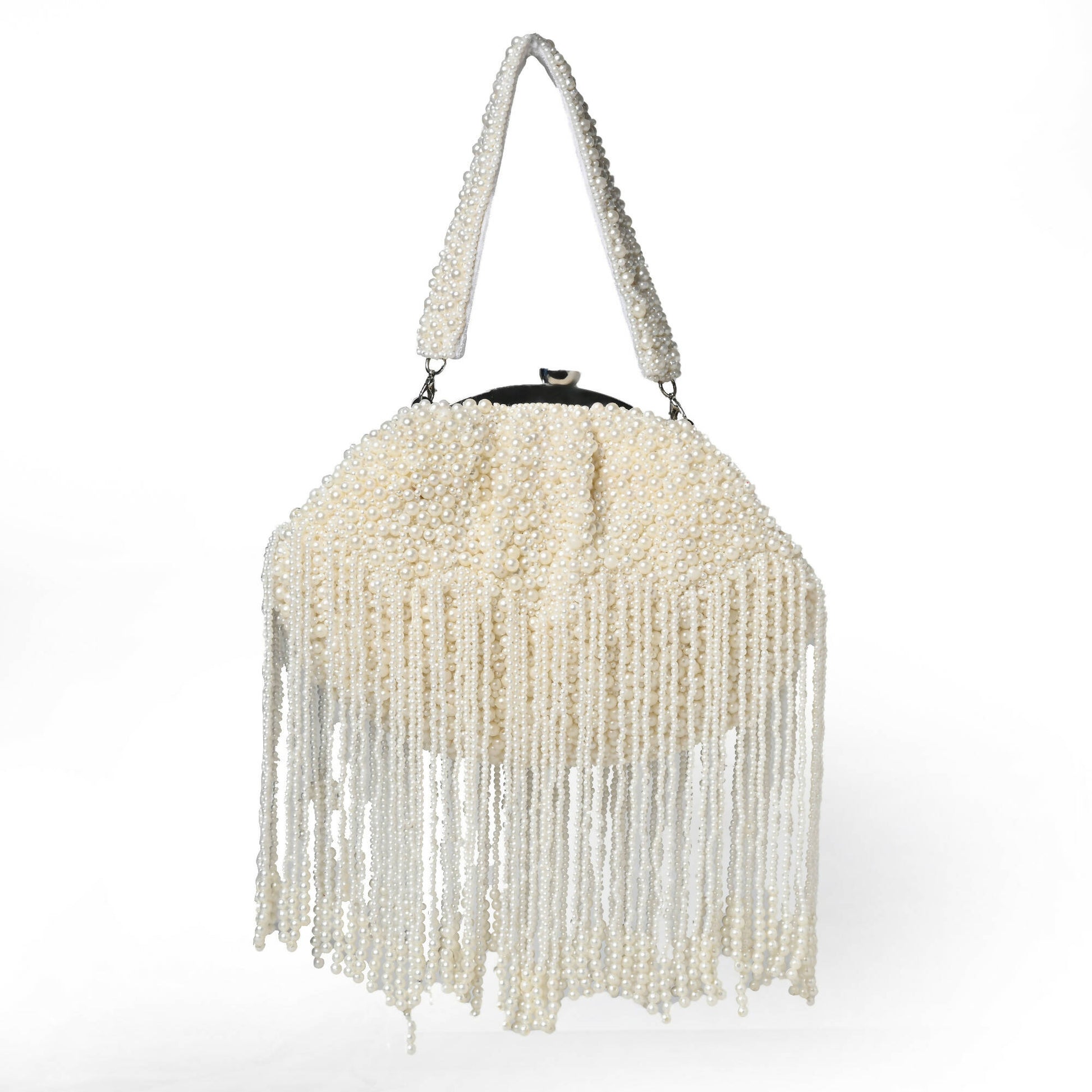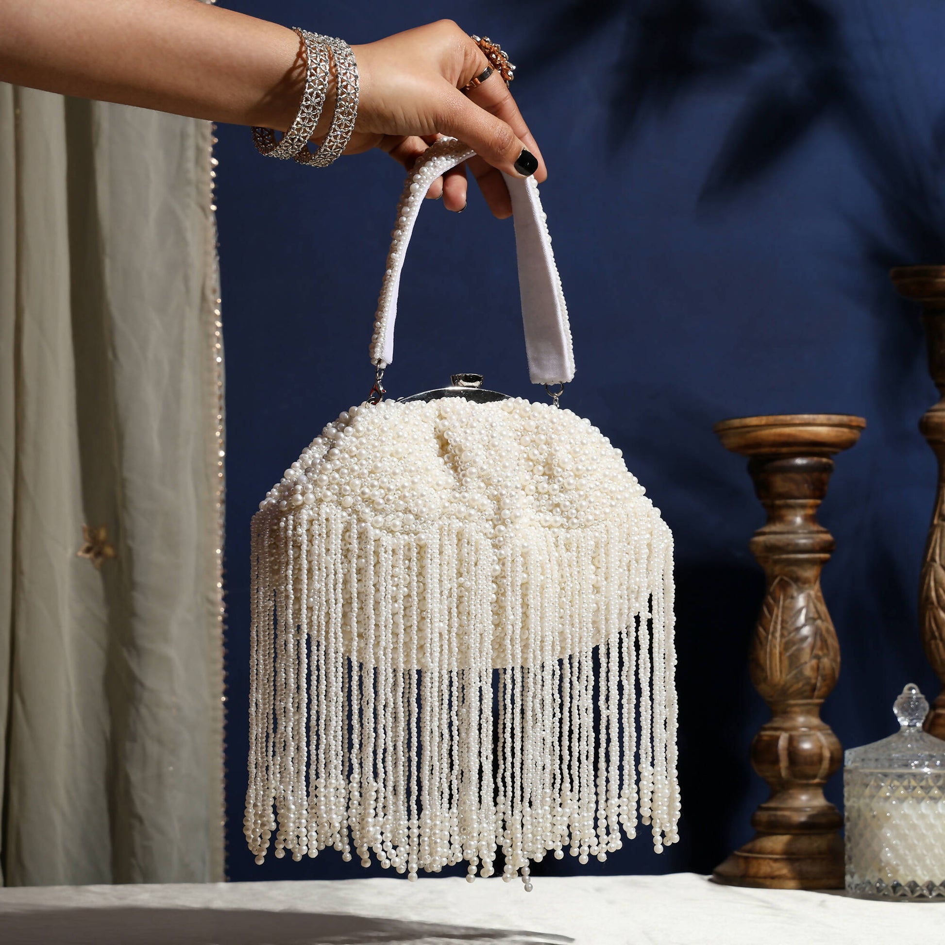 White Pearl Batua Bag, featuring a delicately embroidered short handle and charming tassels for added flair.