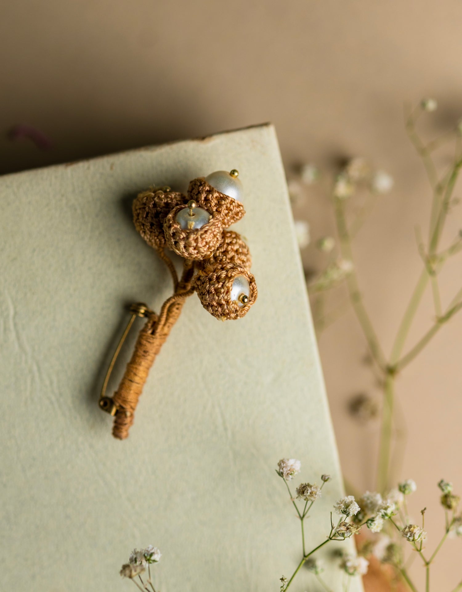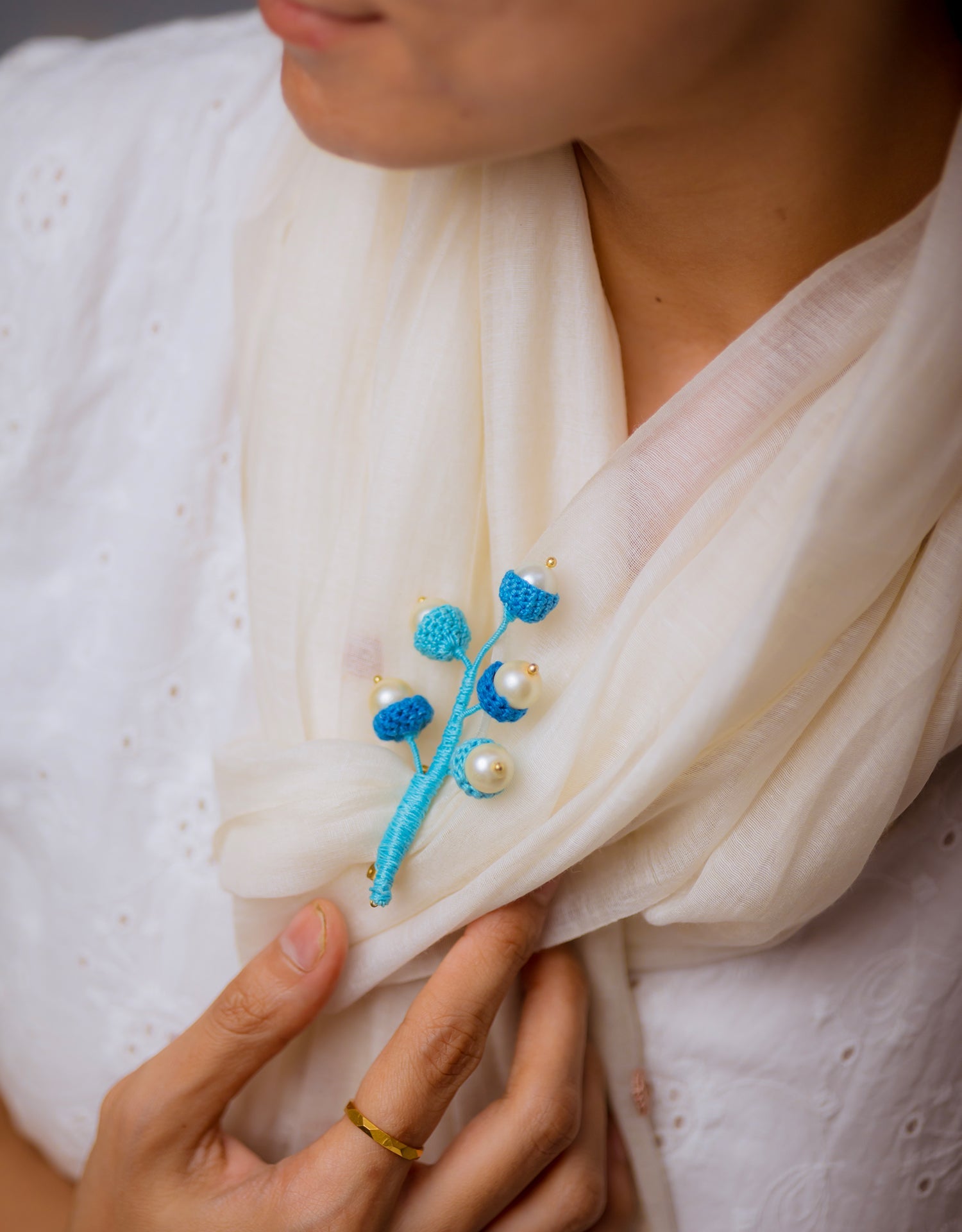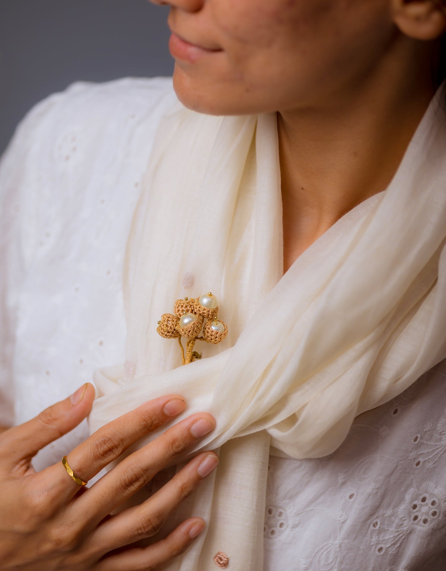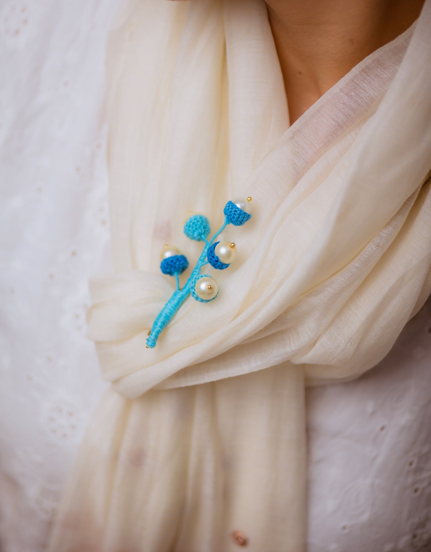Materials: Cotton thread, Brass, Pearl moti, Brooch pin