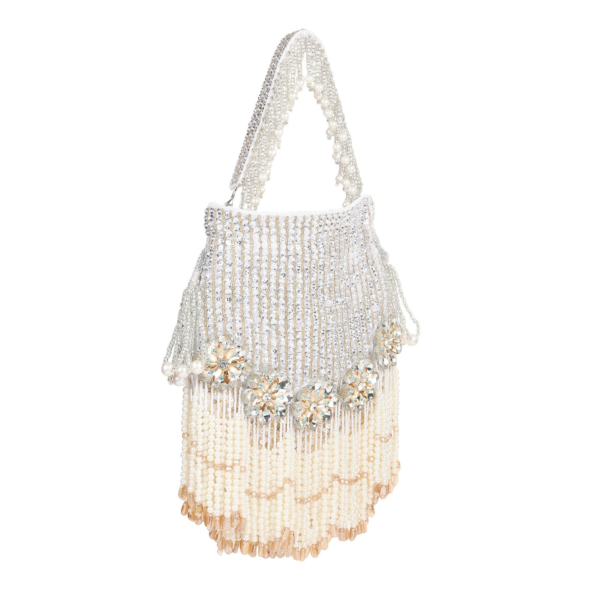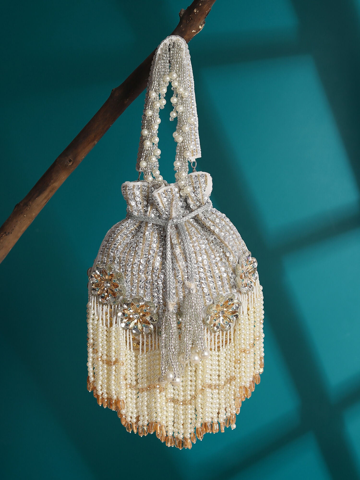 Introducing the Pearl Luster Potli, a delightful fusion of sophistication and charm. Adorned with stylish studs and playful tassels, this potli bag adds a touch of elegance to any ensemble. The short embroidered handle not only enhances its aesthetic appeal but also provides comfortable carrying. Perfect for elevating ethnic or fusion outfits at special events, this exquisite accessory is a must-have for those who appreciate timeless style and vibrant flair.