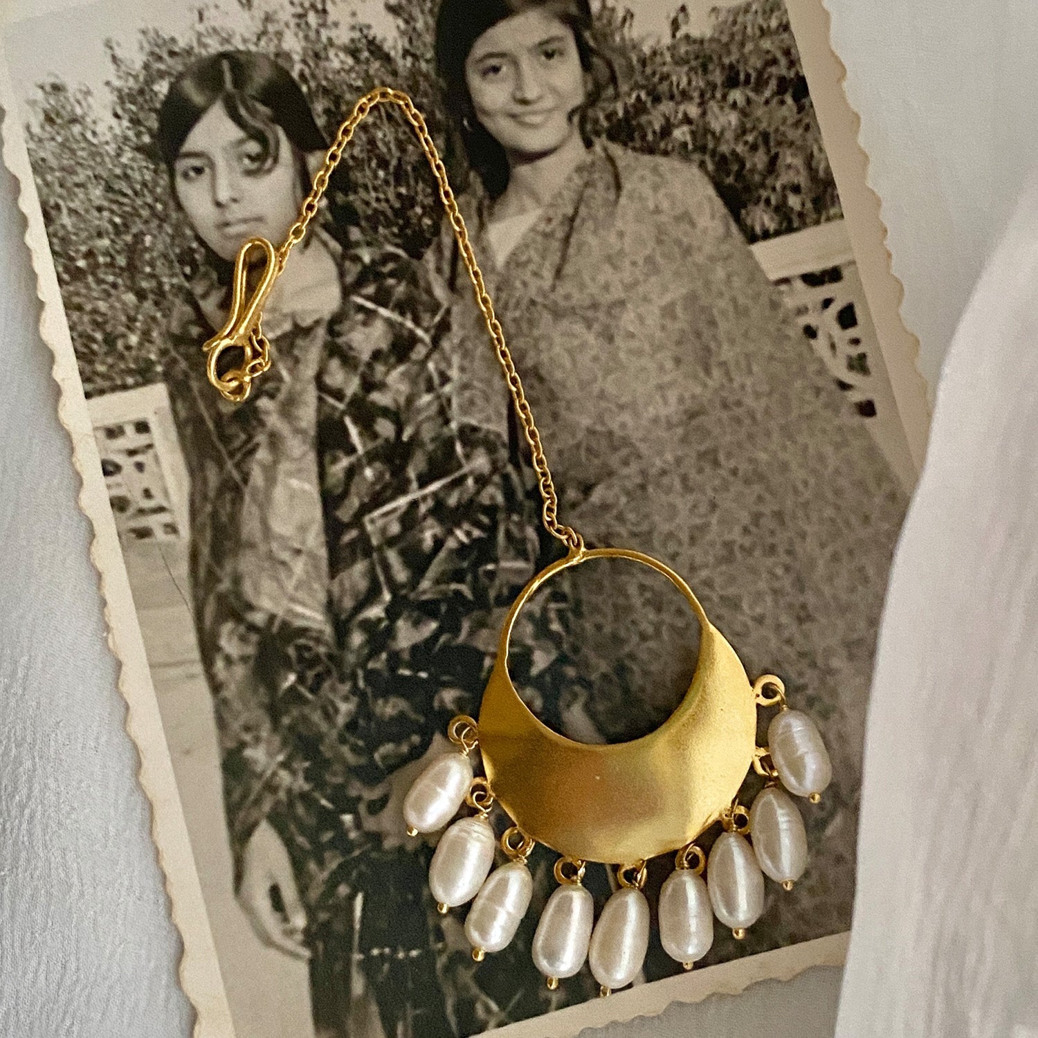 Add a touch of timeless elegance to your ensemble with the Pearl Noor Maangtikka. Crafted from hallmarked 92.5 fine silver and plated with radiant gold, this maangtikka features lustrous pearls that enhance its classic appeal. Designed as a traditional forehead ornament, it offers a subtle yet sophisticated cultural elegance.