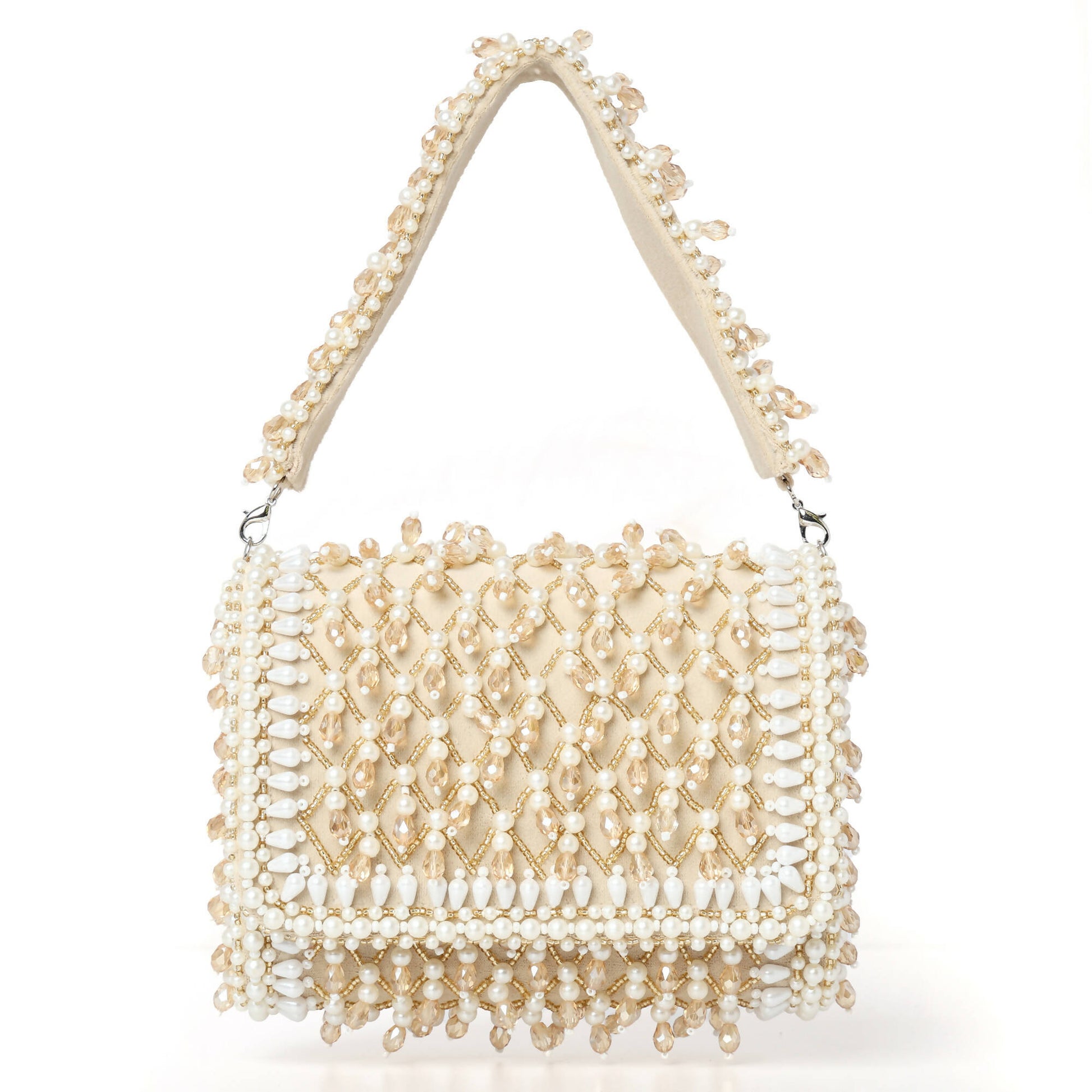 Beige Flap Bag, crafted on suede with pearls and crystals. Includes a detachable short handle for easy carrying.