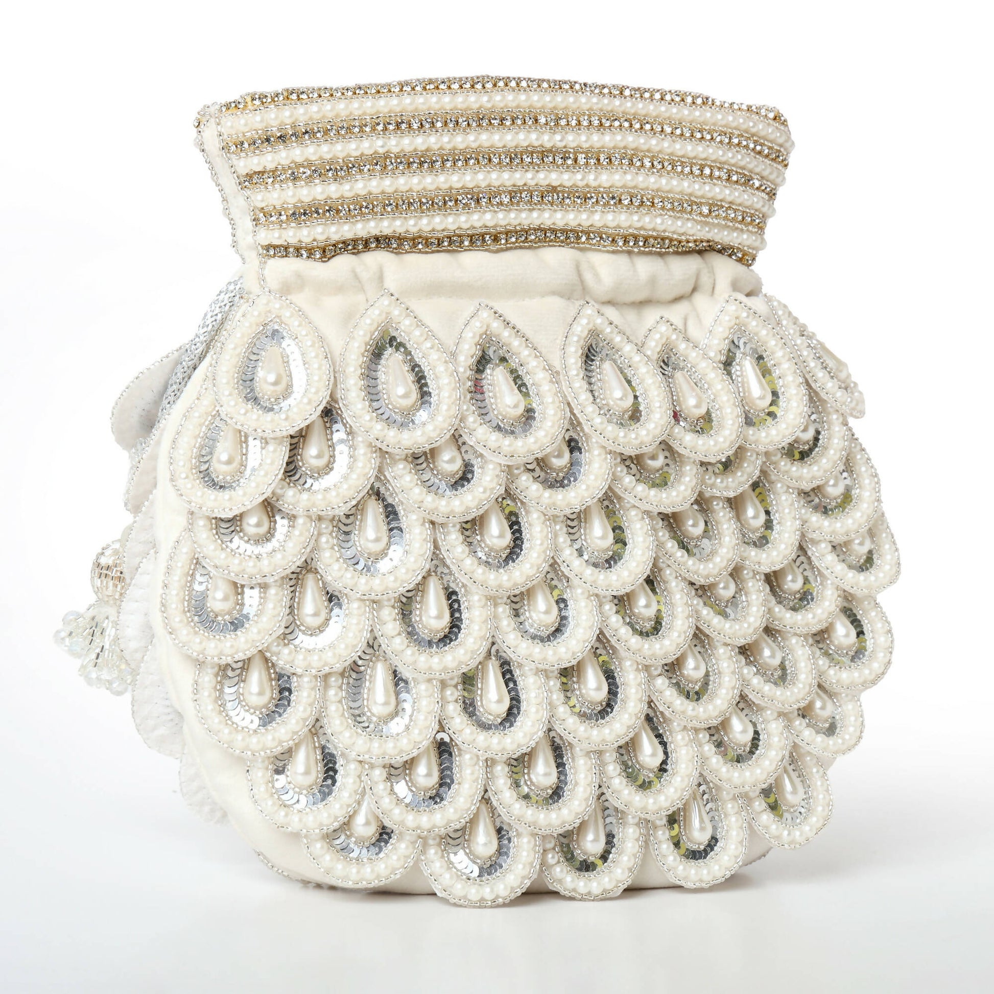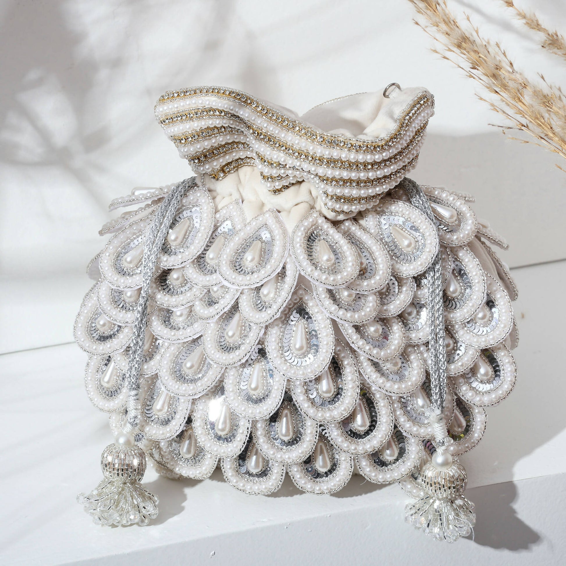 White Suede Base Potli Bag, adorned with a captivating leaf pattern crafted from pearls. This chic accessory comes with an embroidered short handle for effortless elegance.