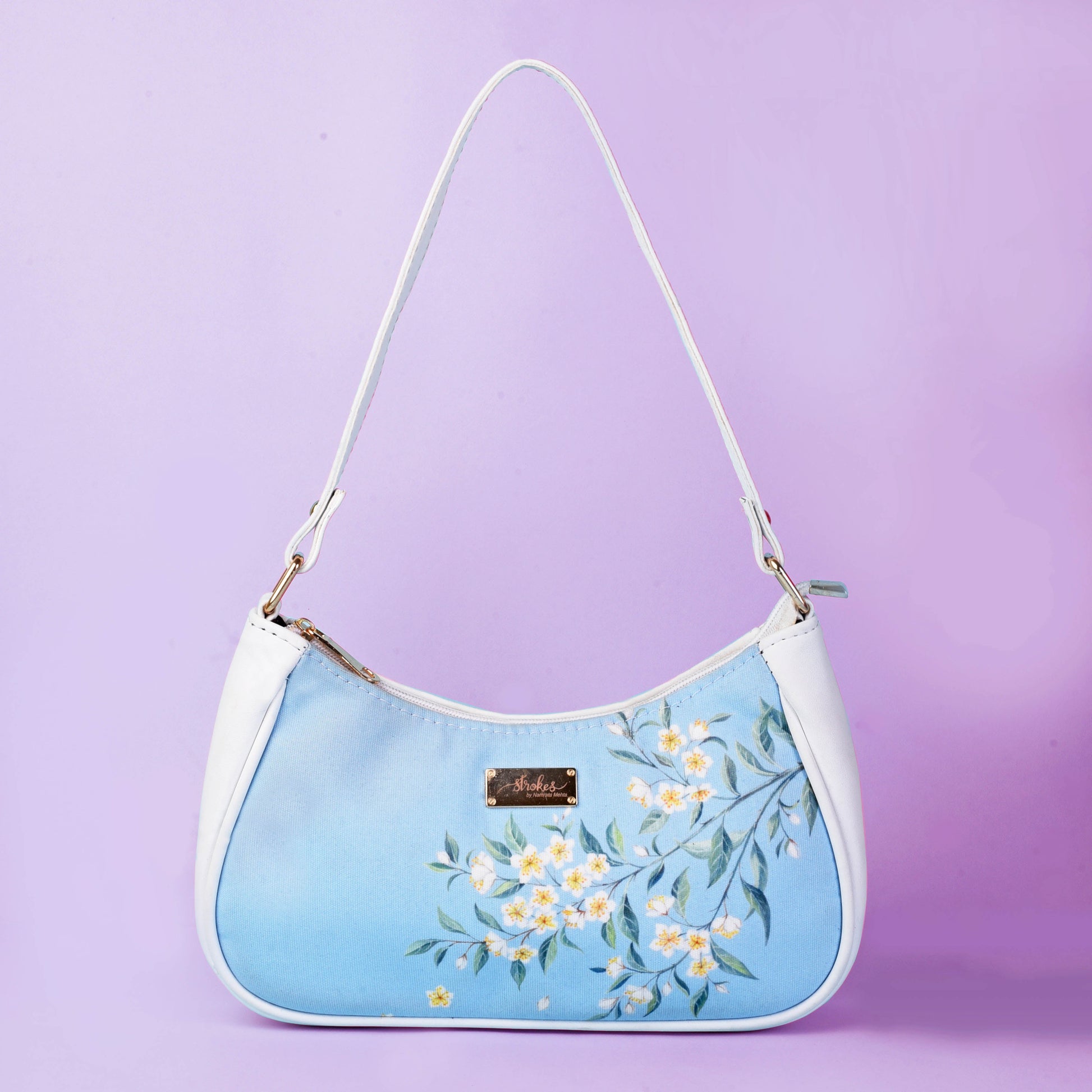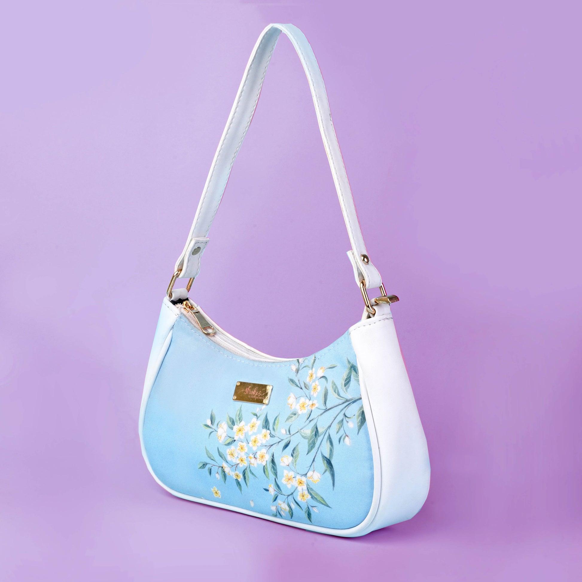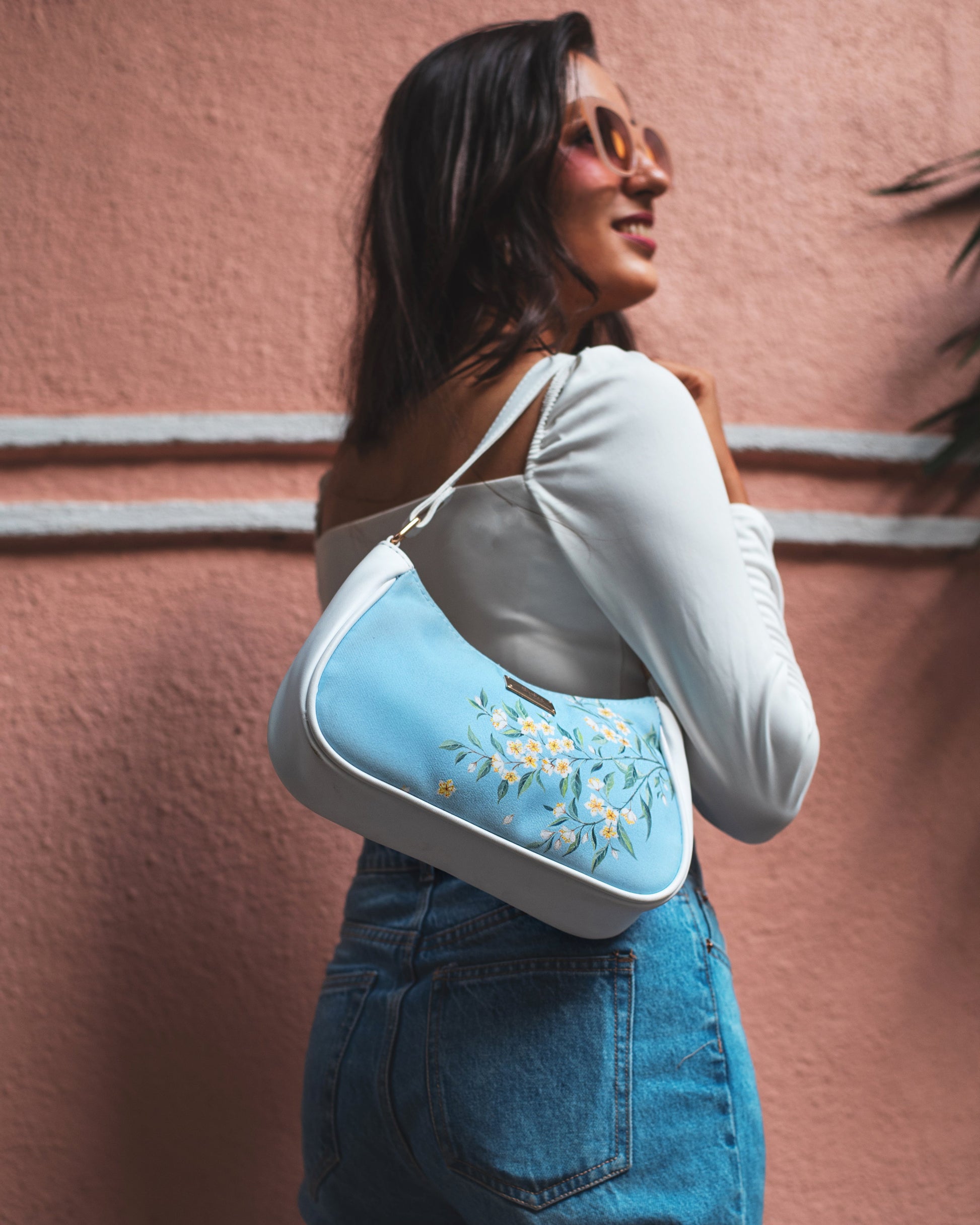 A beautiful illustration of delicate florals/leaves on a pastel blue background is perfect to elevate any look and also makes a great gift!