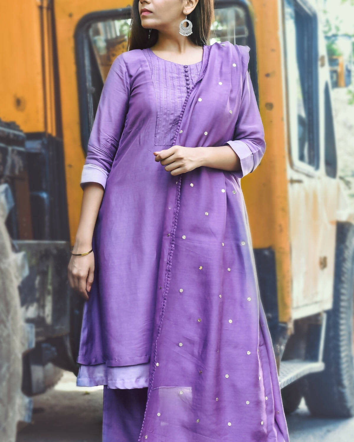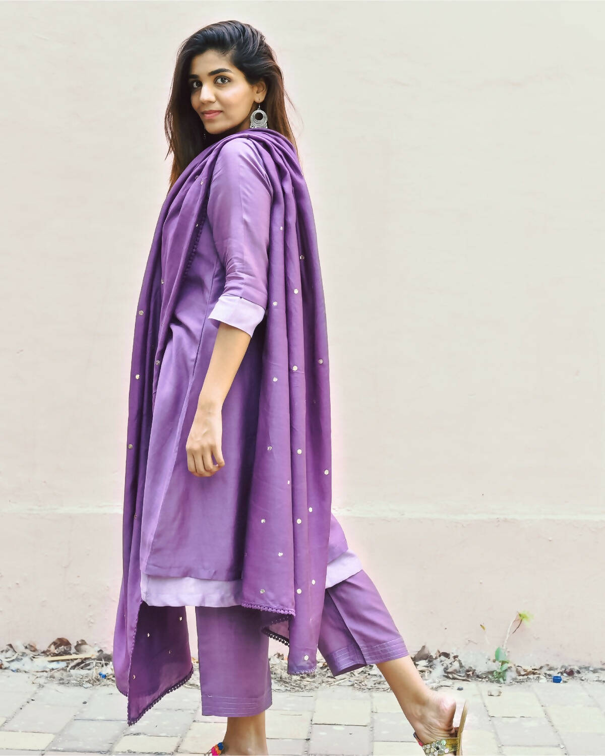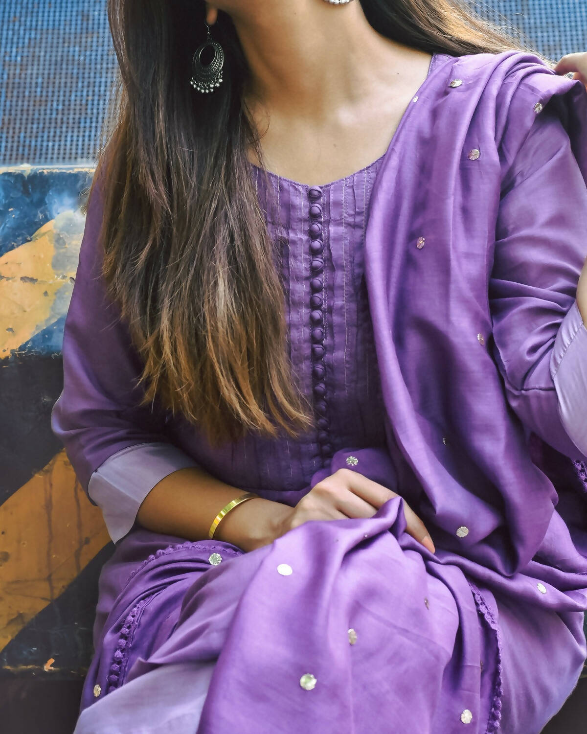 A periwinkle and radiant orchid double-layered muslin top paired with muslin pants and an elegant dupatta with mukeish work and beautiful edging, making it a perfect set for any occasion this summer. Style it for a casual event or pair it with heavy jewellery for an intimate gathering.