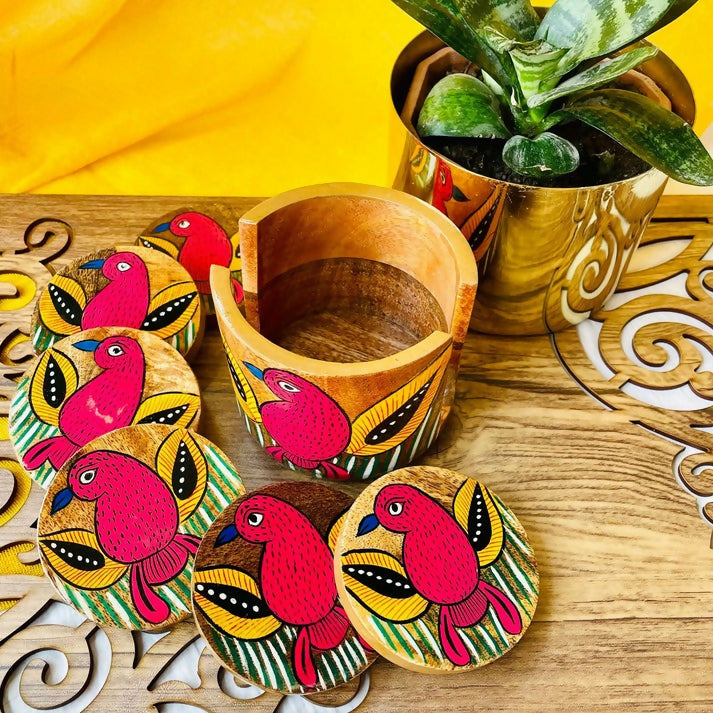 The wooden coasters capture two incredible artworks of India. Mirroring the woodwork of Saharanpur, the coaster is a depiction of excellent craftsmanship. The embellishment done with Pattachitra motifs perfectly holds the intricate hand movements of Pattachitra artists.Carved from native mango wood, the handcrafted wooden coasters, completely plastic-free and metal-free, give a sustainable and artistic twist to your personal space