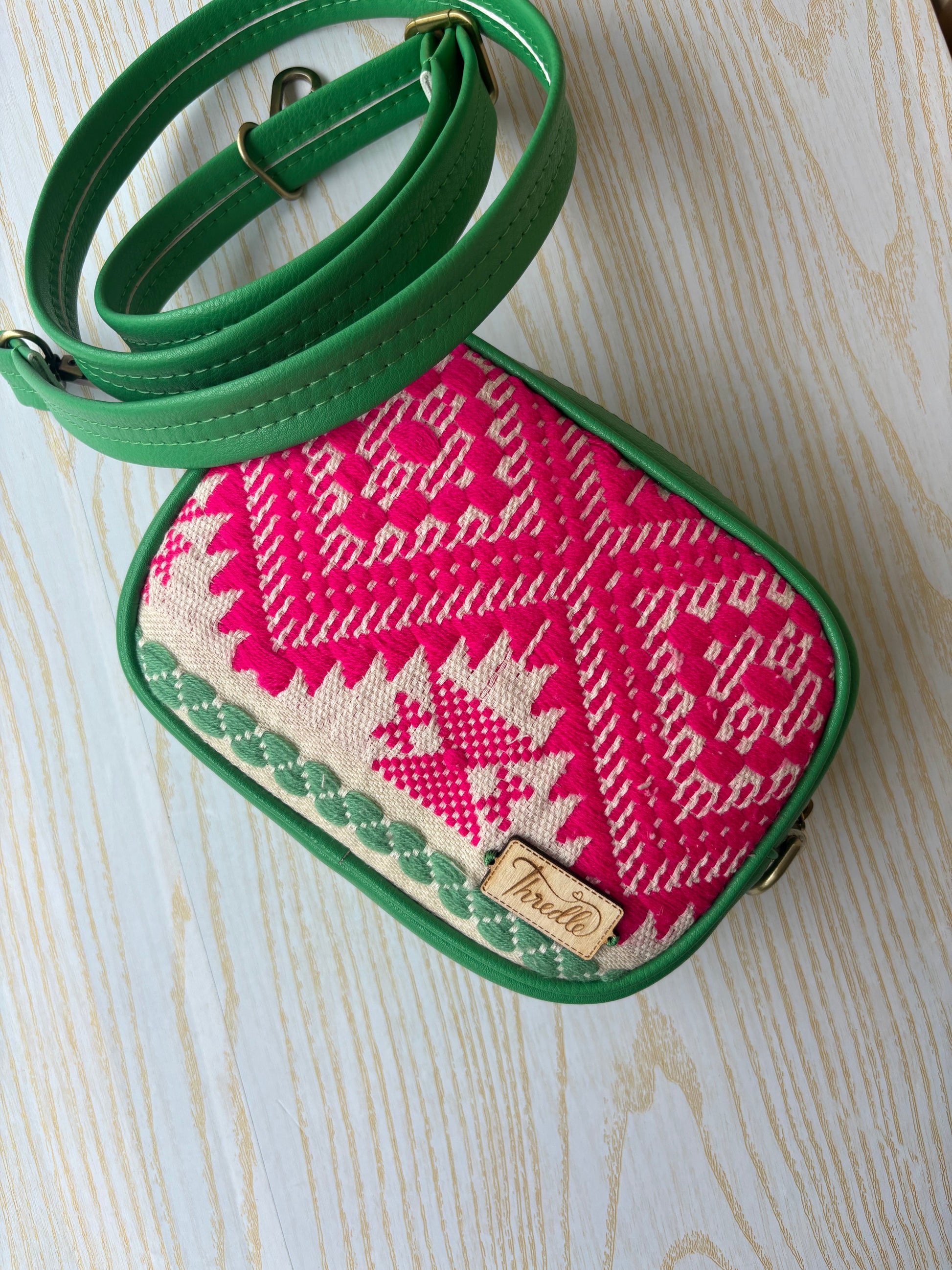 Bold and playful, this handcrafted sling bag features vibrant pink embroidery set against a cream base, framed with striking green faux leather. Compact yet eye-catching, it’s perfect for adding a pop of color and culture to your everyday look.