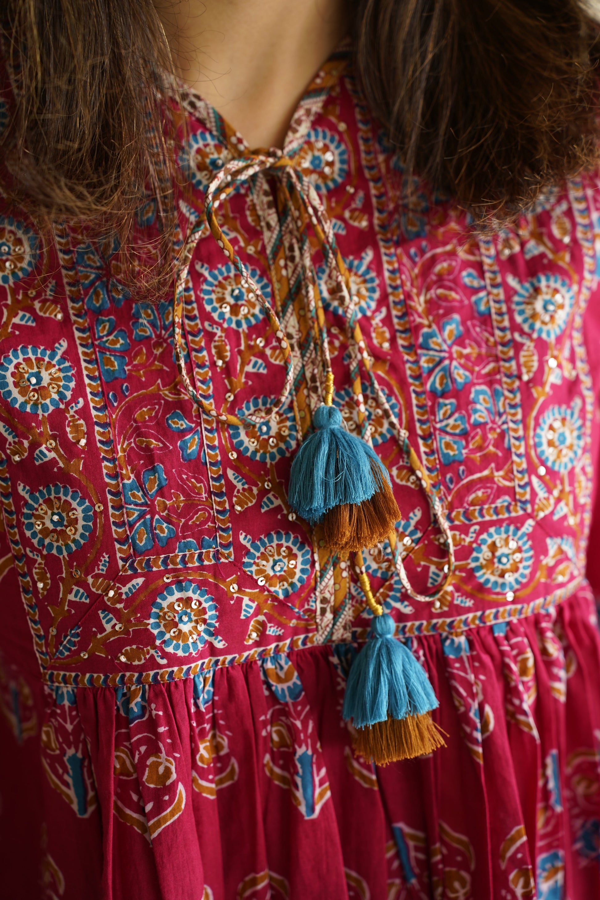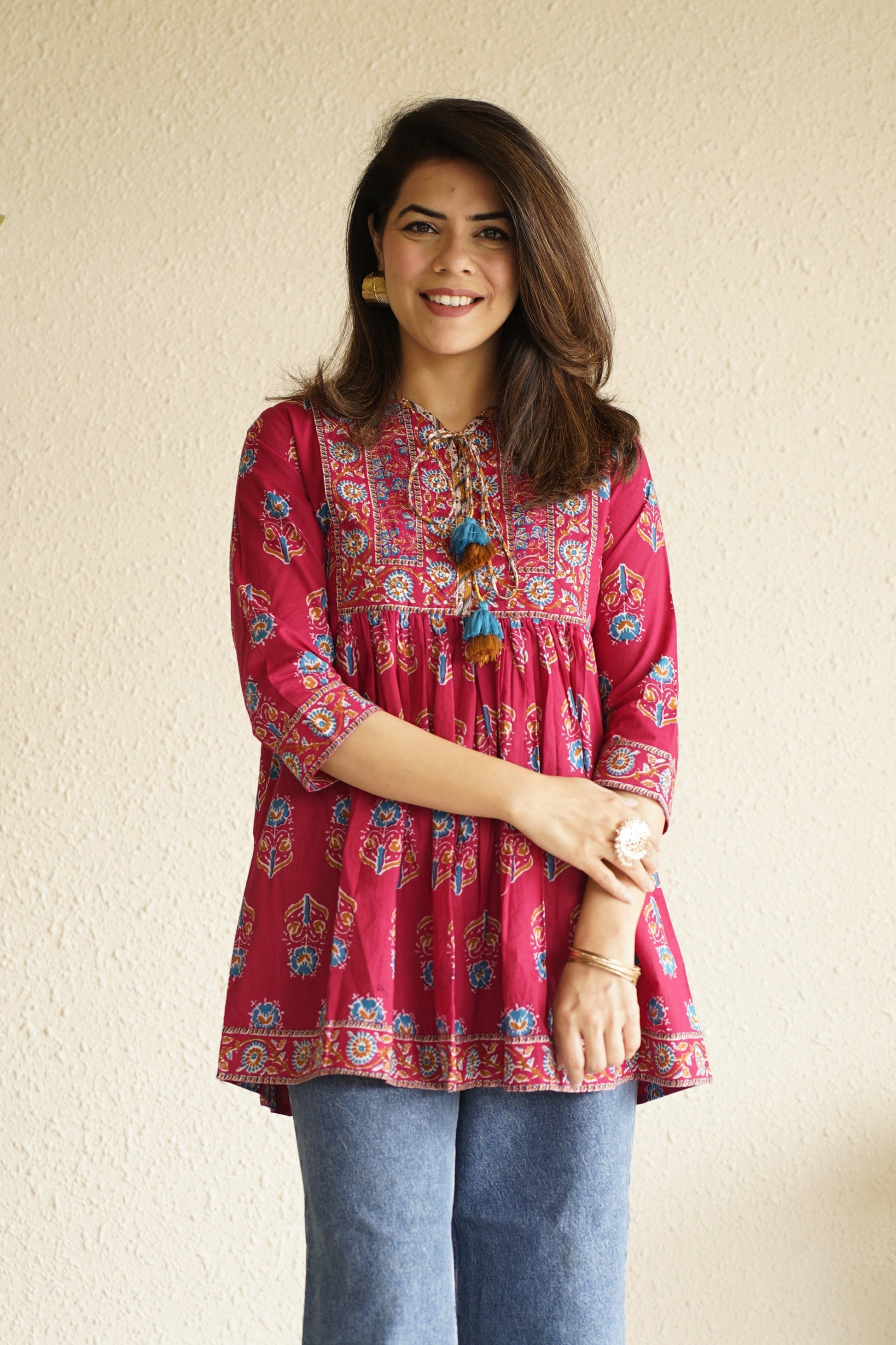 Pink Floral Printed Pure Cotton Sequinned Kurti