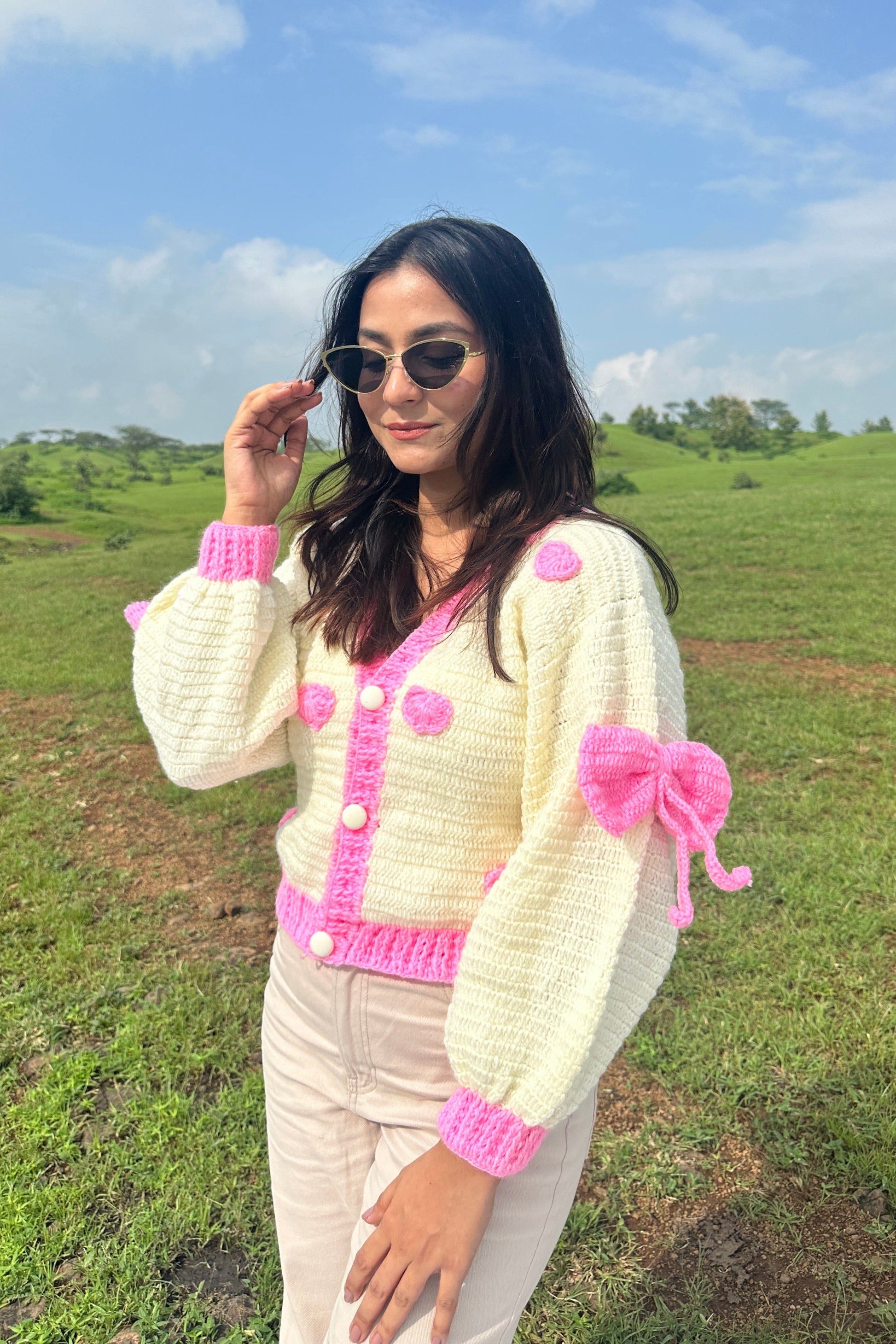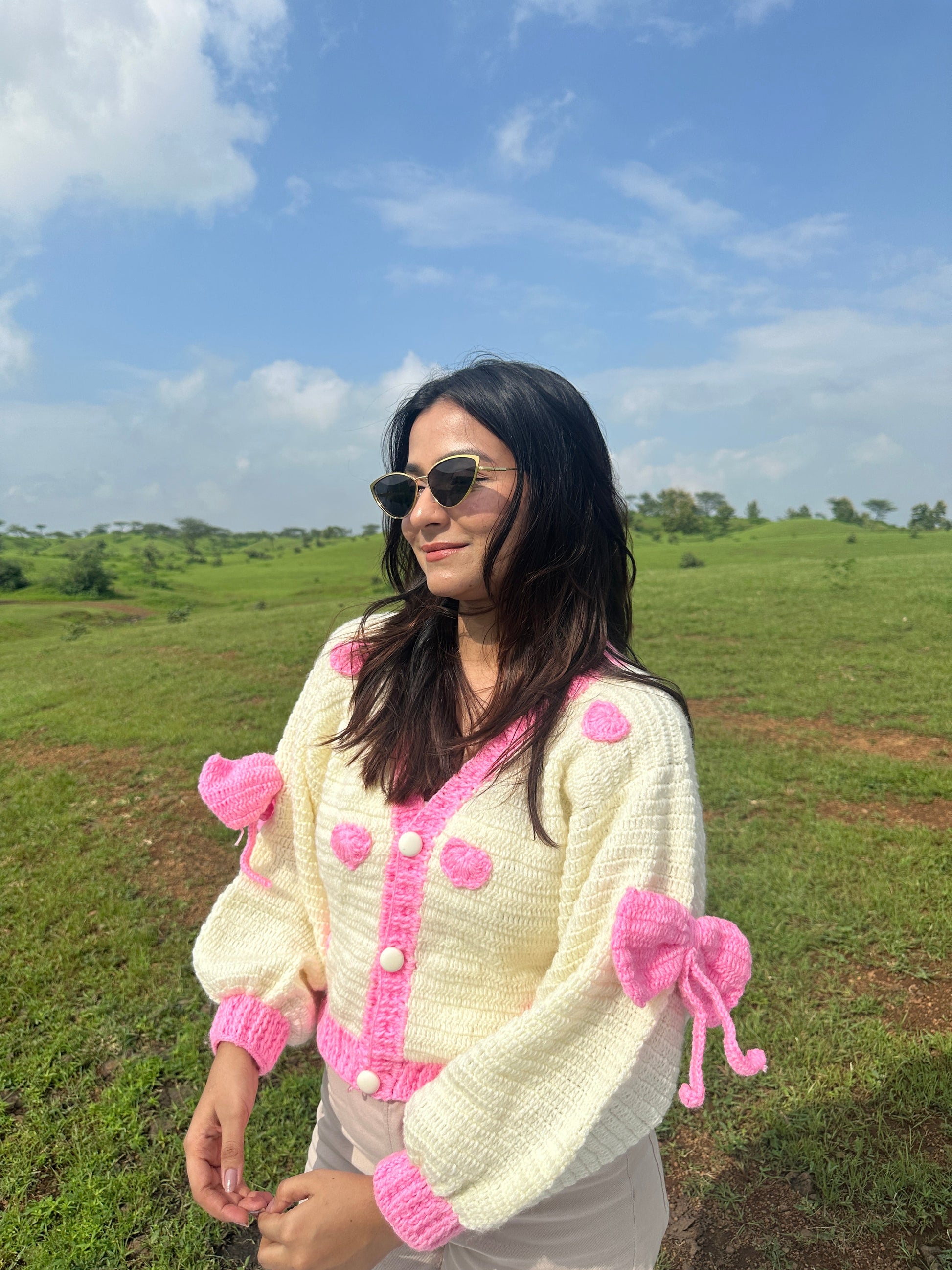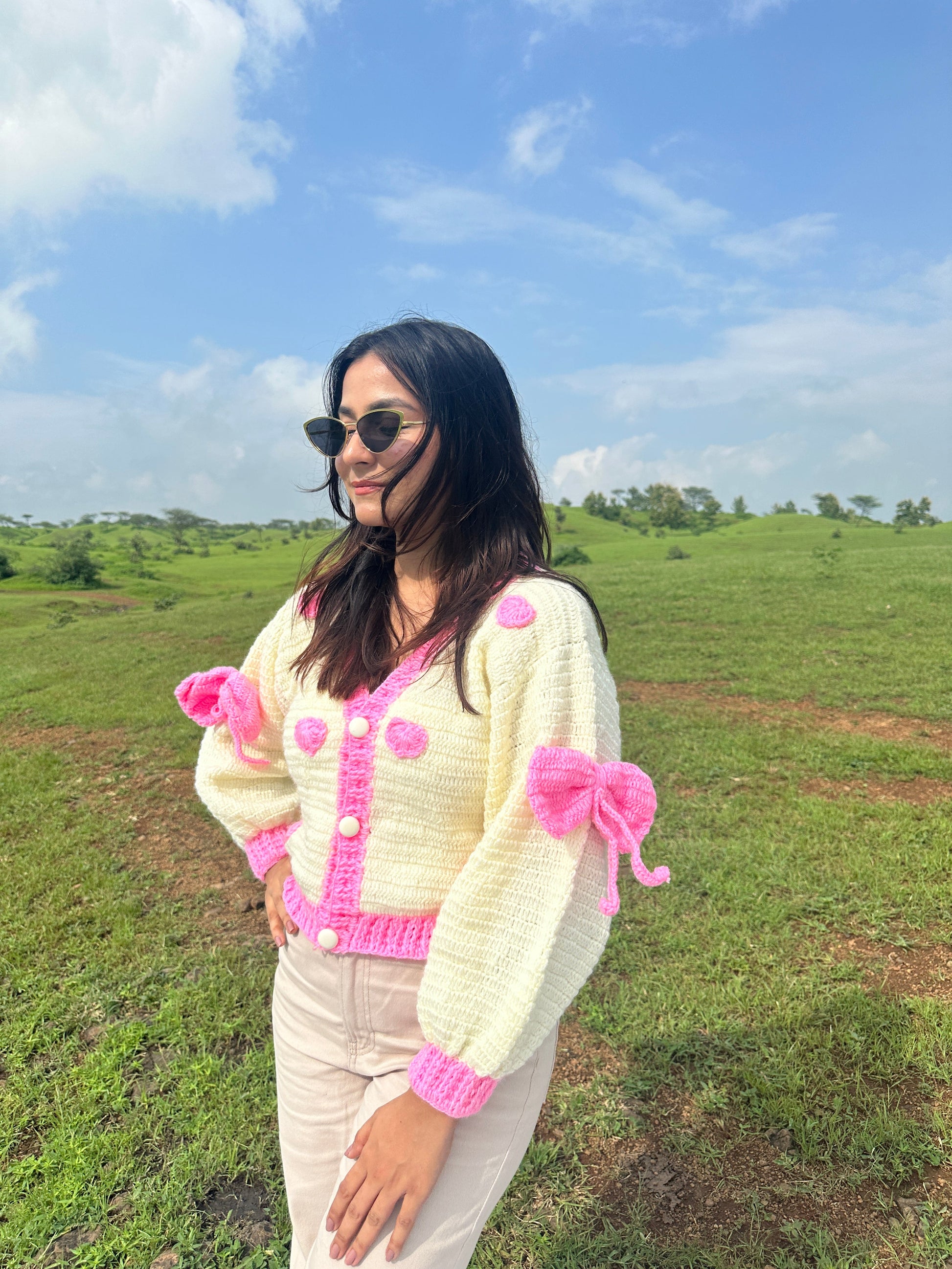 Add a touch of elegance and sweetness to your outfit with our Pink HandBow Victoria Cardigan! This lovely cardigan is designed with delicate bow details that bring a charming, feminine touch. The soft pink color adds a soft, graceful vibe, making it a beautiful choice for any occasion. Crafted from cozy, high-quality fabric, it keeps you warm and comfortable while looking stylish.