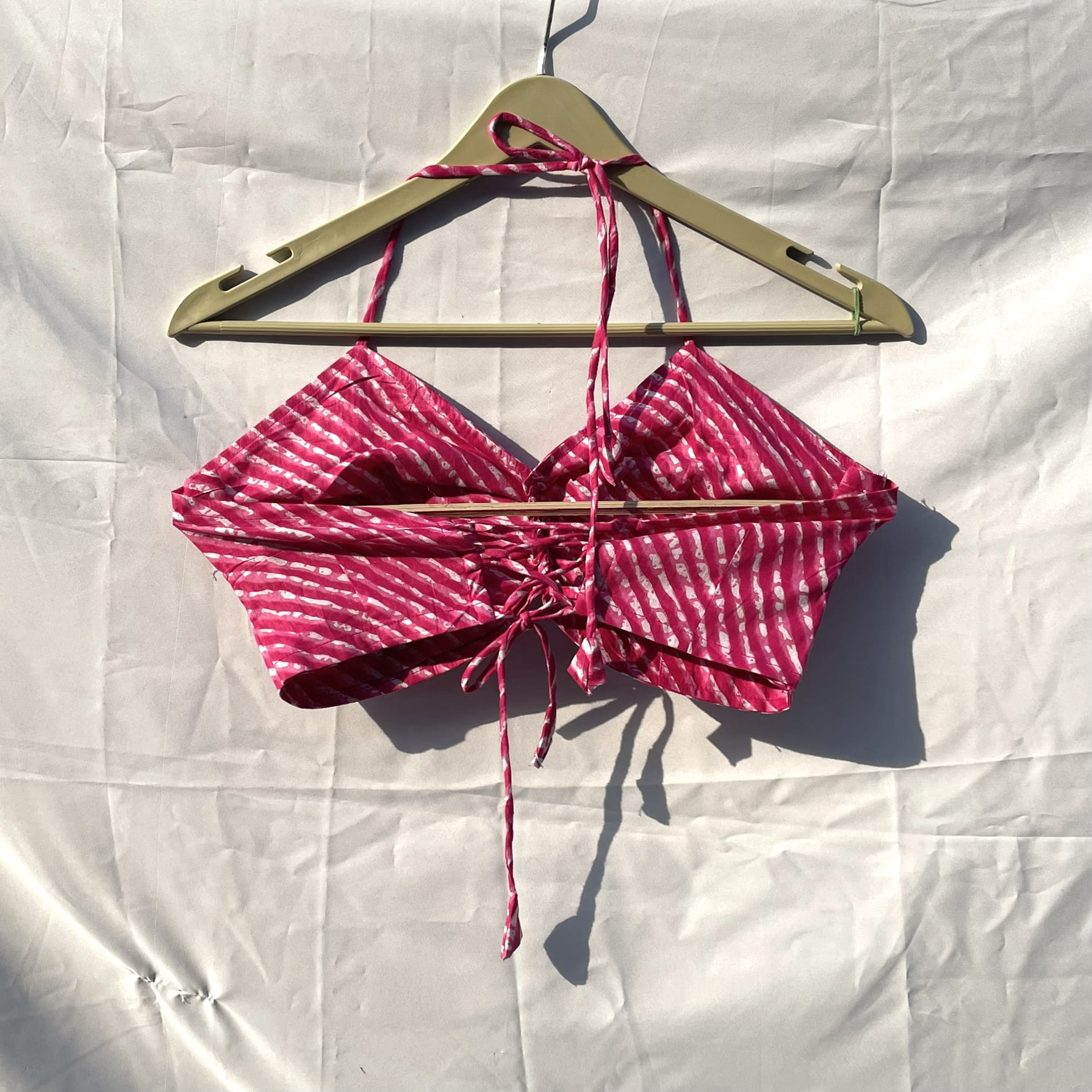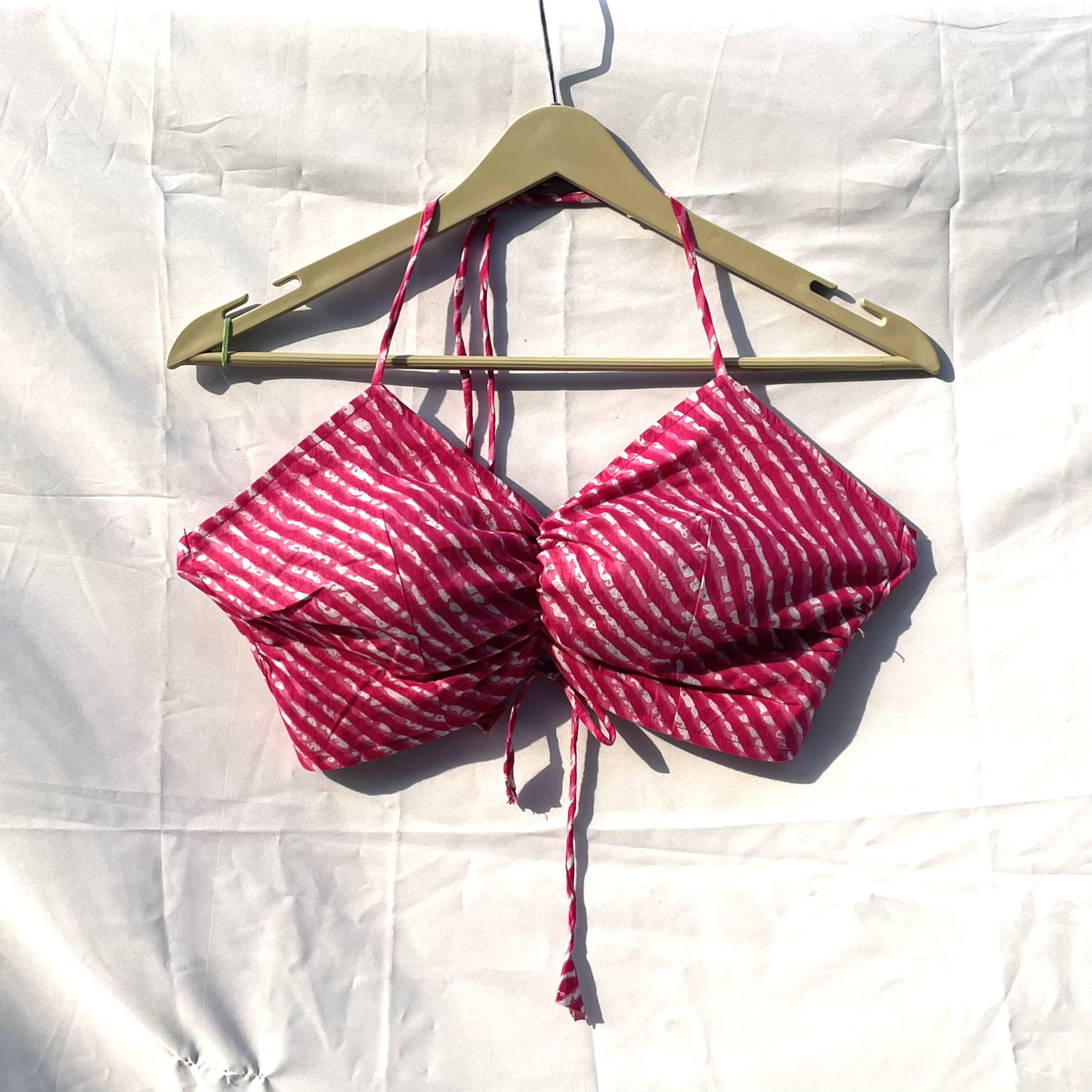 The Pink Lehariya Criss Cross Cotton bralette offers a perfect blend of traditional charm and contemporary style. Made from soft, breathable cotton, this top features the classic Lehariya pattern in a vibrant pink hue, complemented by a stylish criss-cross design that adds a touch of modern flair.