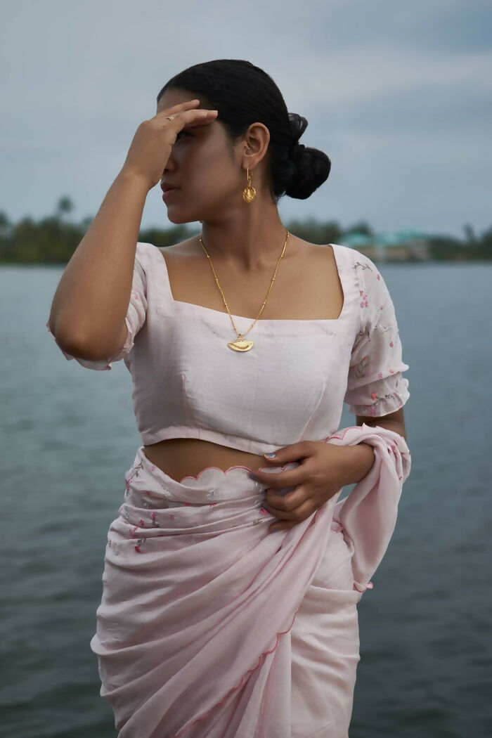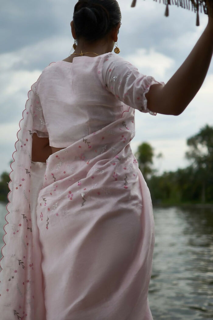 Crafted in chanderi. Sqaure neckline. Puffed sleeves and the sleeves are embroidered in same floral pattern as pink pepper sari.