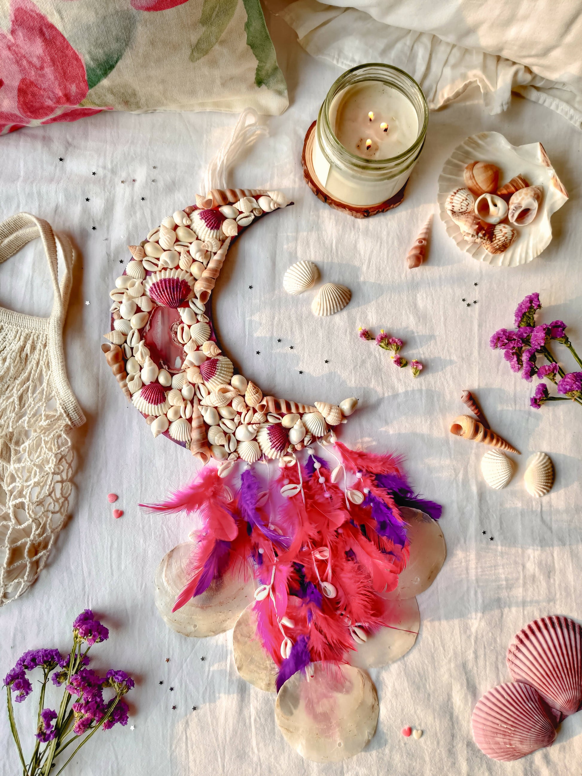 Our Moon Dreamcatcher comes with beautiful sea shells and a calming sound that will instantly lift up your space. Handcrafted by women artisans in Bombay.