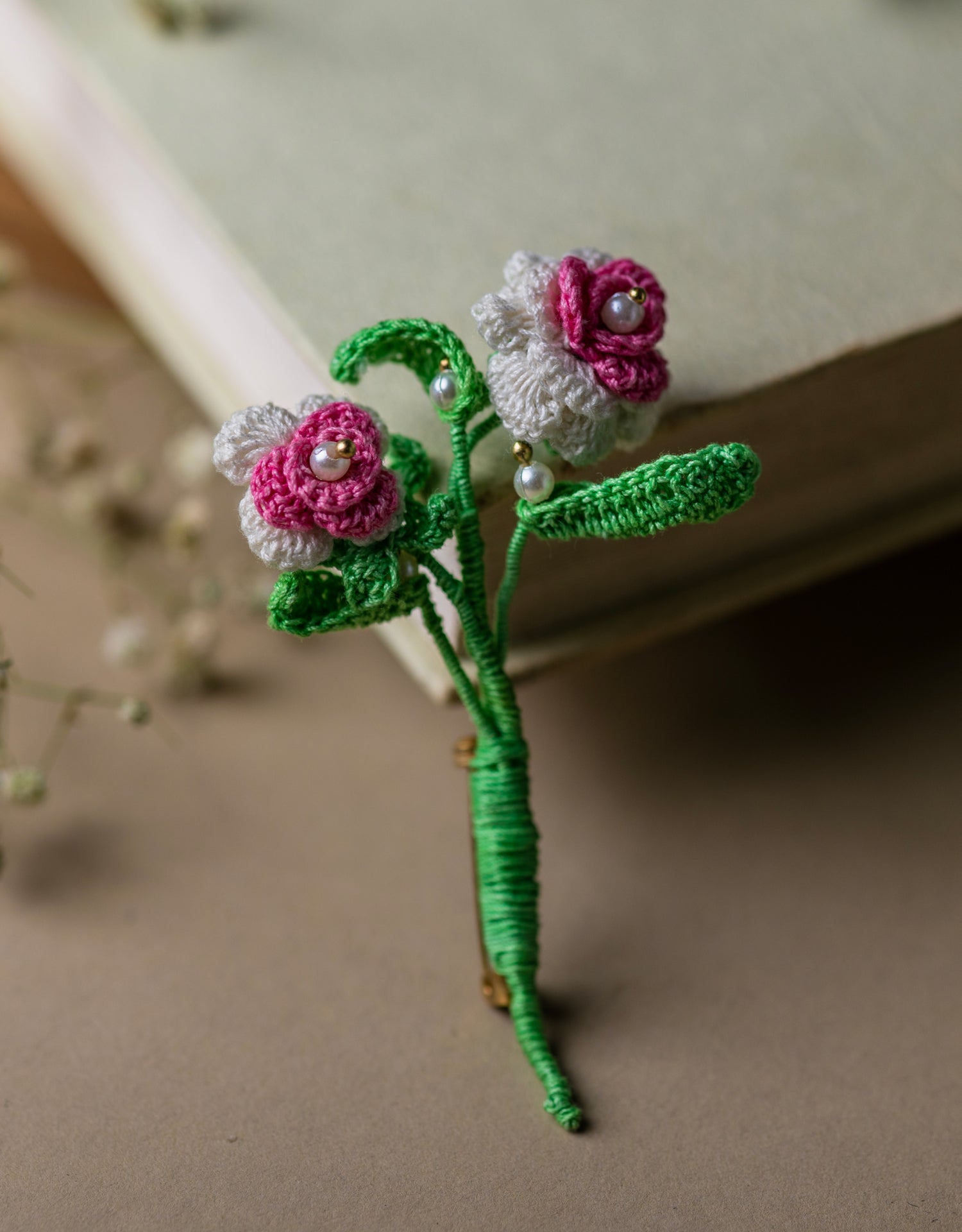 Materials: Cotton thread, Pearl moti, Brass, Brooch pin