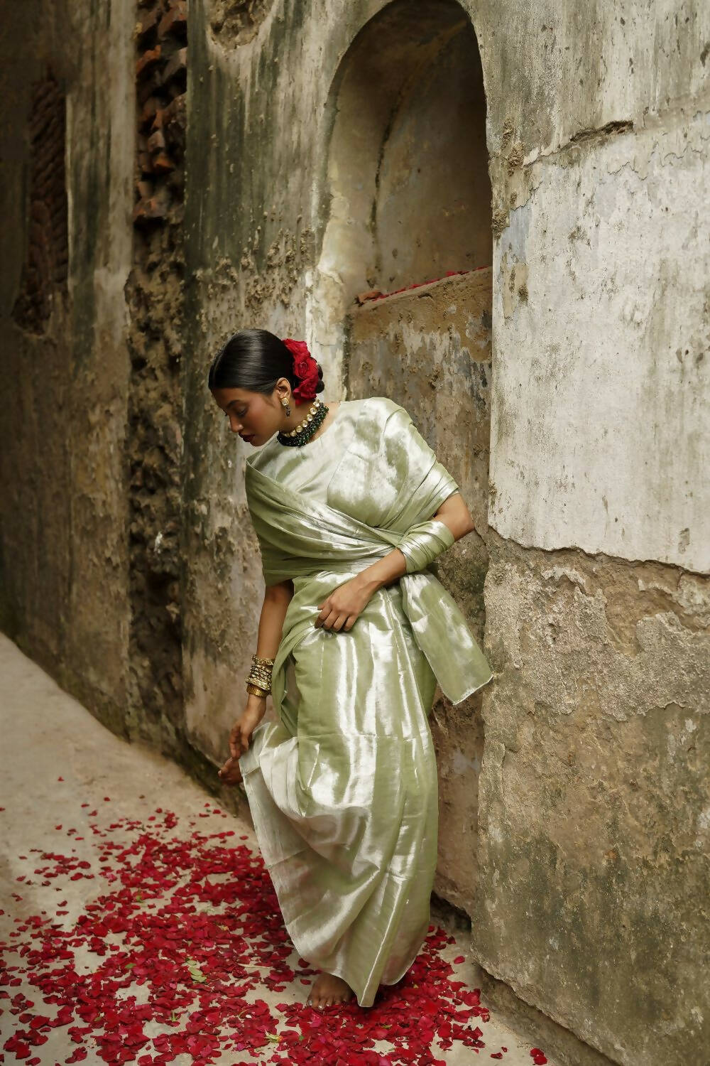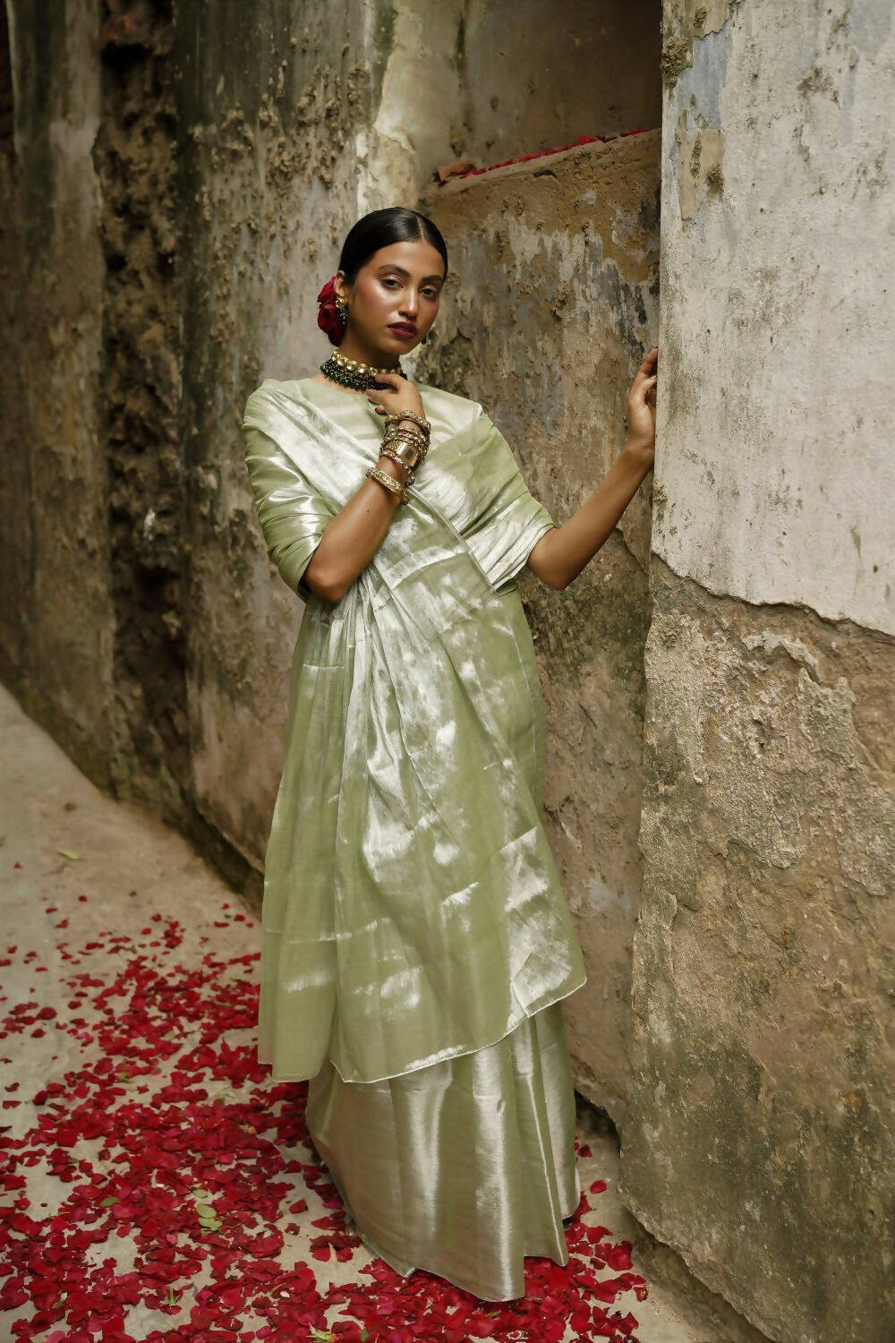Pista badam pastel handloom tissue saree is a classic and can be styled in multiple ways! Style it for a casual event or pair it with heavy jewellery for an intimate event. You can also opt for contrasting blouse to make a statement!